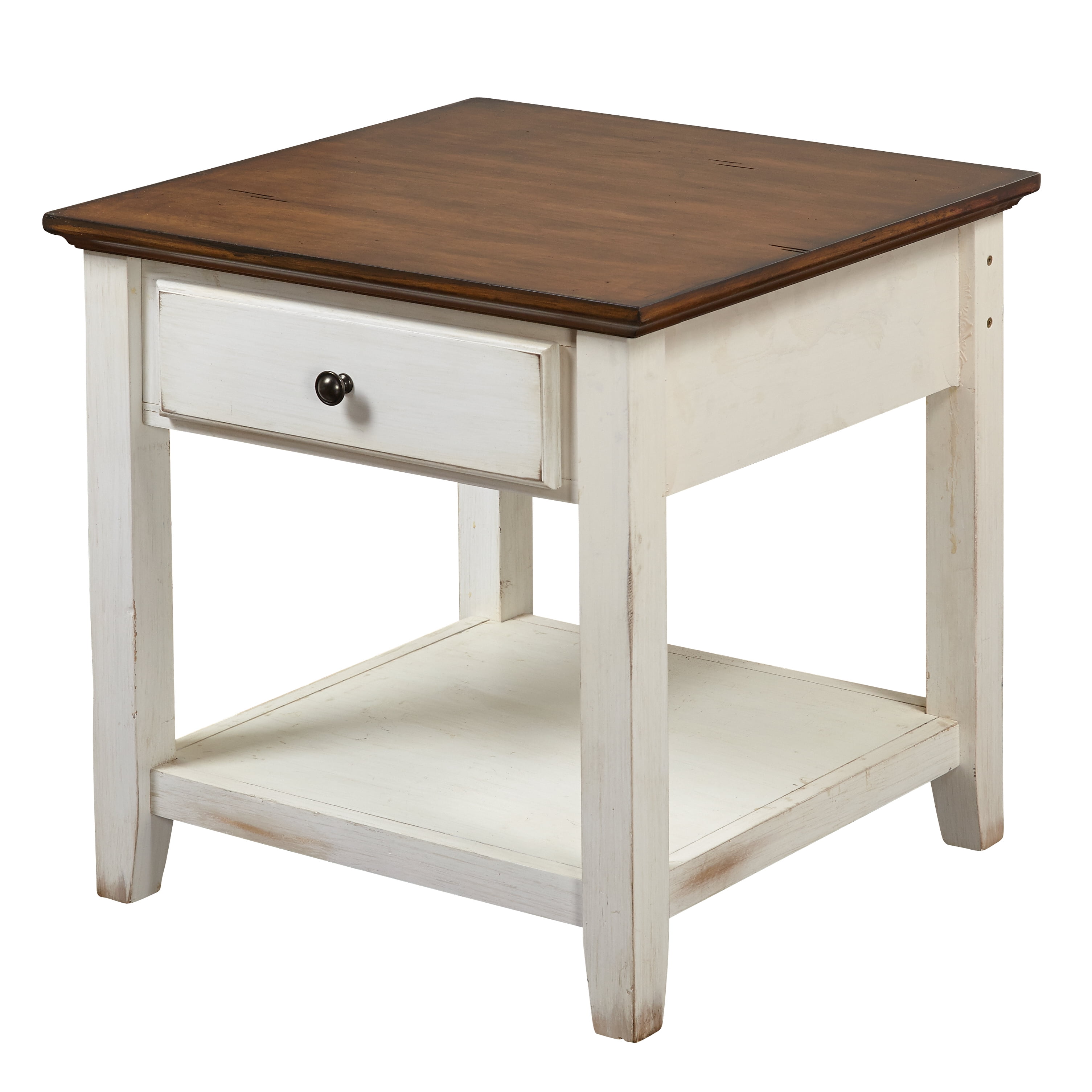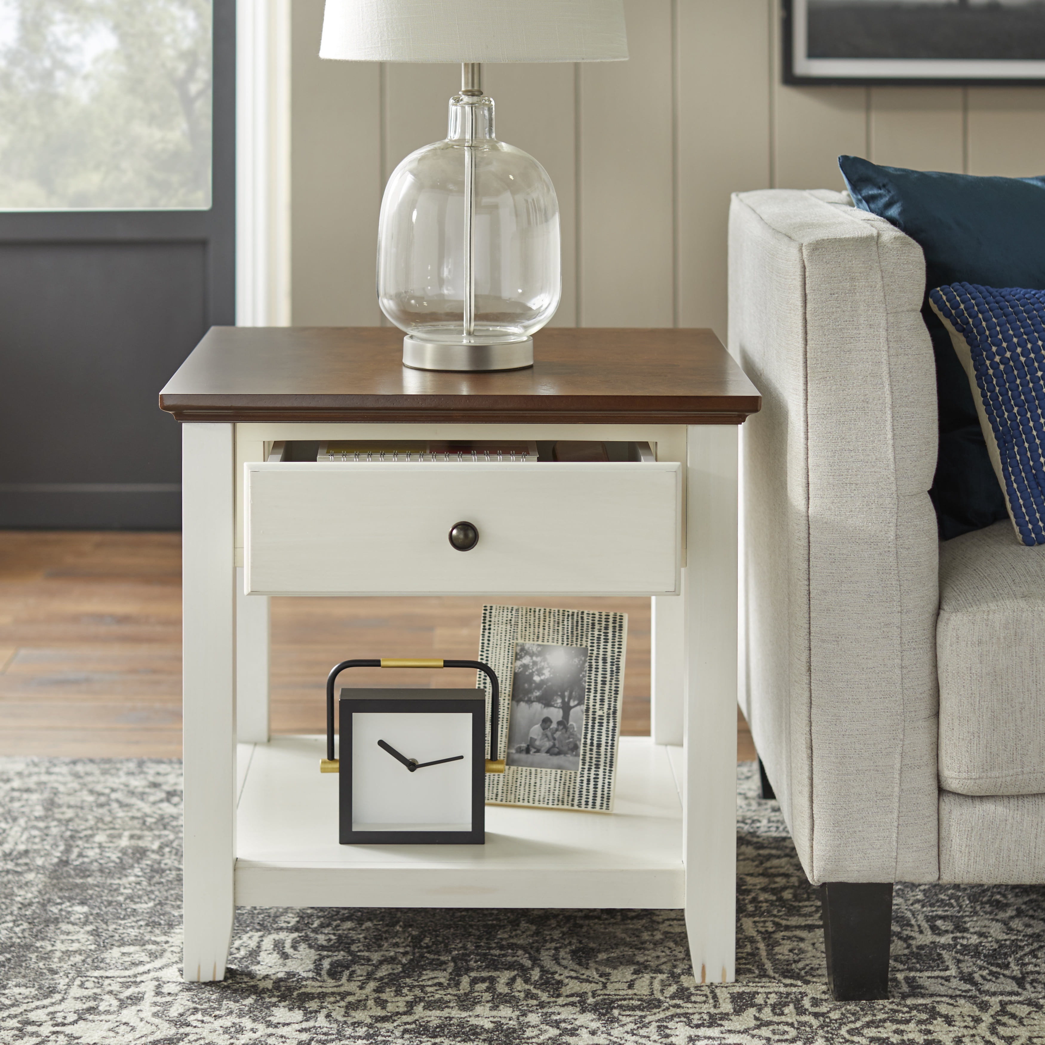Charleston End Table: This elegant Charleston End Table provides storage for magazines, books, display pictures and more for your living room Chestnut end table features a distressed chestnut top with distressed off white base looks beautiful as a centerpiece in your living room Features 1 drawer and 1 shelf Materials: solid wood legs, MDF and particle board Overall dimensions: 23.75″W x 23.75″D x 24″H Drawer dimensions: 13.75″W x 13.25″D x 2.75″H Shelf dimensions: 17.5″W x 17.6″D x 12″H Some assembly required