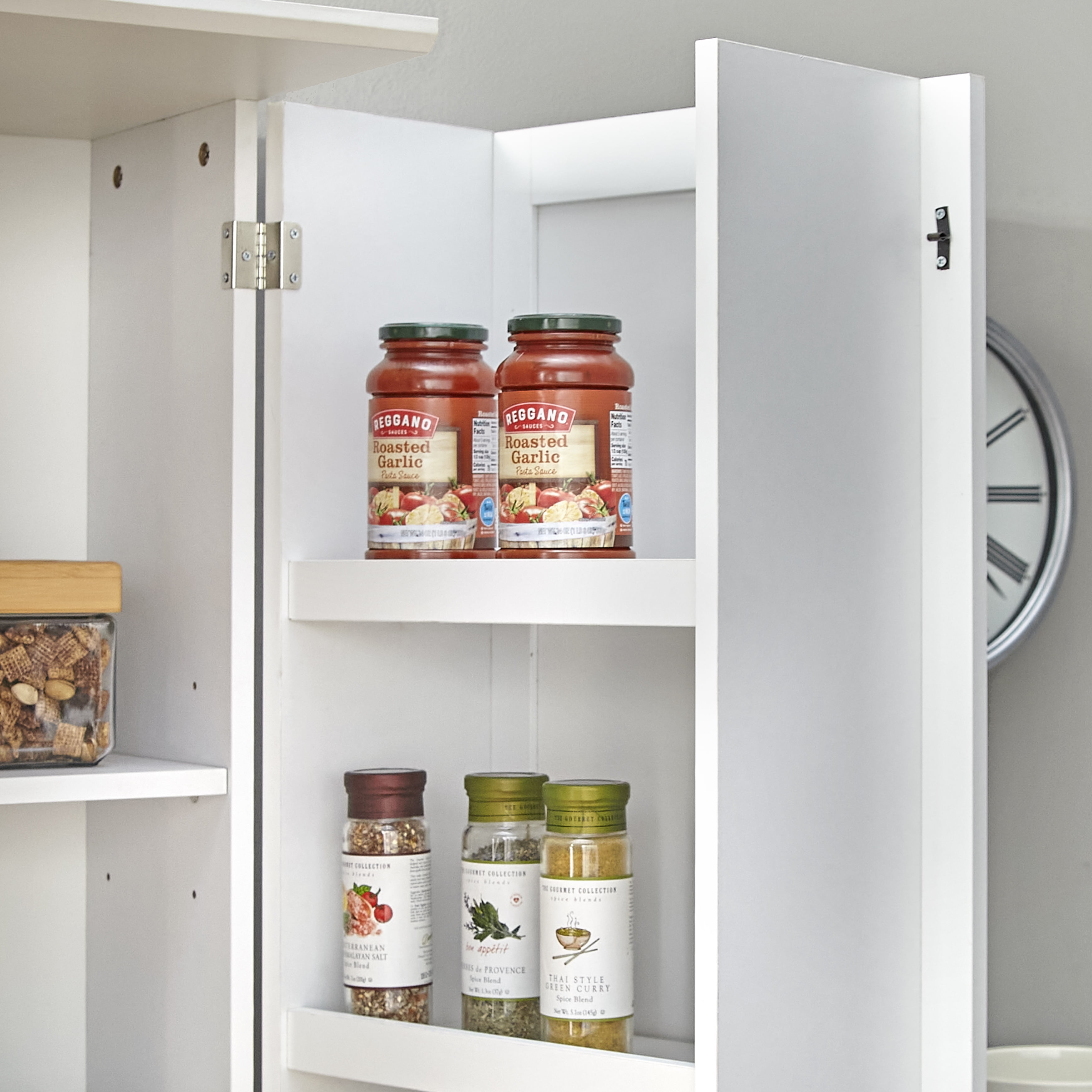 TMS Clarkson 71″ Tall Modern Farmhouse Kitchen Pantry Cabinet from TMS, White Finish: Includes: One (1) tall kitchen/dining space pantry Modern farmhouse style Features added storage built into the right-hand side door Adjustable shelves enable storage of various sized items. Constructed of durable particleboard White finish Ships in two (2) cartons Assembly required Overall dimensions: 71.25 inches high x 35.25 inches wide x 17 inches deep