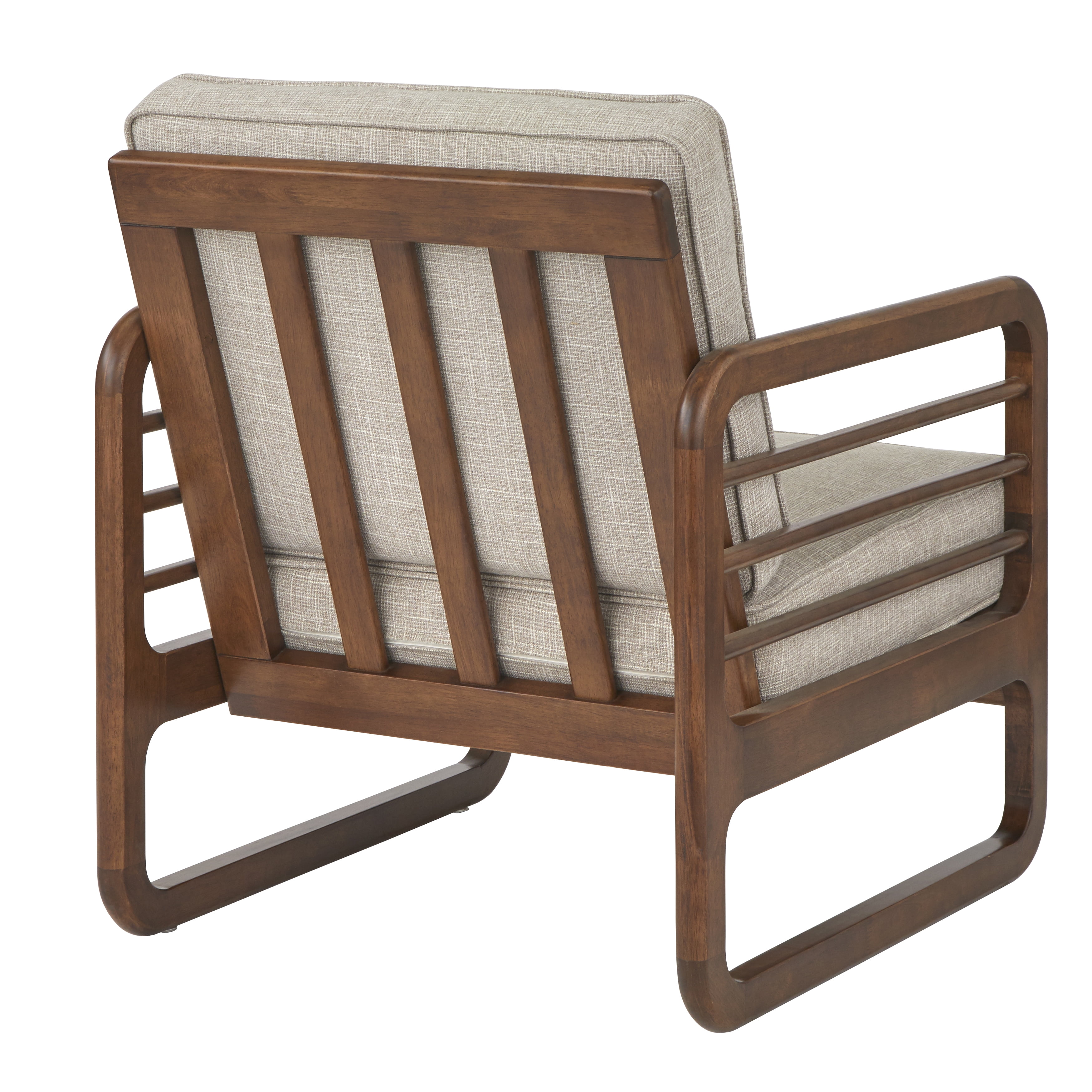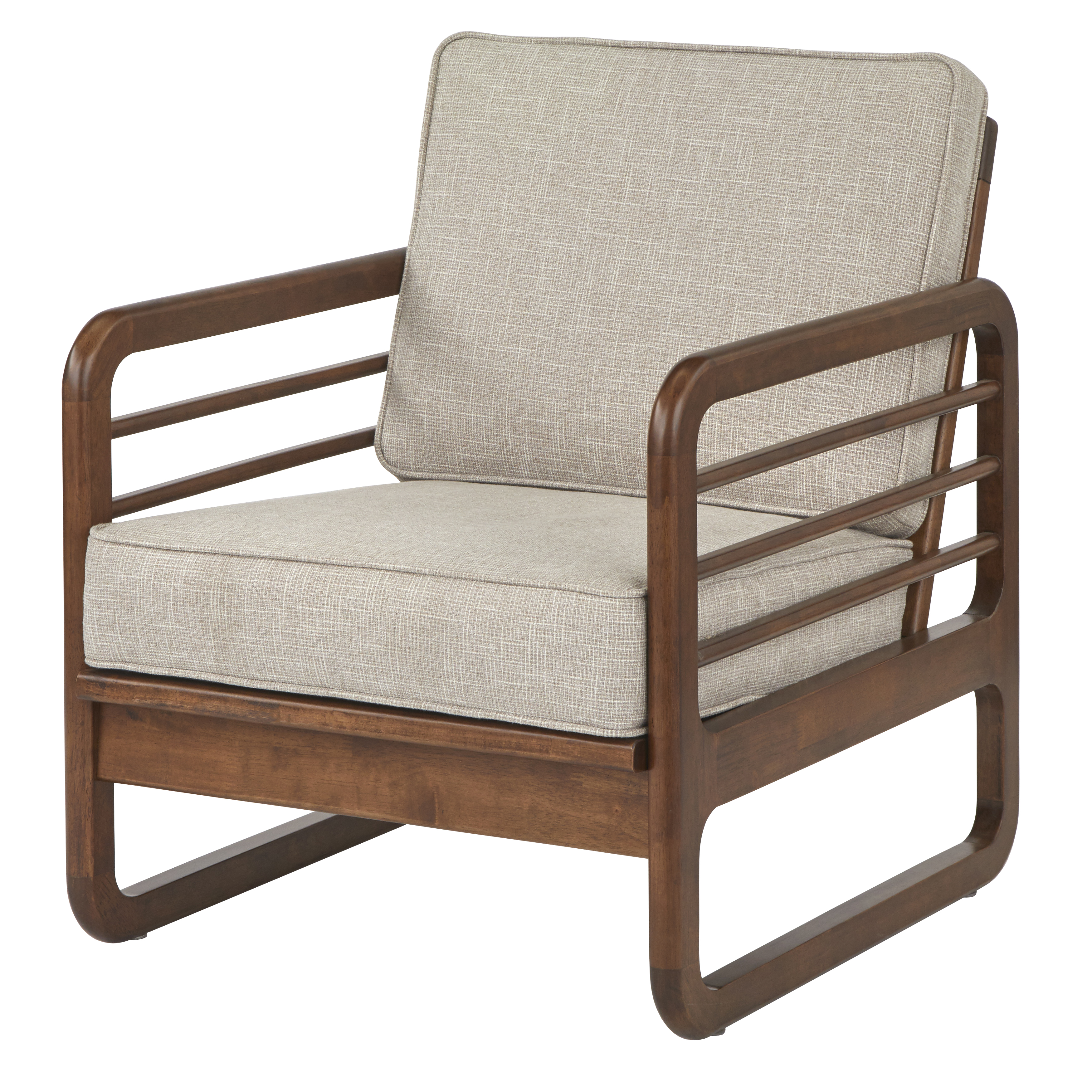 Includes: one (1) contemporary style chair Removeable and reversible cushions Styled with slatted wood arms and back Constructed of solid Rubberwood, fabric and foam Upholstered in a Latte Brown Linen-like fabric Rich walnut frame finish Ships in one (1) carton, assembly required Chair overall dimensions: 30.3 inches high x 26 inches wide x 30.5 inches deep Chair seat dimensions: 18.1 inches high x 23.5 inches wide x 24 inches deep