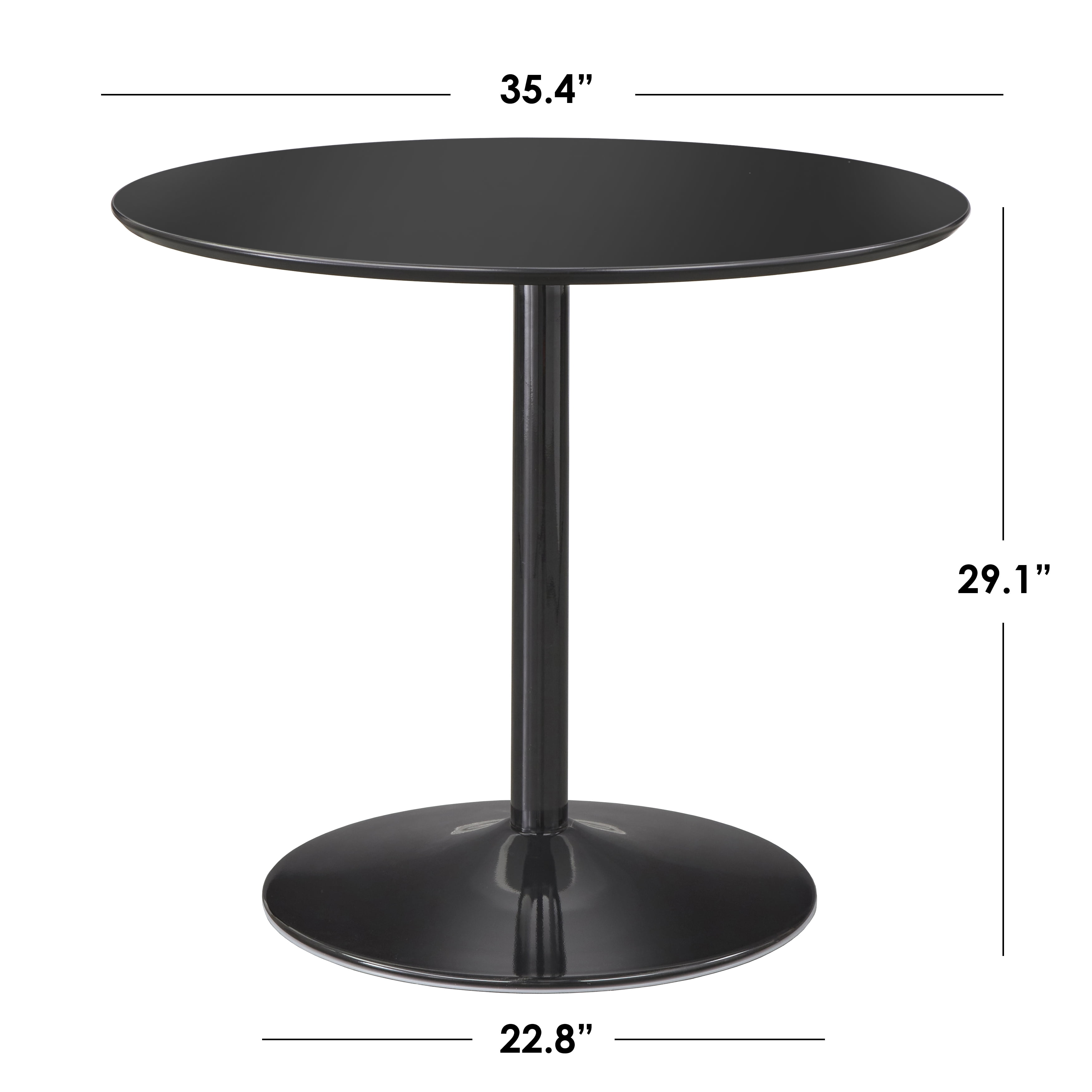 Round, metal base dining table features chrome elements Seats up to 4 chairs (sold separately) Available in Black, White, Chrome/Black, Chrome/Clear Glass, Chrome/Espresso, and Gold/White Materials: Laminated MDF table top, Table Dimensions: 35.4″ x 35.4″ x 29.1″H Assembly required Ships in 1 box Simple and elegant retro design For indoor use only