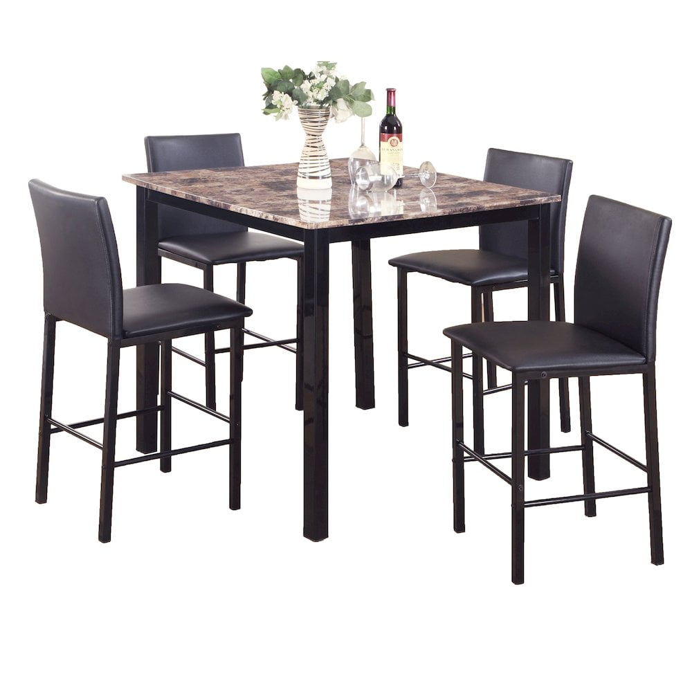 Crafted to complement the decor of virtually any small dining space with Mid-Century flair, the Gino five-piece dining set comes with four chairs and a round dining table. The chairs are curved to conveniently tuck right under the table. Featuring a fresh walnut finish and brown faux leather upholstered seats. This set is constructed of sturdy Rubberwood, MDF and veneer for increased durability. Set includes one (1) table and four (4) chairs.
