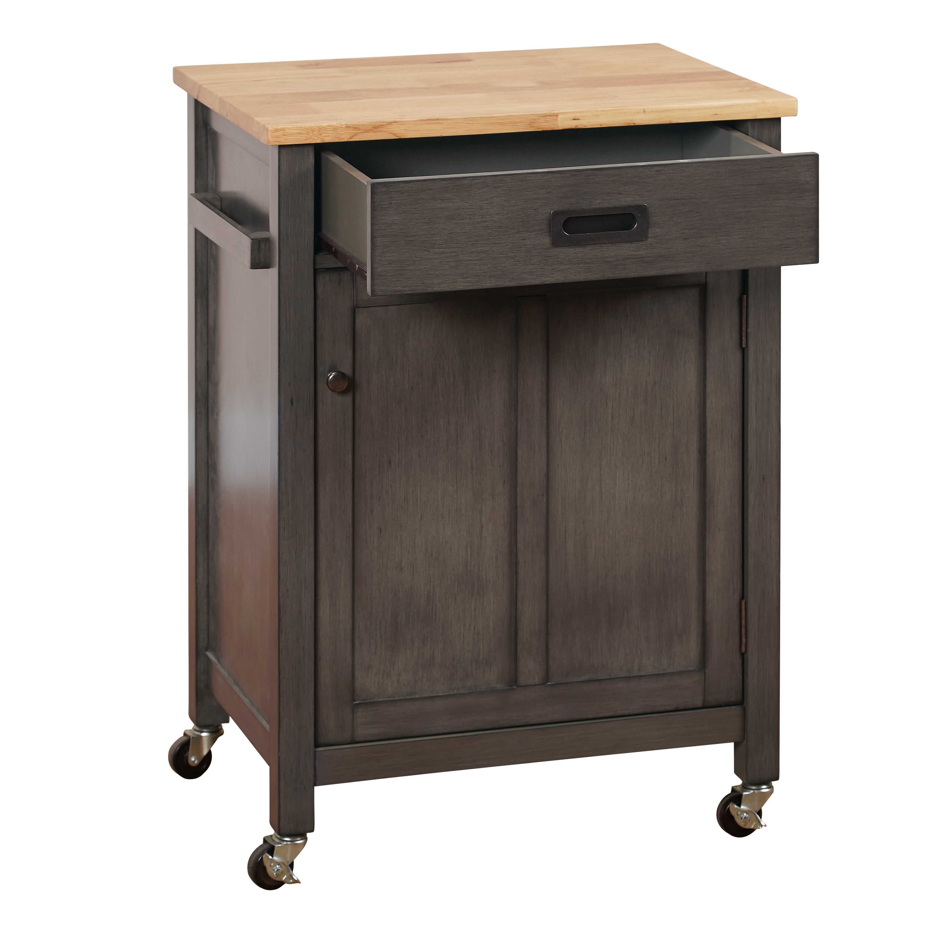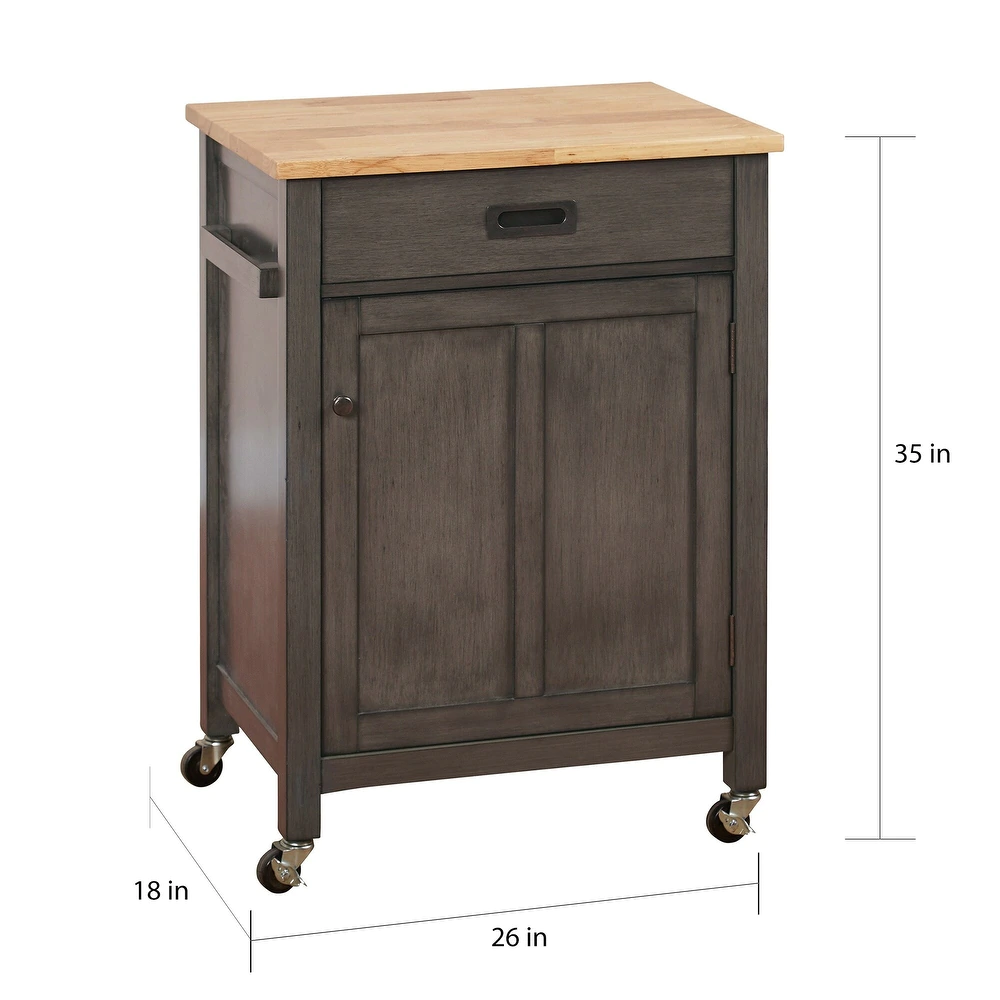 Includes One (1) Kitchen Cart Features: One (1) drawer and one (1) cabinet One (1) adjustable shelf behind the door Castors for mobility–two (2) are locking Crafted of MDF with a solid rubberwood top Weathered gray finish Drawer dimension: 13.25″ D x 17.25″ W x 3.3″ H Cabinet dimension: 15.8″ D x 20.75″ W x 21.3″ H Overall Dimension: 18″ D x 24″ W x 34.25″ H Assembly required Product Weight: 50 lbs