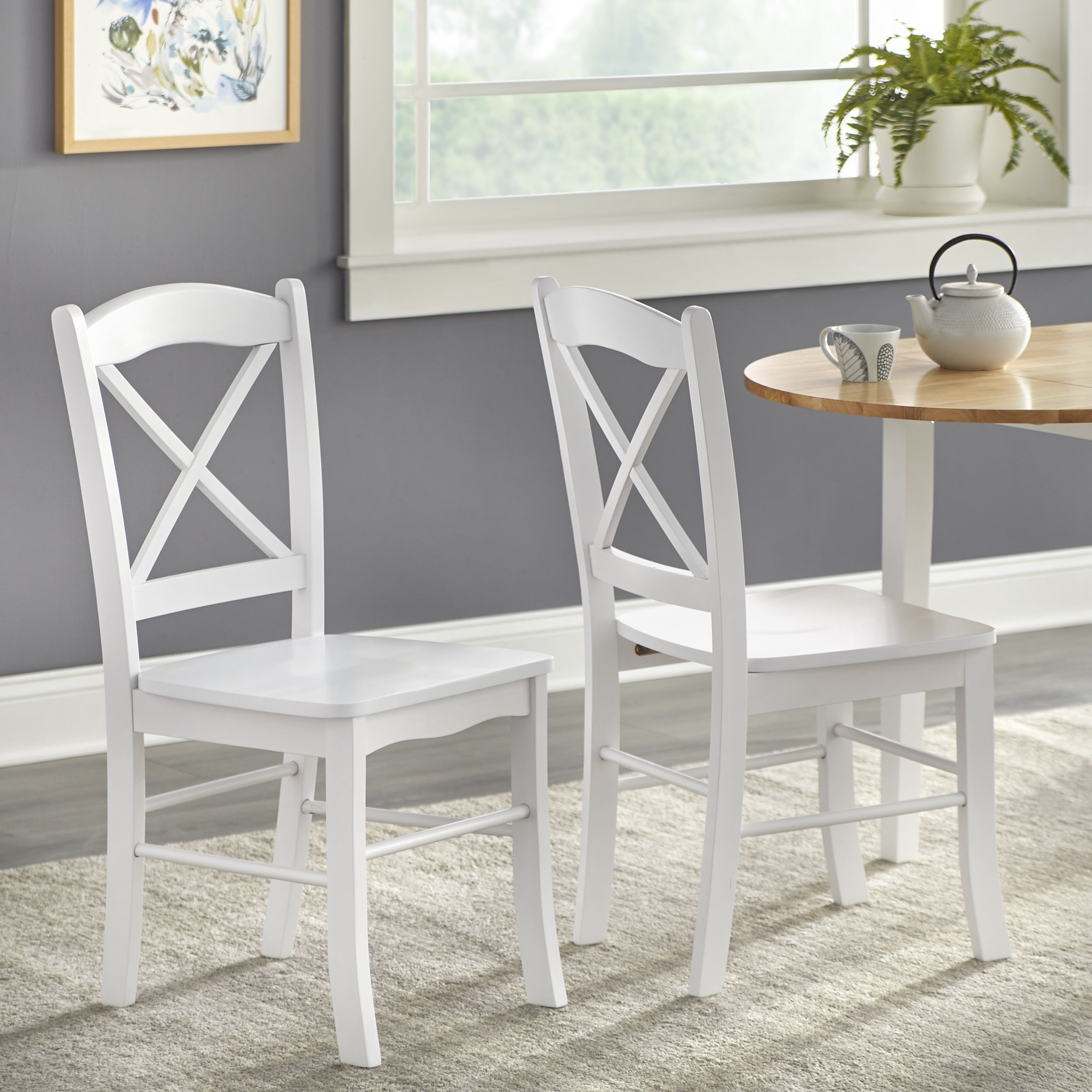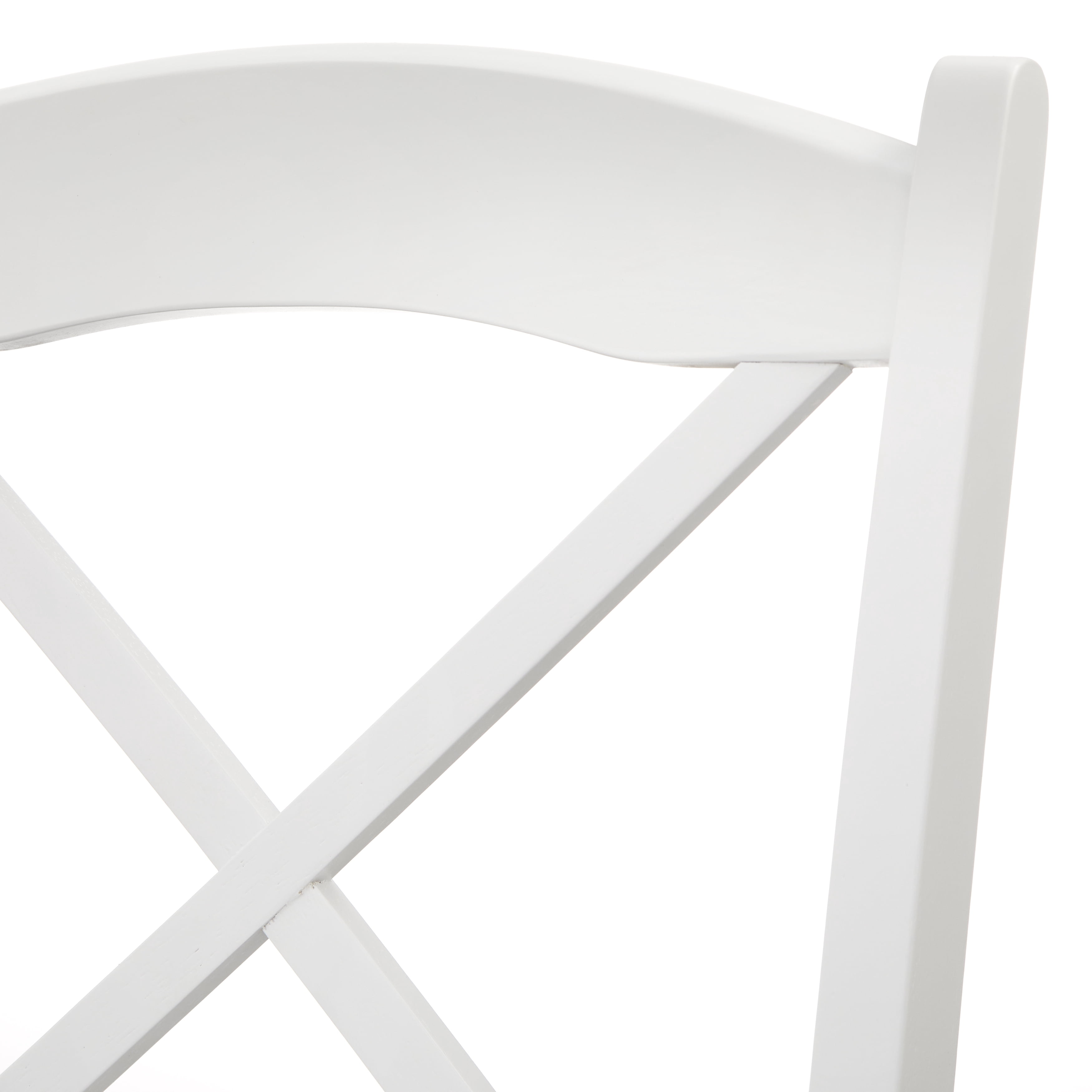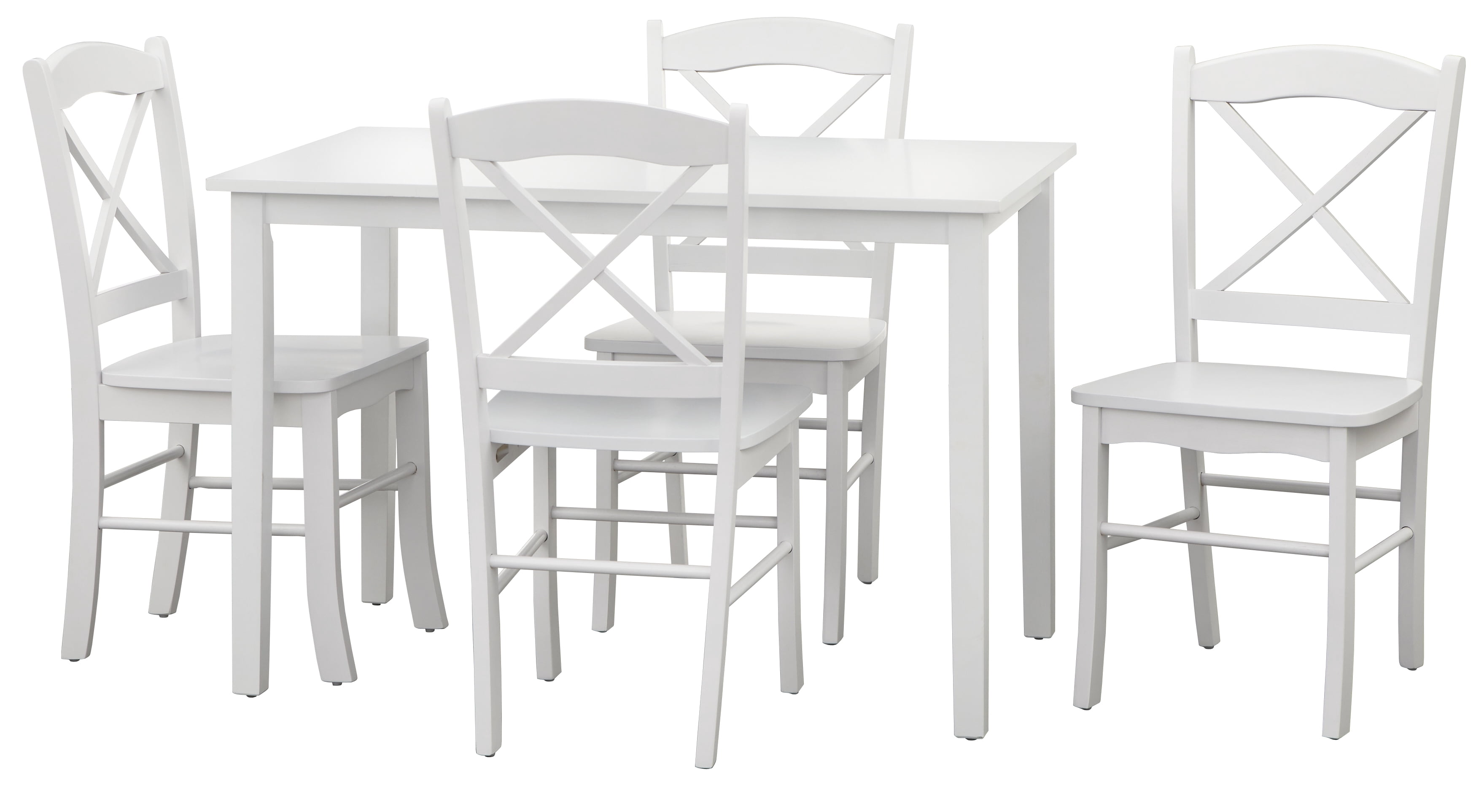 Features one table and four cross back chairs White finish Overall table dimensions : 45 inches length x 28 “W x 29 “H Over chair dimensions : 17.5 inches length x 19.75 “W x 35 “H Some assembly required Ships in 3 boxes For indoor use only