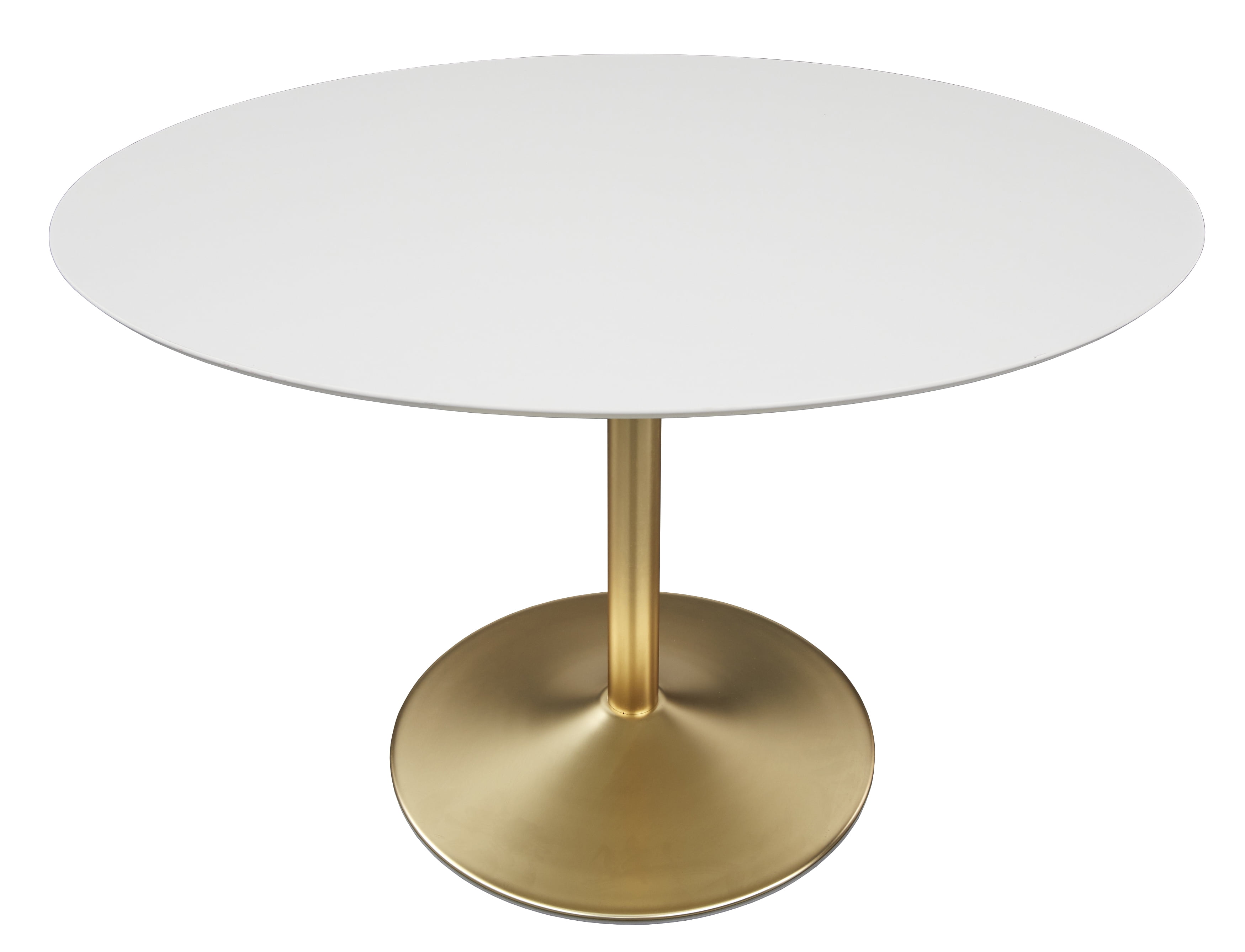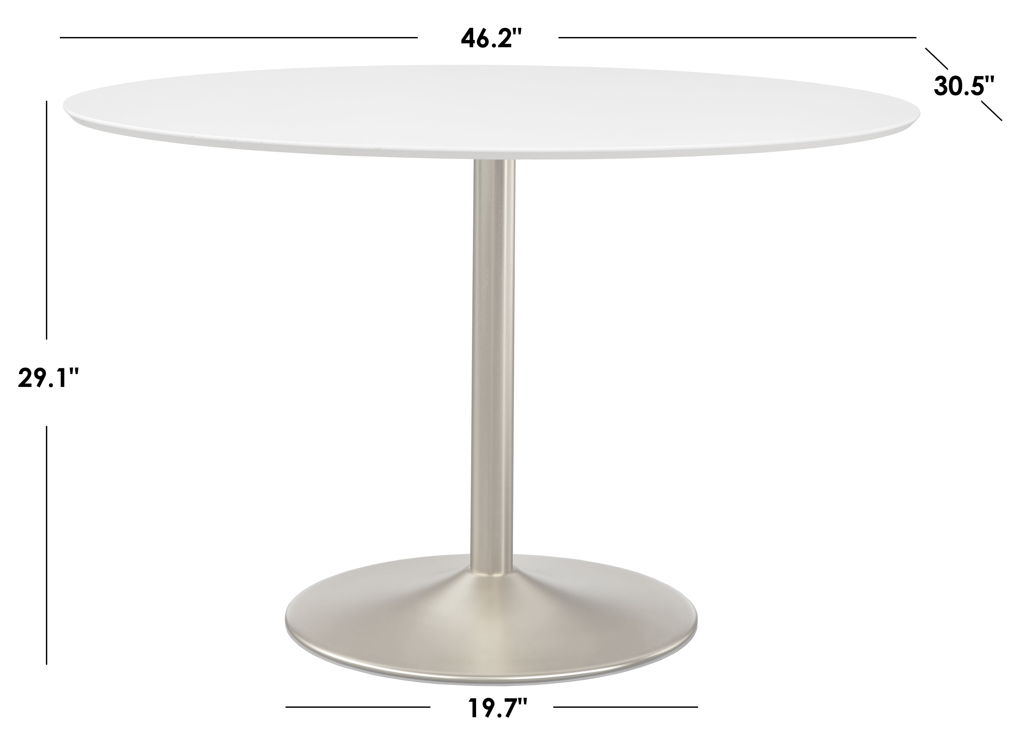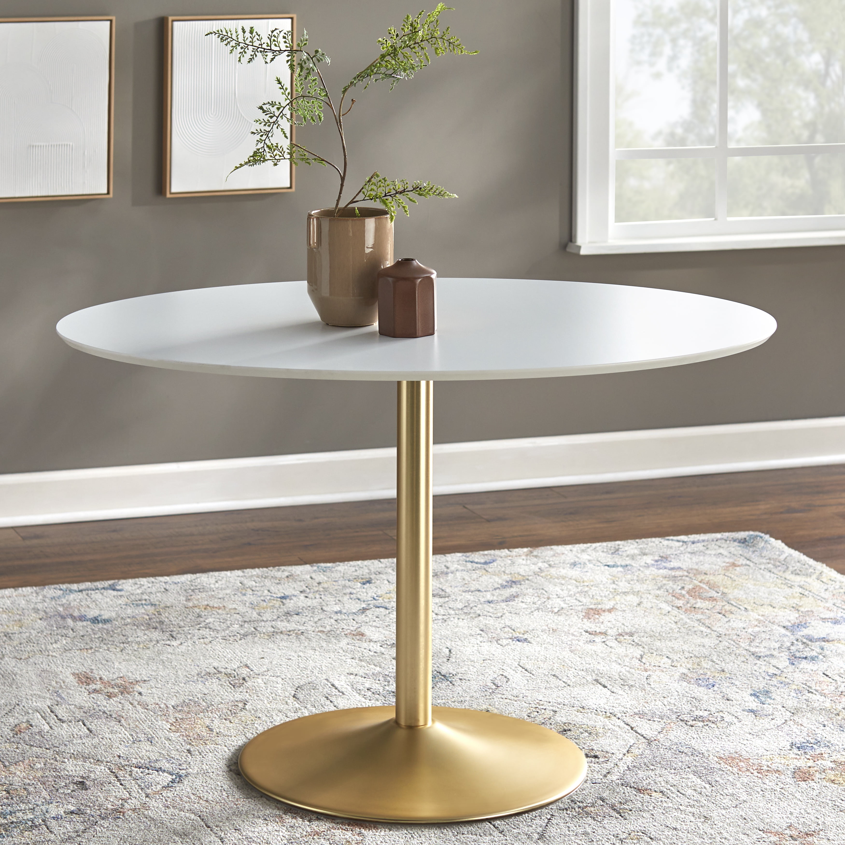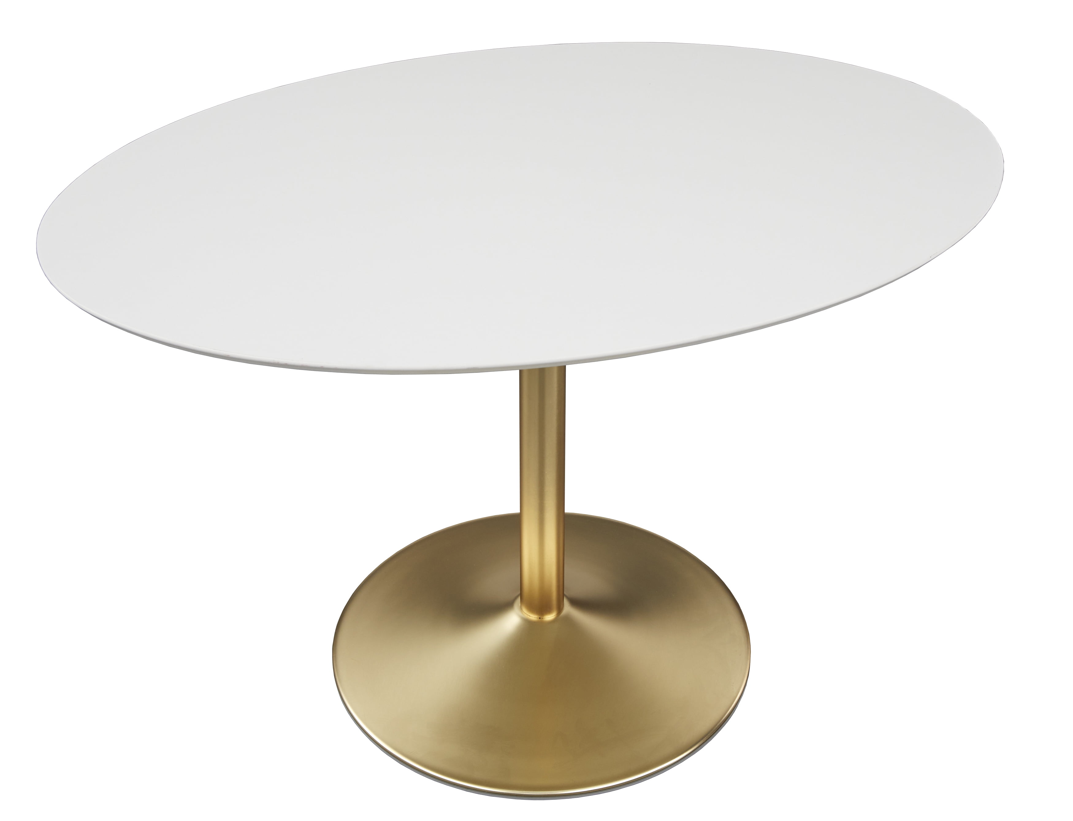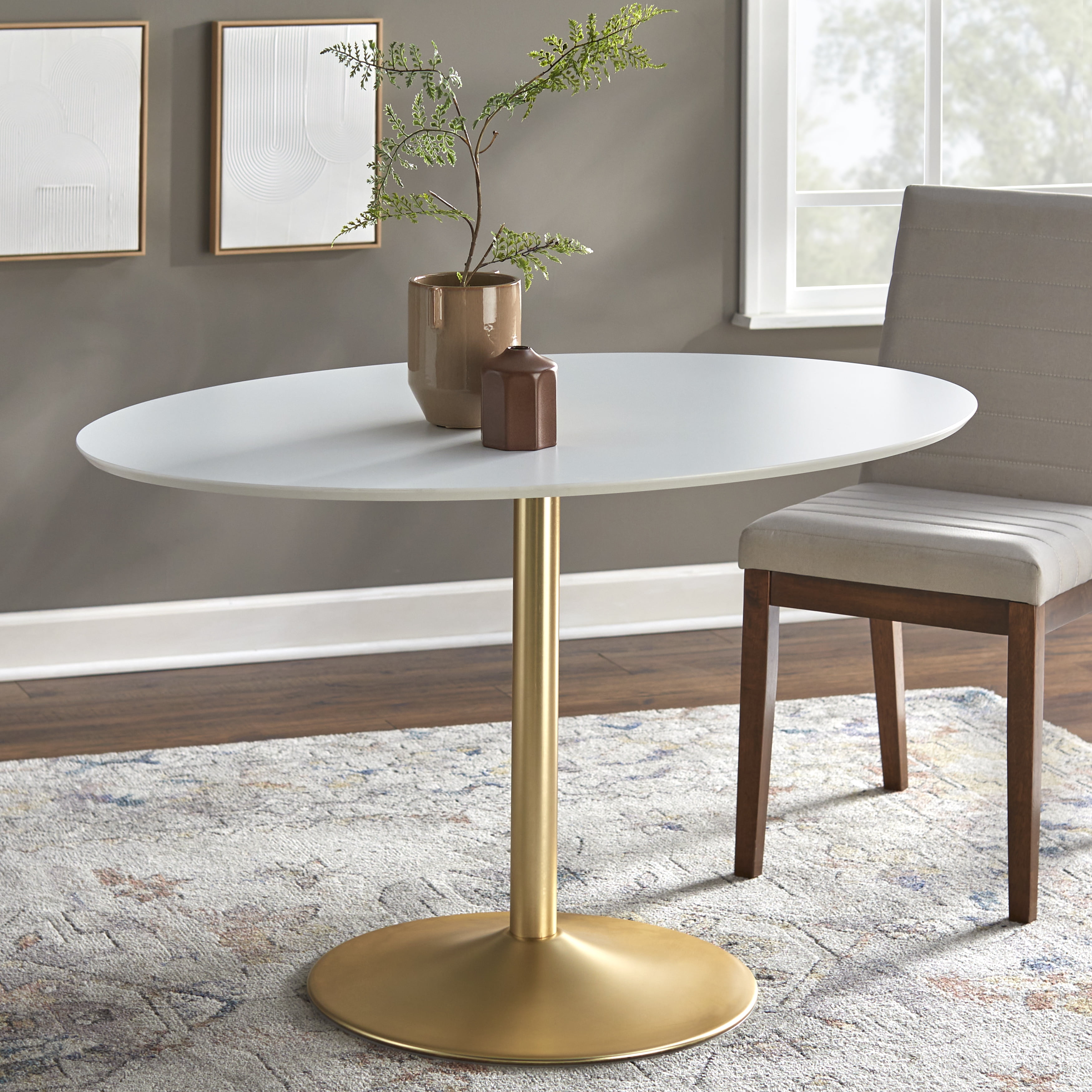 Includes: one (1) oval dining table Contemporary style with a glam flair Features an oval shape tabletop Pedestal base Assembly required Constructed of MDF tabletop and metal base White tabletop with gold-tone finished base Ships in one (1) carton Overall dimensions: 29.1 inches height x 46.2 inches length x 30.5 inches width Dimension of base: 19.7 inches diameter Top weight capacity: 150 lbs