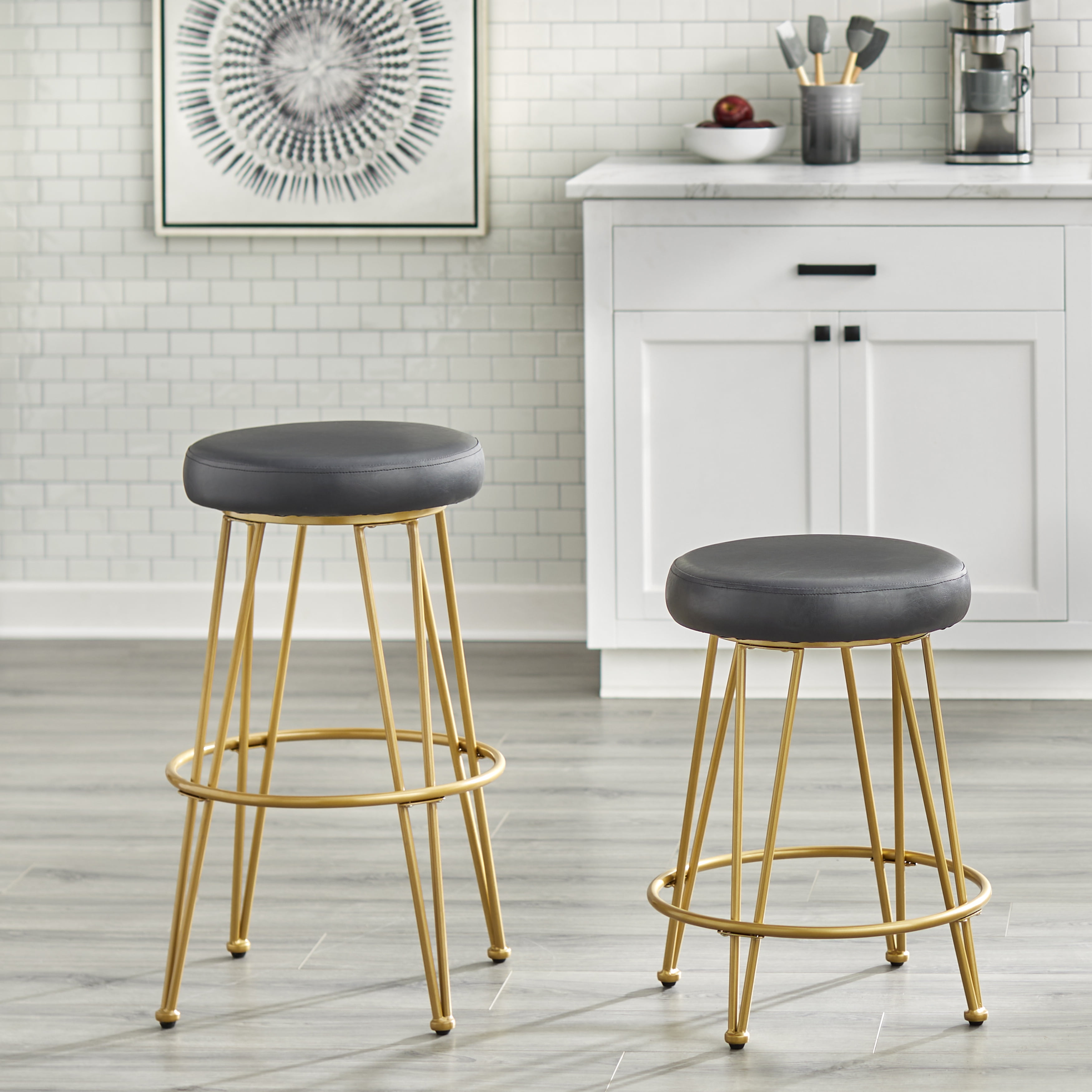 TMS Magnus Bar 24” High Backless Counter Stool, Set of 2, Black Faux Leather Seat/Gold Metal Frame