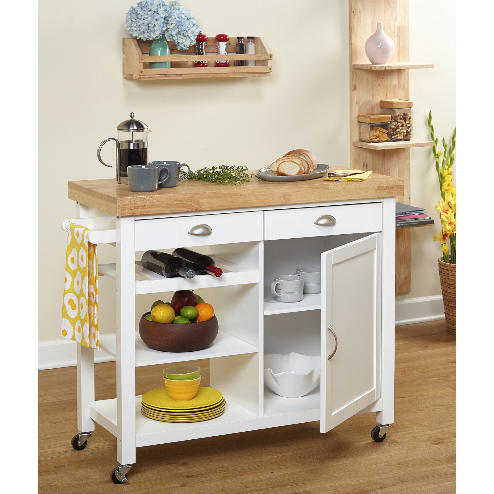 TMS Martha Butcher Block Rolling Kitchen Island with Cabinet, Drawers, Shelves, and Towel Rack, White