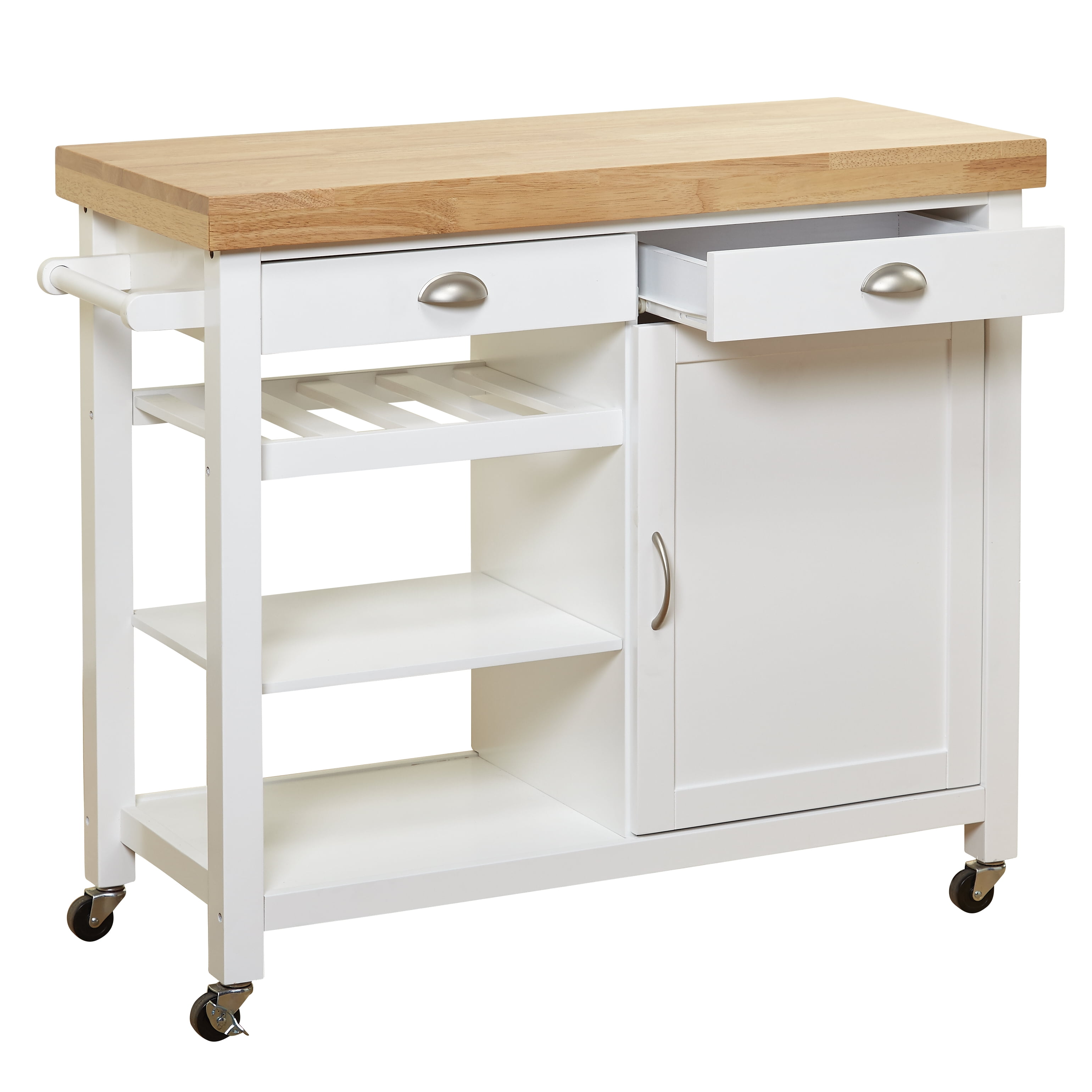 A butcher block style top gives the Martha Butcher Block Rolling Kitchen Island its farmhouse charm. Your choice of available finish color customizes the base of this kitchen island cart. Practical storage features include two drawers with cup pulls, one slatted wine rack; and two solid fixed shelves. A cupboard with additional shelf inside offer tucked away storage. A towel bar that doubles as a handle and locking casters mean you can use this kitchen island as a mobile bar cart. Overall Product Dimensions: 41.5L x 17.75W x 36H in. Product Weight: 86 lbs.
