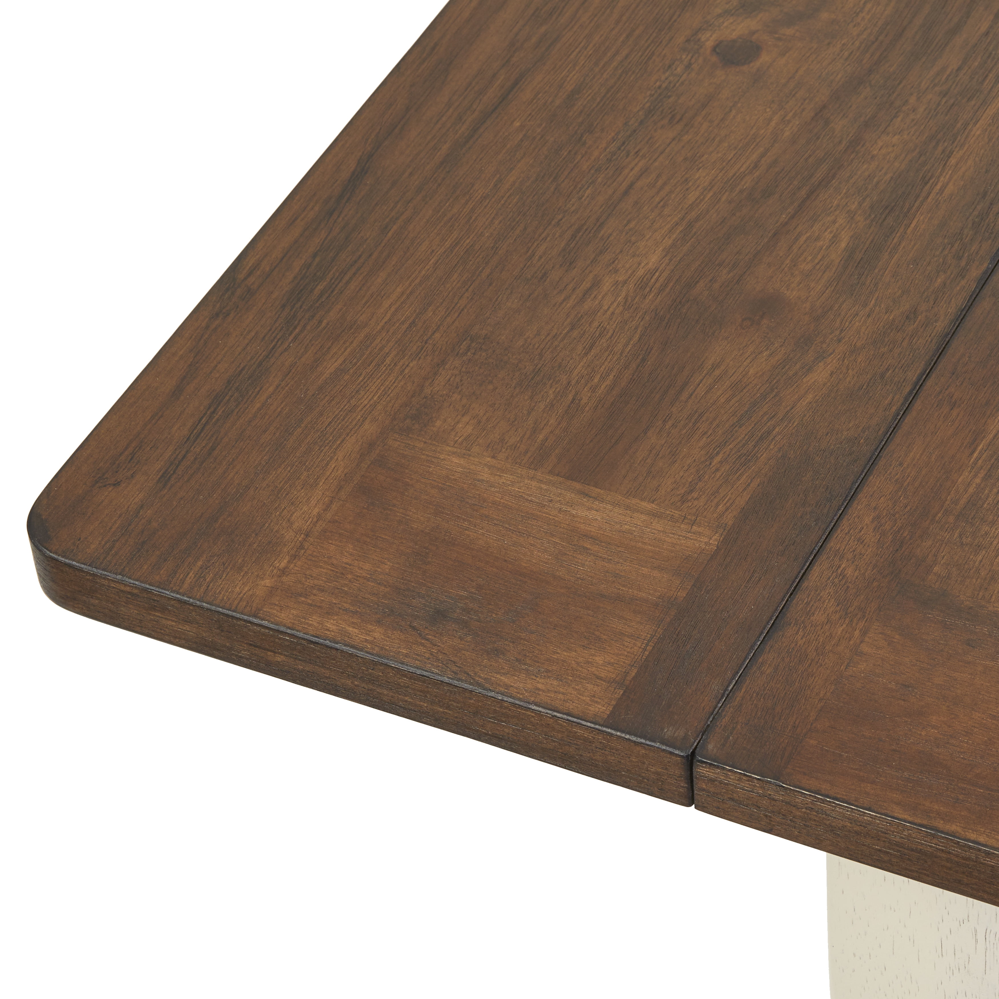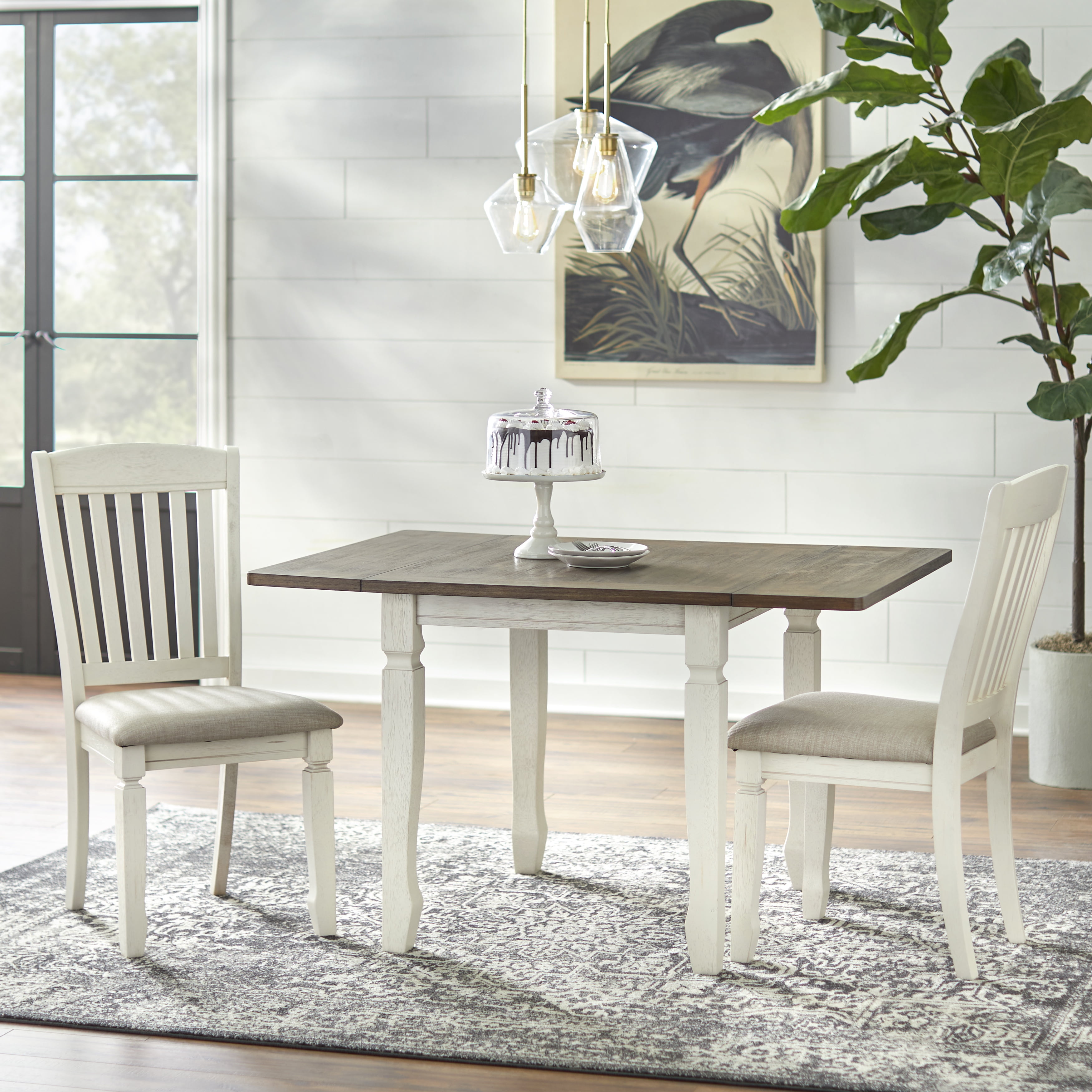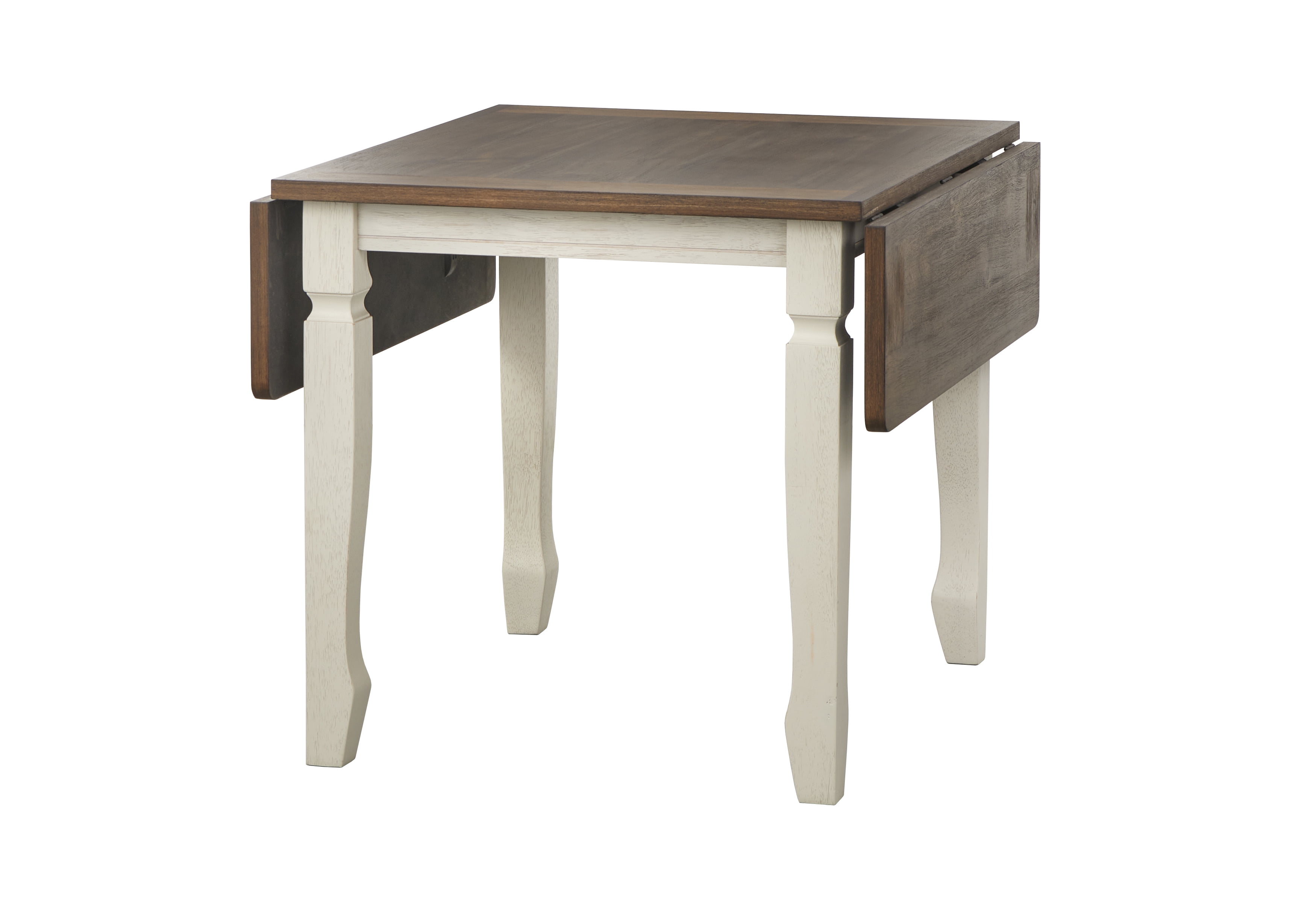 Includes: One (1) drop leaf dining table Modern farmhouse design with an inviting two-tone finish Tabletop is constructed of MDF with Veneer and solid Rubberwood legs Skillfully carved table legs Warm Walnut finished top with Antique White finish legs Ships in one (1) carton, assembly required Table overall dimension: 30 “H x 30-50 inches long x 36 “D Drop leaves (2) dimension: 10 inches long For indoor use only