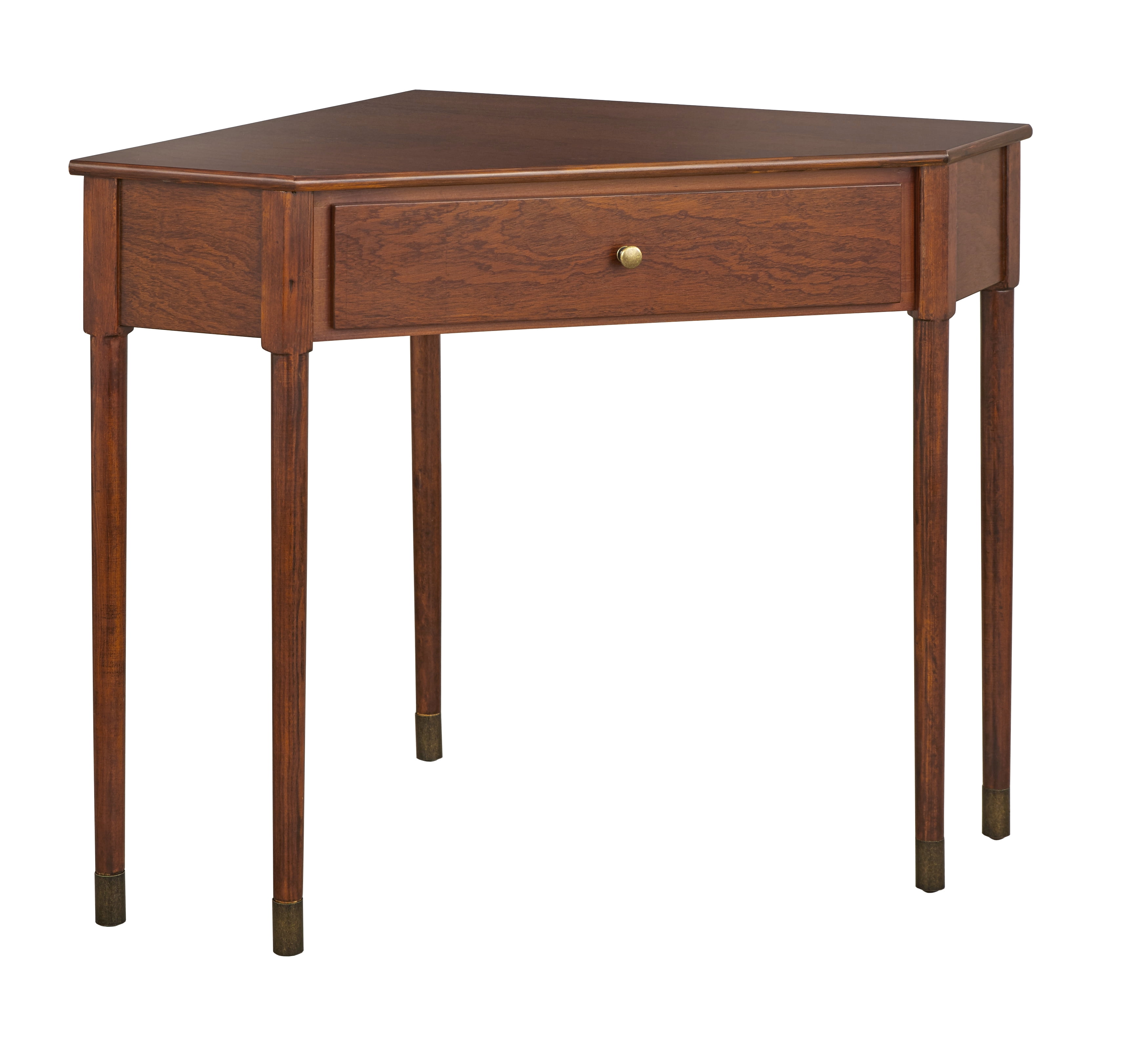 Includes: one (1) Mid-Century modern style corner desk Space-saving design maximizes unused space Ideal placement in the bedroom, family room, or corner nook Legs: Tapered with brass finished caps Spacious drawer for office essentials, accented with a brass knob Constructed of MDF with solid Pine legs Finish: Available in a warm Walnut or White Ships in one (1) carton, assembly required Desk overall dimensions: 30 inches high x 42 inches wide x 28 inches deep