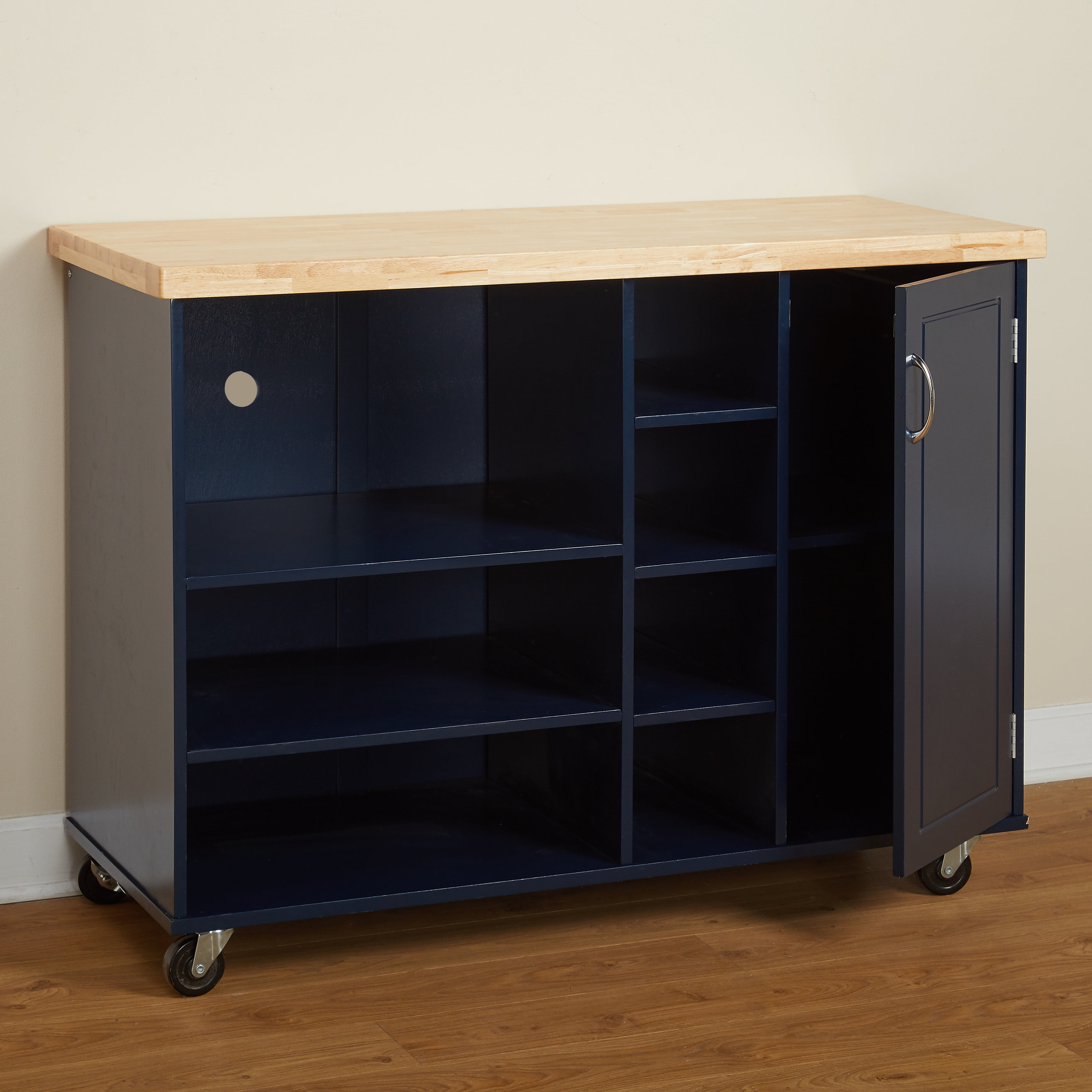 Target Marketing Systems Kitchen Microwave Cart, Multiple Colors Microwave kitchen cartOne large shelf for microwave storageSix open shelf for storing your kitchen essentialsTowel rackOne large cabinet with adjustable shelf behind the doorContrasting natural color wood topAvailable in two finish – Navy and WhiteStyle – ModernDimensions for large cabinet inner storage : 30.5 inches high x 13.2 inches wide x 18 inches deepDimensions for microwave shelf : 13.7 inches high x 22.5 inches wide x 18 inches deepDimensions for two medium sized shelf : 7.8 inches high x 22.5 inches wide x 18 inches deepDimensions for four small sized shelf : 7.8 inches high x 7.8 inches wide x 18 inches deepOverall cart dimensions : 36 inches high x 48 inches wide x 20 inches deepSome assembly requiredShips in 1 box