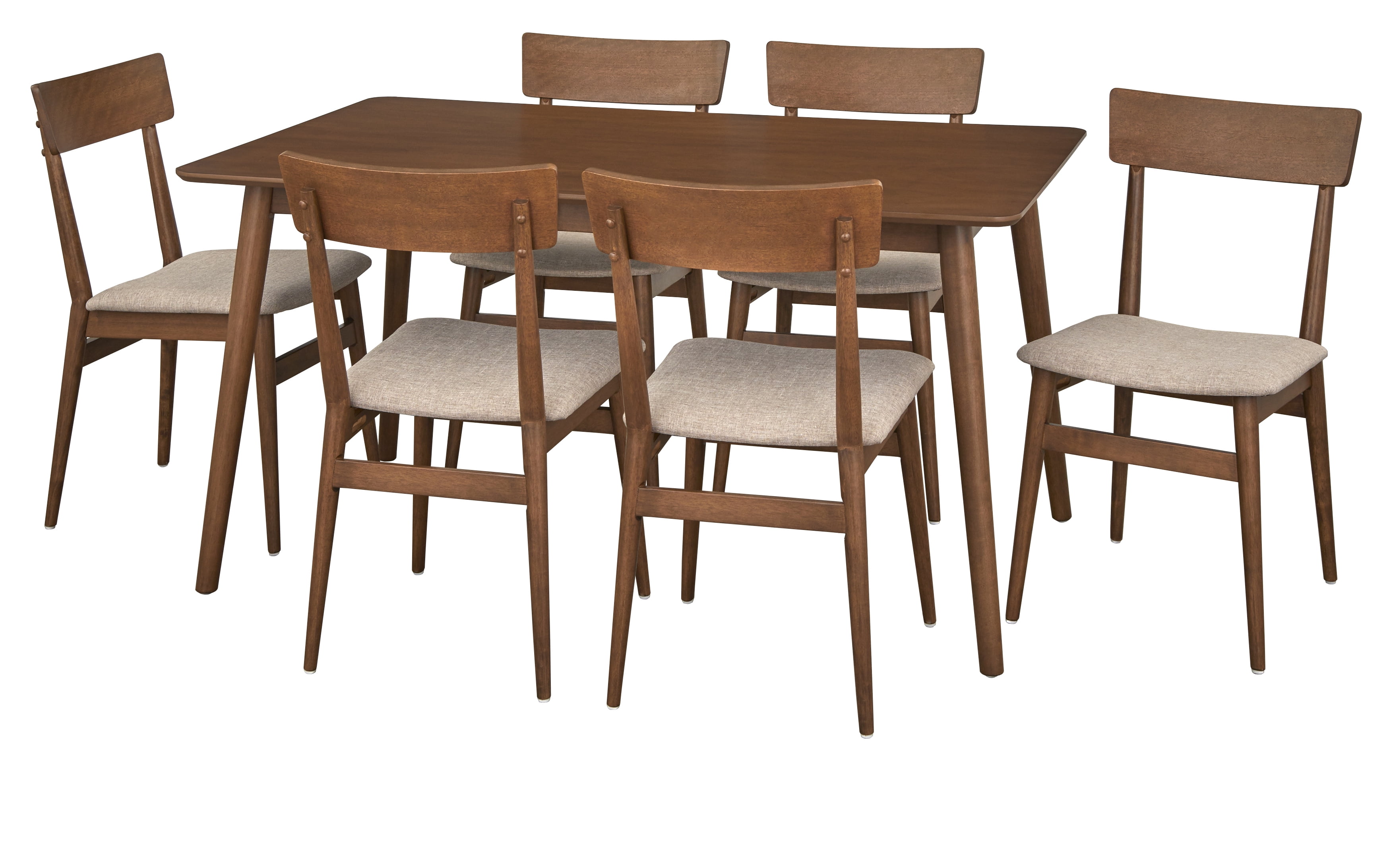 Includes: one (1) table and six (6) chairs Simple design with Mid-Century flair Rectangular table with rounded edges Angled, tapered legs Upholstered seats and curved backs for comfort Perfect for living room or dining room or kitchen Table crafted of Veneer and MDF with solid Rubberwood legs Chairs crafted of solid Rubberwood, fabric and foam Walnut finish Mocha Linen-like fabric upholstery Ships in four (4) cartons Table overall dimensions: 29.5 “H x 59.1 “W x 35.5 “D Chair overall dimensions: 33.5 “H x 18.8 “W x 22.3 “D Chair seat dimensions: 18.5 “H x 18.3 “W x 16.8 “D For Indoor use only