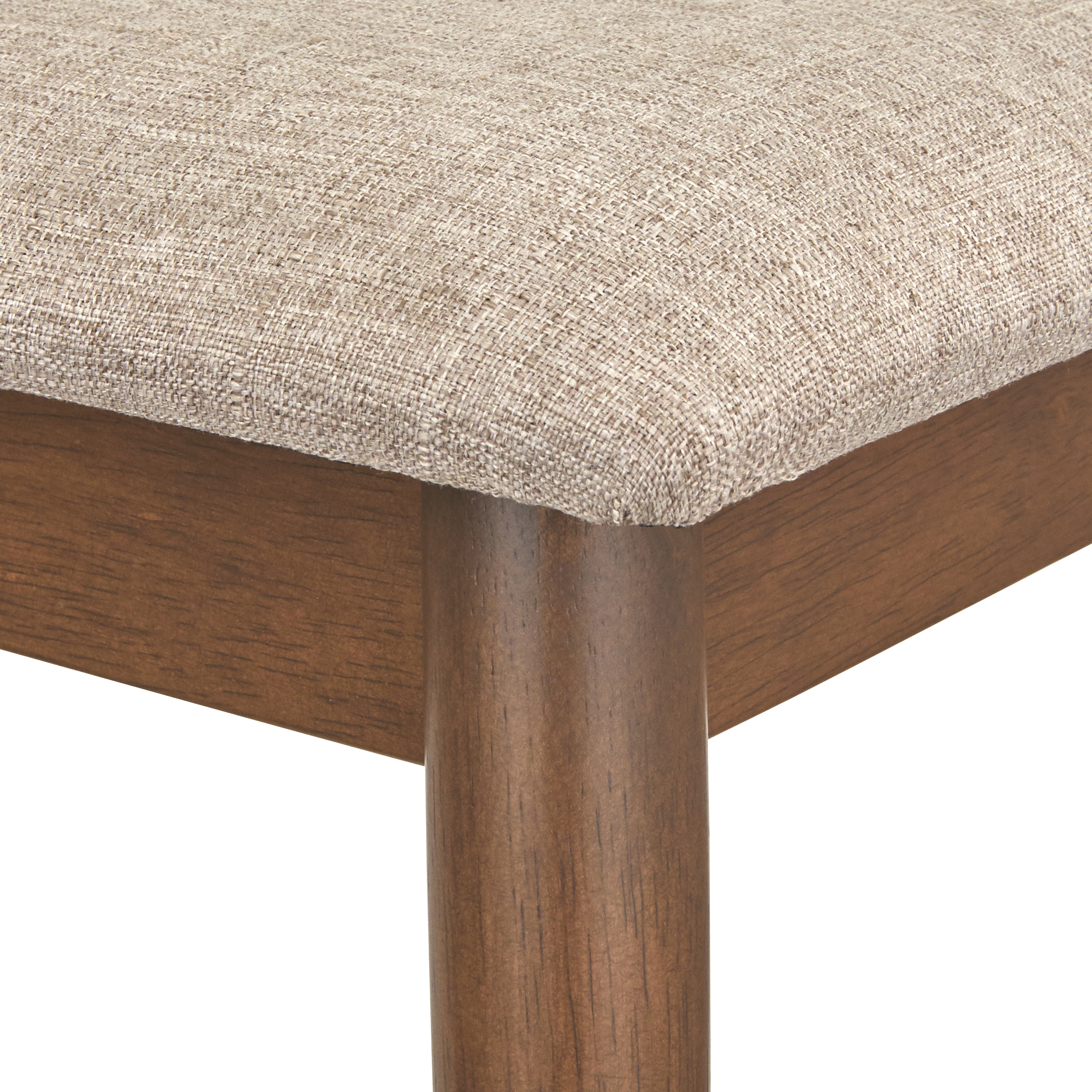 Includes: one (1) bench Simple design with Mid-Century flair Angled, tapered legs Upholstered seat for comfort Perfect to be placed in the kitchen, dining room or living room Crafted of solid Rubberwood, fabric and foam Walnut finish Mocha Linen-like fabric upholstery Ships in one (1) carton Assembly Required Bench overall dimensions: 18.5 “H x 43.5 “W x 16.2 “D For Indoor use only