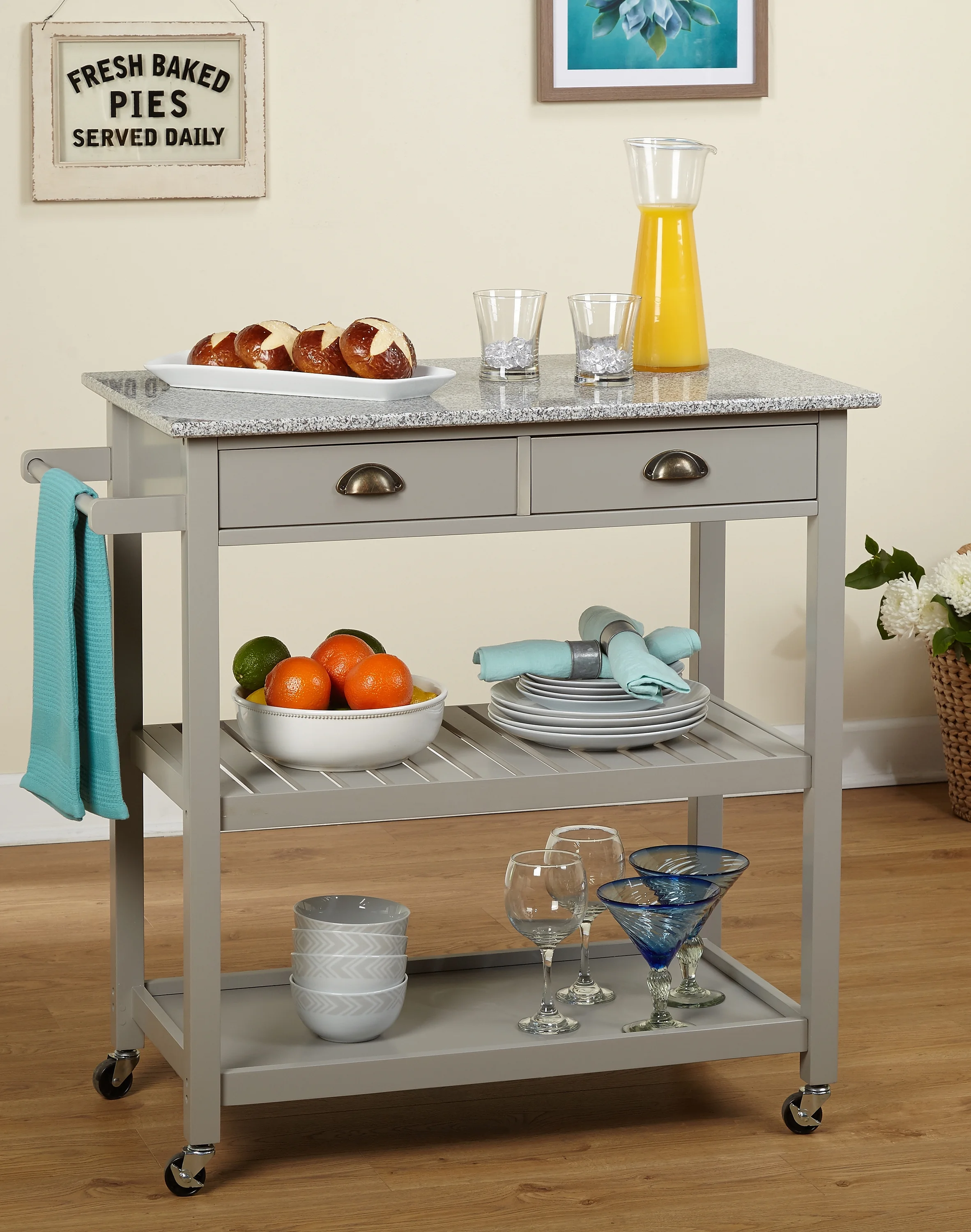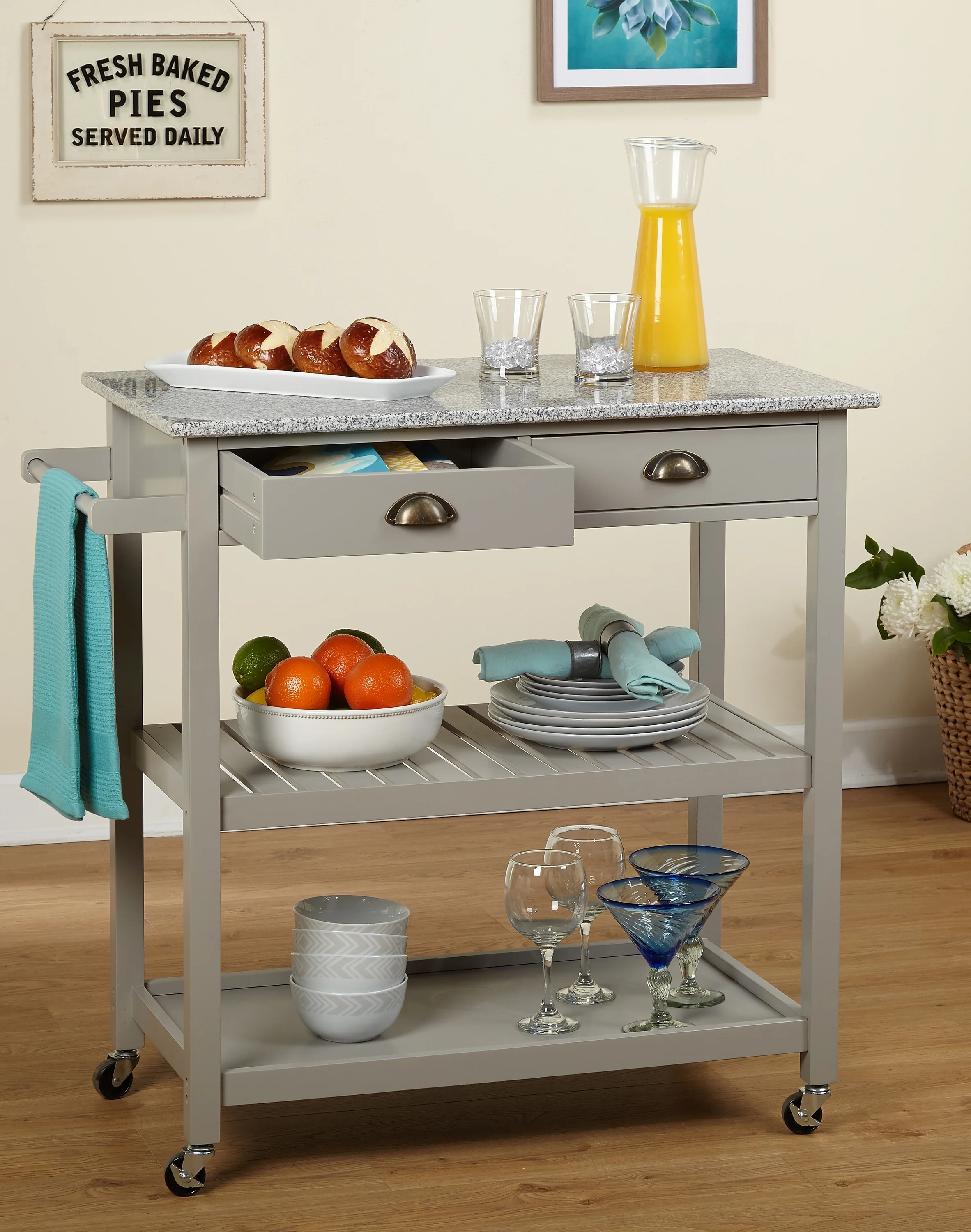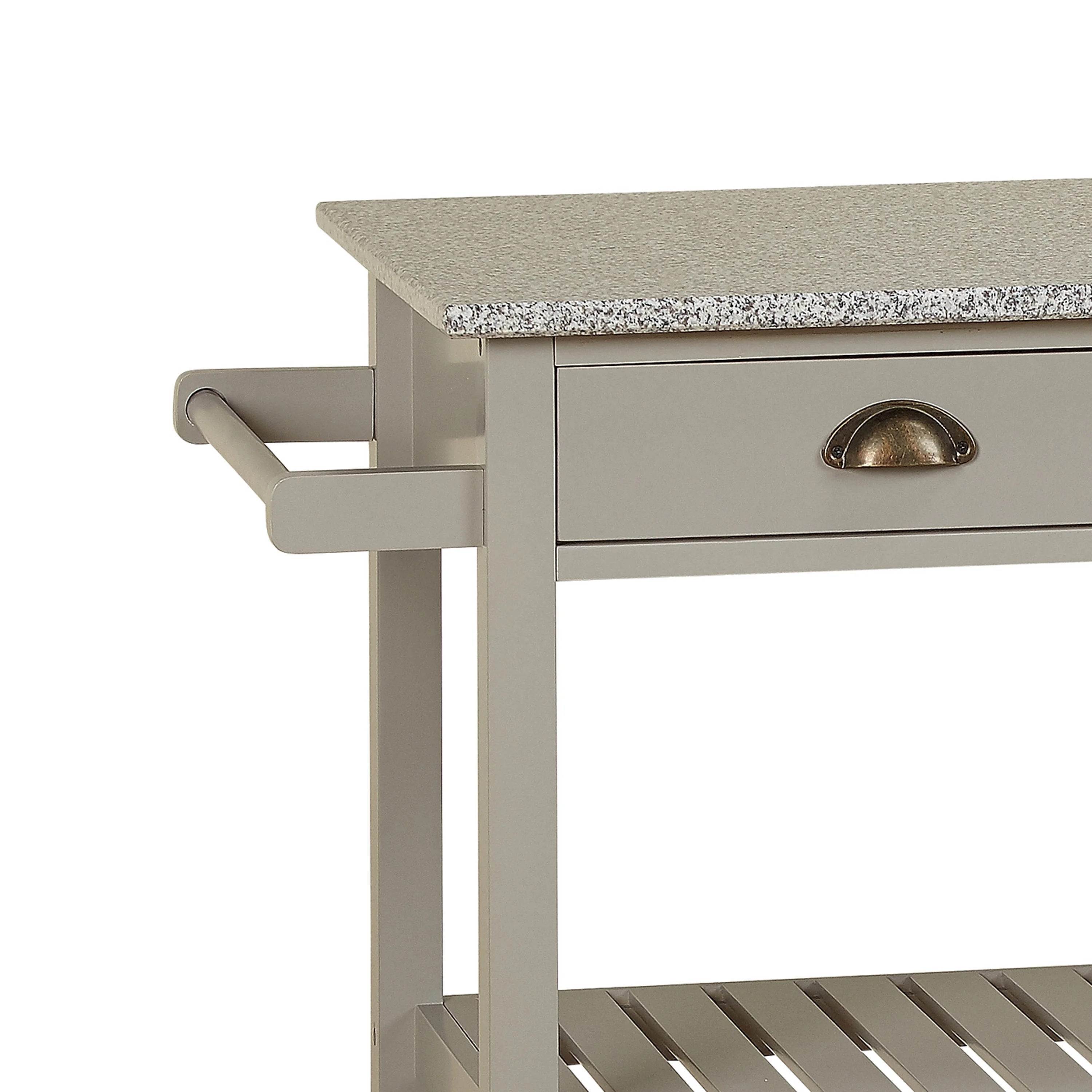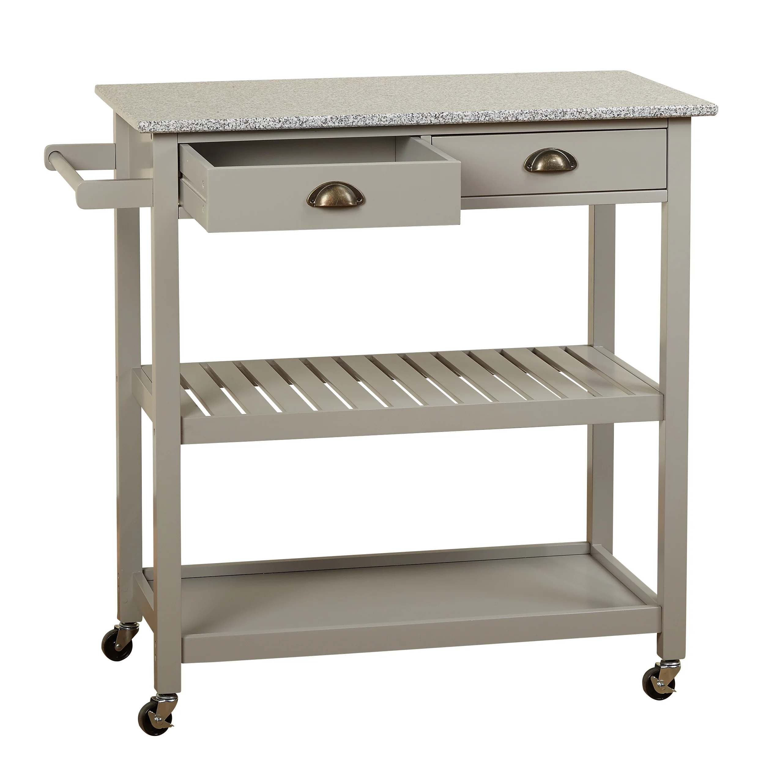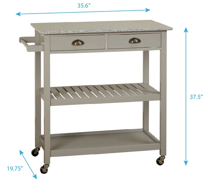 (1) towel bar (2) drawers (2) open shelves Locking castors for mobility Availble in Gray or White finishes Made of MDF with a granite top and metal drawer pulls Style: Vintage, Industrial Kitchen cart overall dimensions: 35.5 “H x 34.1 “L x 19.75 “W Drawer Dimensions: 3.1 “H x 13 “L x 13.1 “W Both Cabinets Dimension: 11.25 “H x 30.1 “L x 16.6 inches Assembly Required Product Weight: 69 lbs.