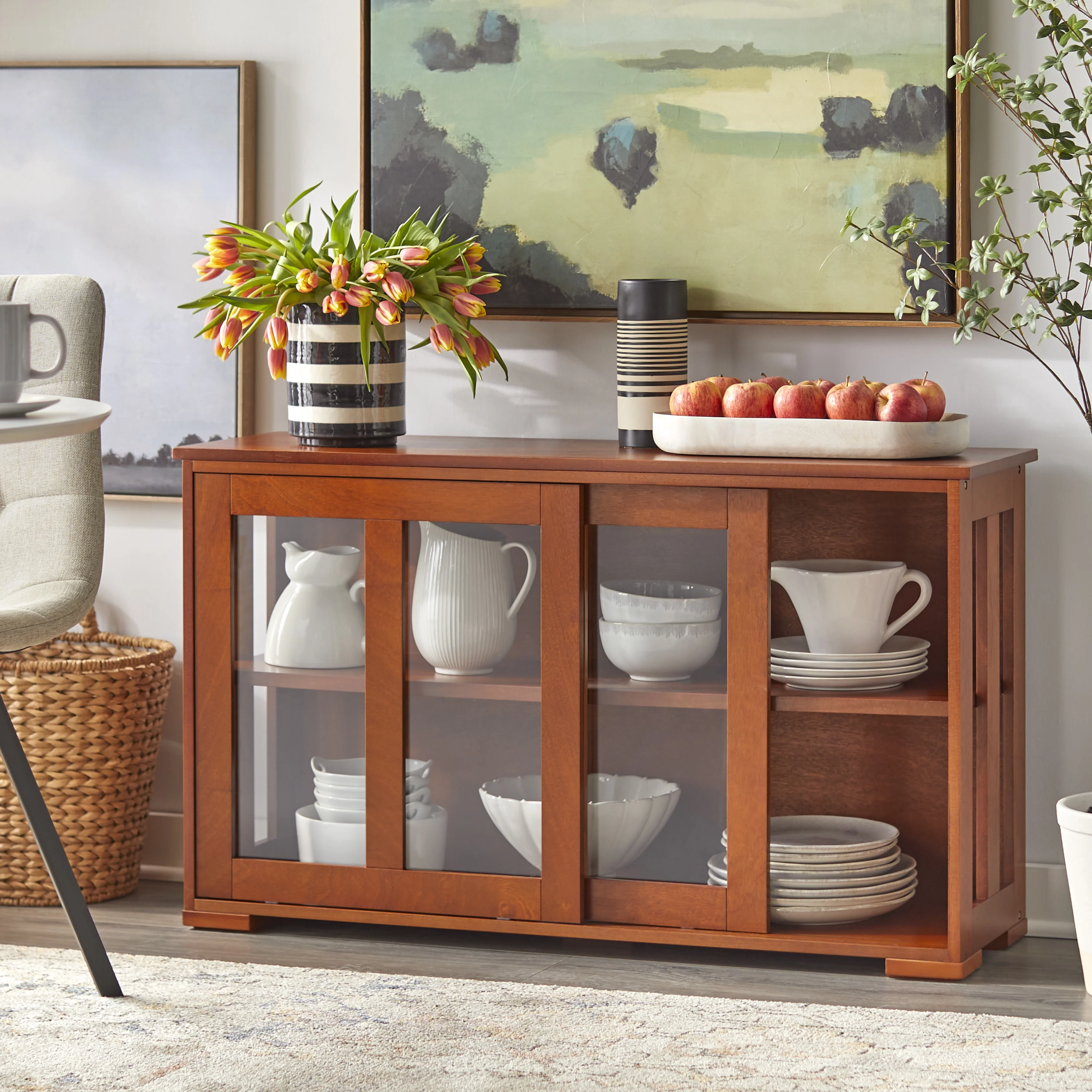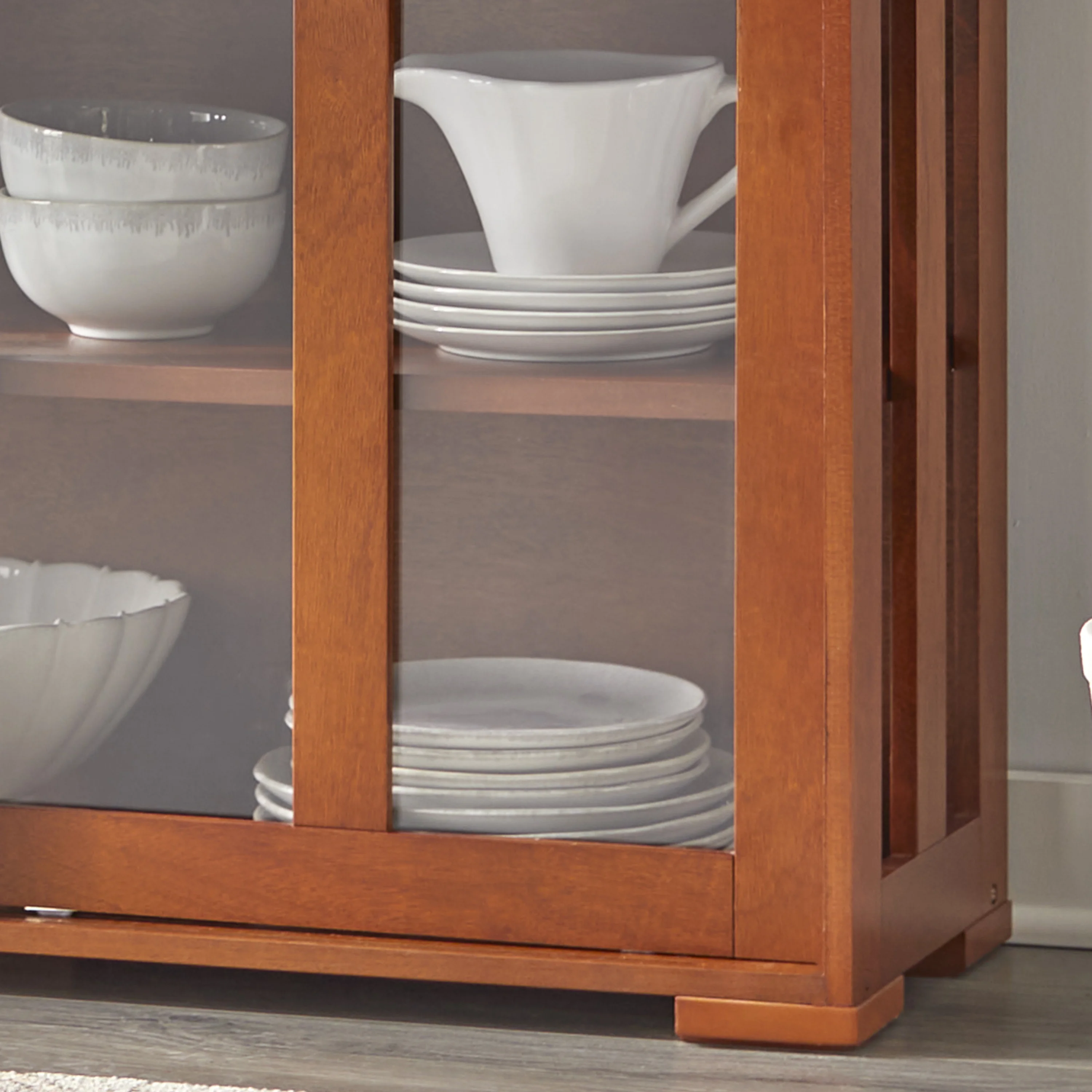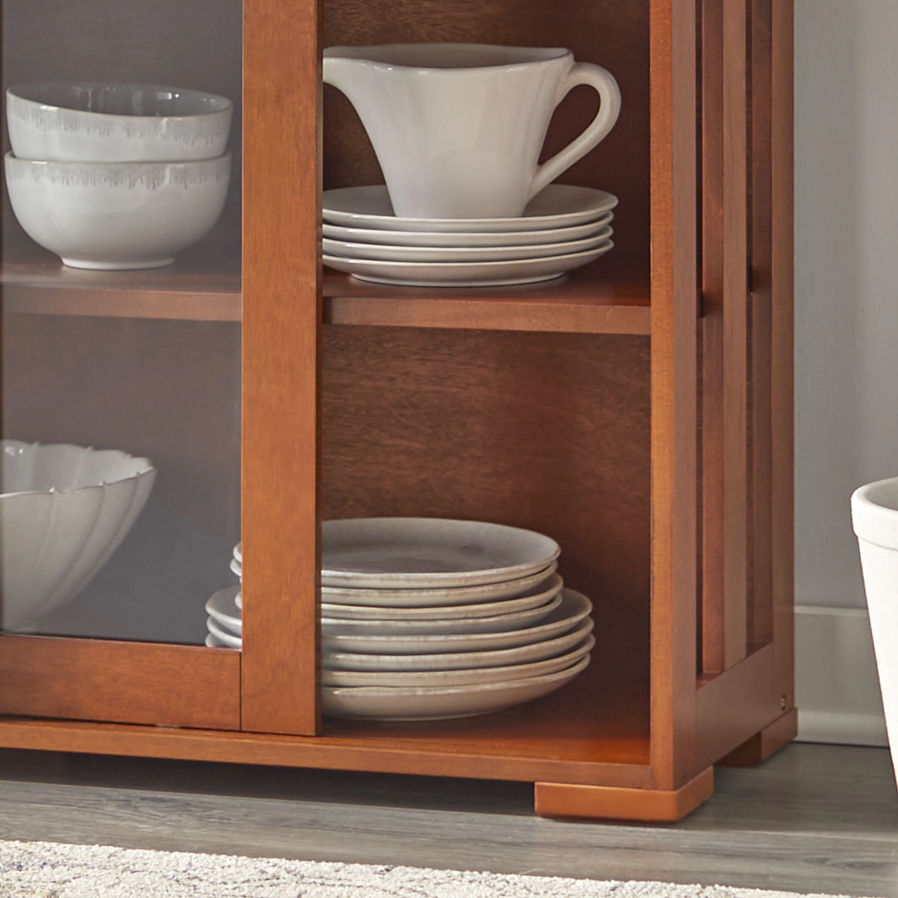 Versatile Pacific Stackable Cabinet with glass is ideal in your dining area, kitchen, living room, or home office Constructed with durable engineered wood Walnut finish Stack up to 3 units high; wood dowels included for stacking option Features 2 large sliding doors with tempered glass for easy use and open plank sides 1 adjustable shelf to accommodate various sized items Assembly required Assembled dimensions: 42” x 13” x 25”H Inside cabinet dimensions: 39.6” x 10.5” x 21.75”H