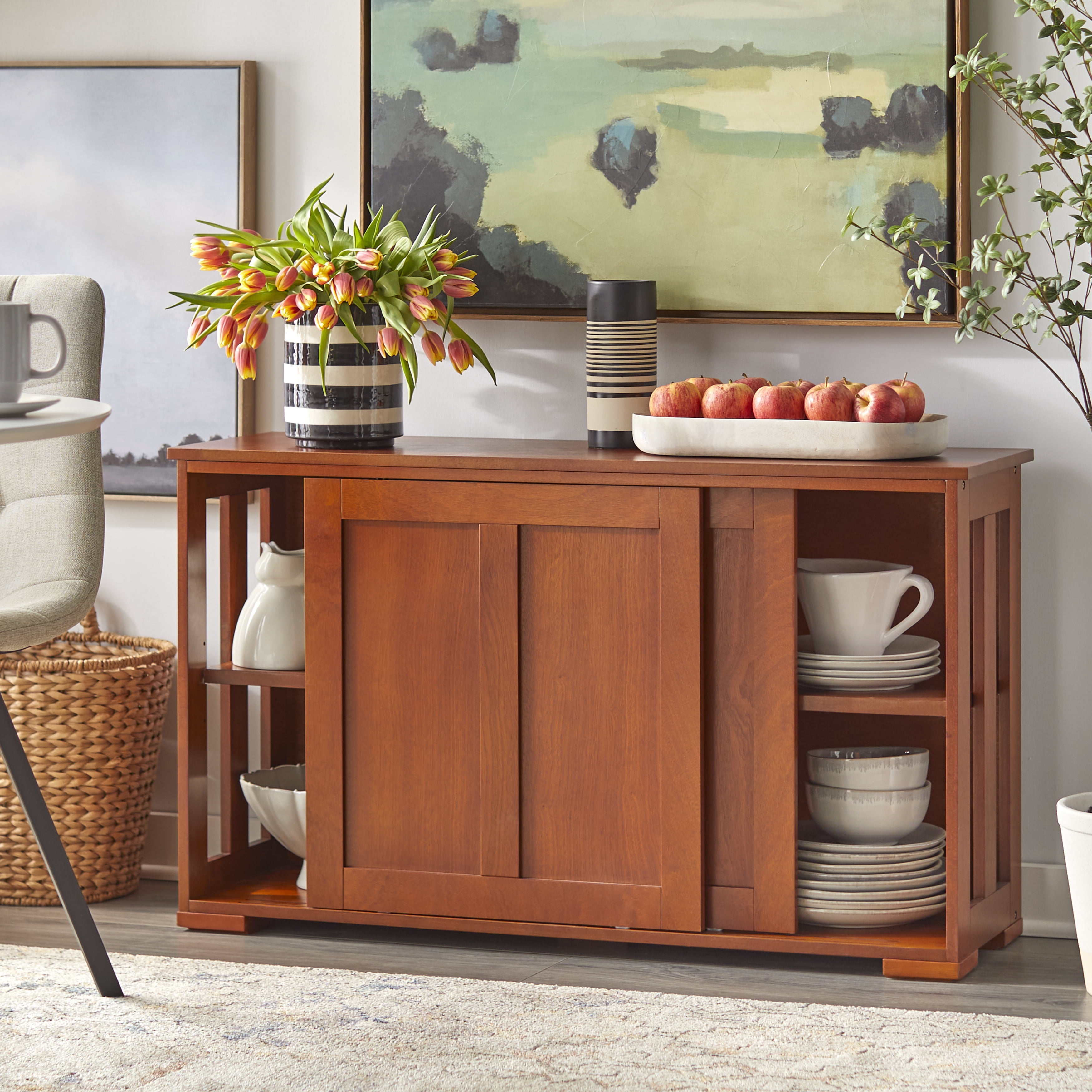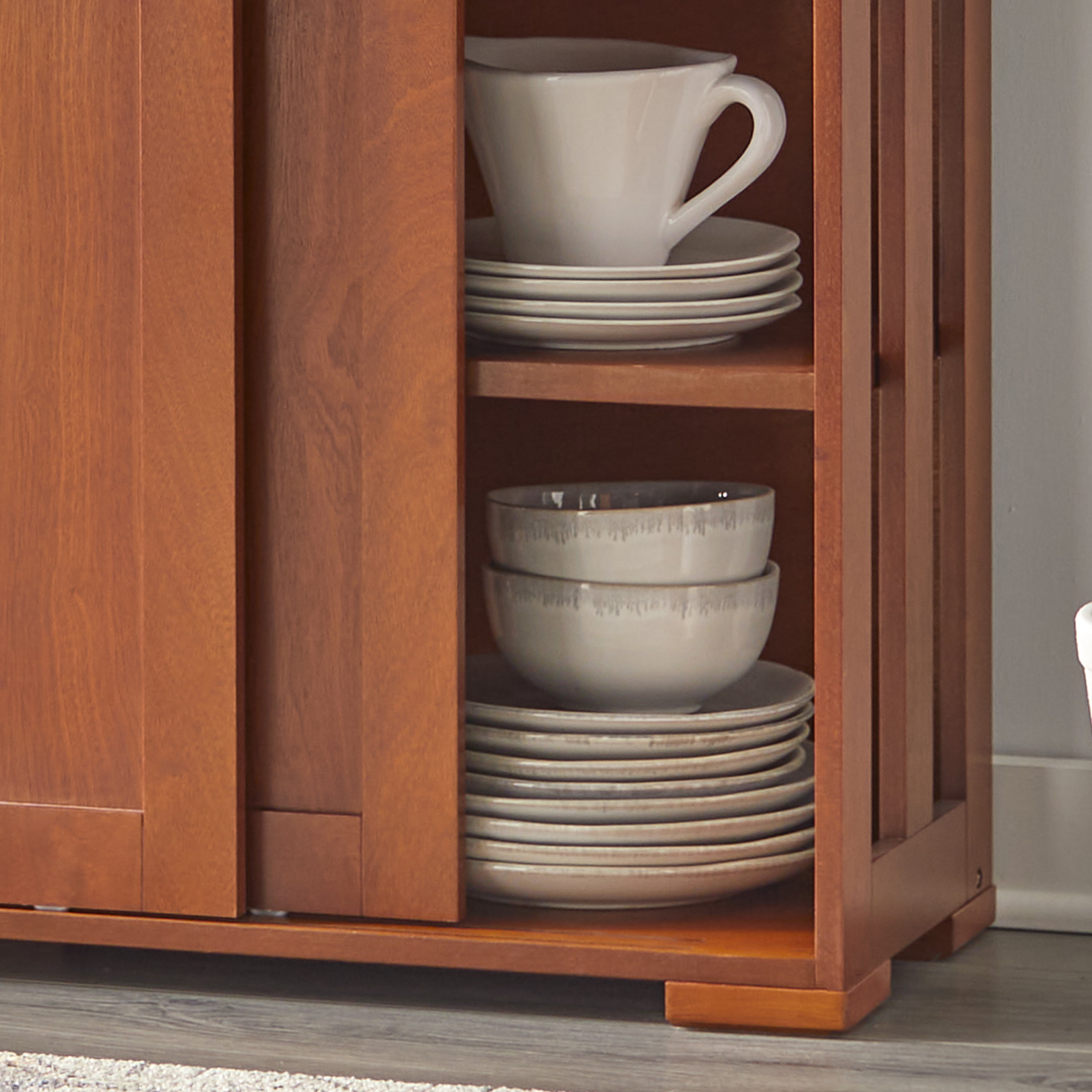 Versatile Pacific Stackable Cabinet is ideal in your dining area, kitchen, living room, or home office Constructed with durable engineered wood Walnut finish Stack up to 3 units high; wooden dowels include for stacking option Features 2 large sliding doors for easy use and open plank sides 1 adjustable shelf to accommodate various sized items Assembly required Assembled dimensions: 42” x 13” x 25”H Inside cabinet dimensions: 39.6” x 10.5” x 21.75”