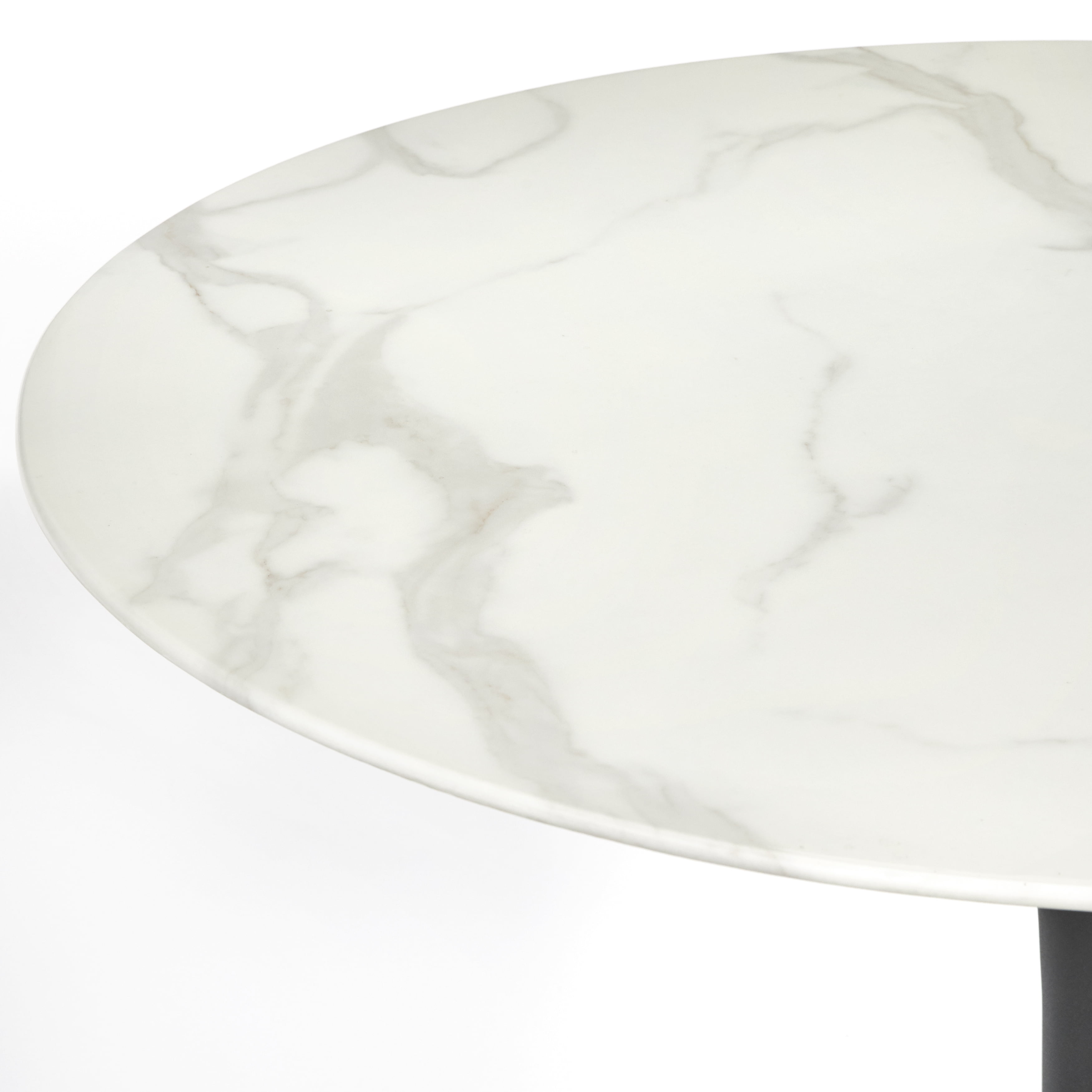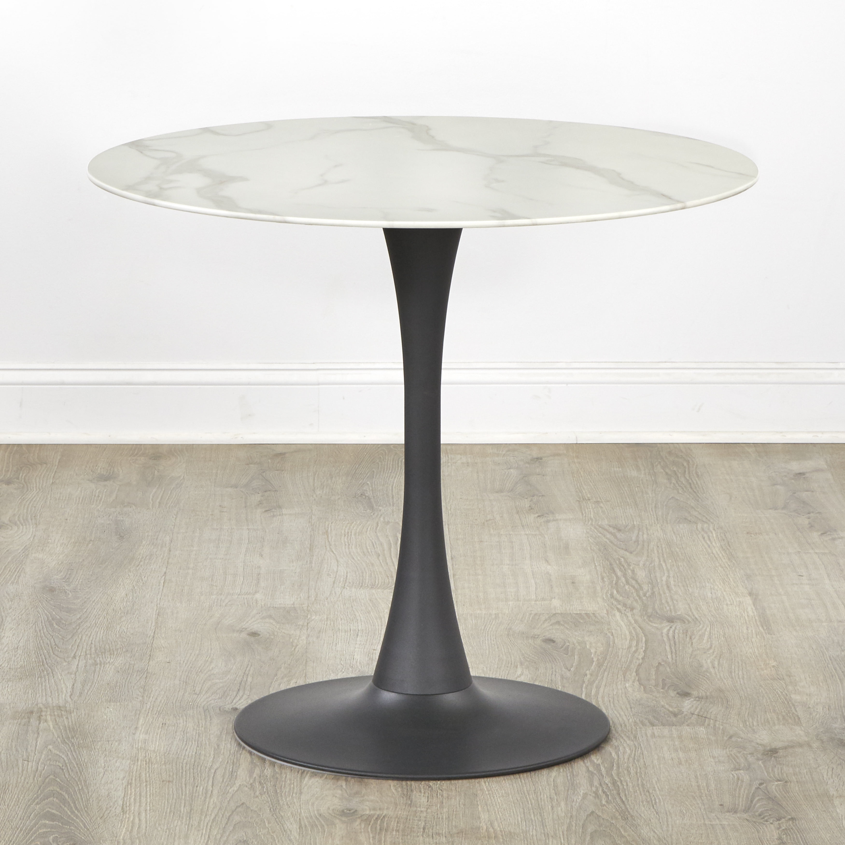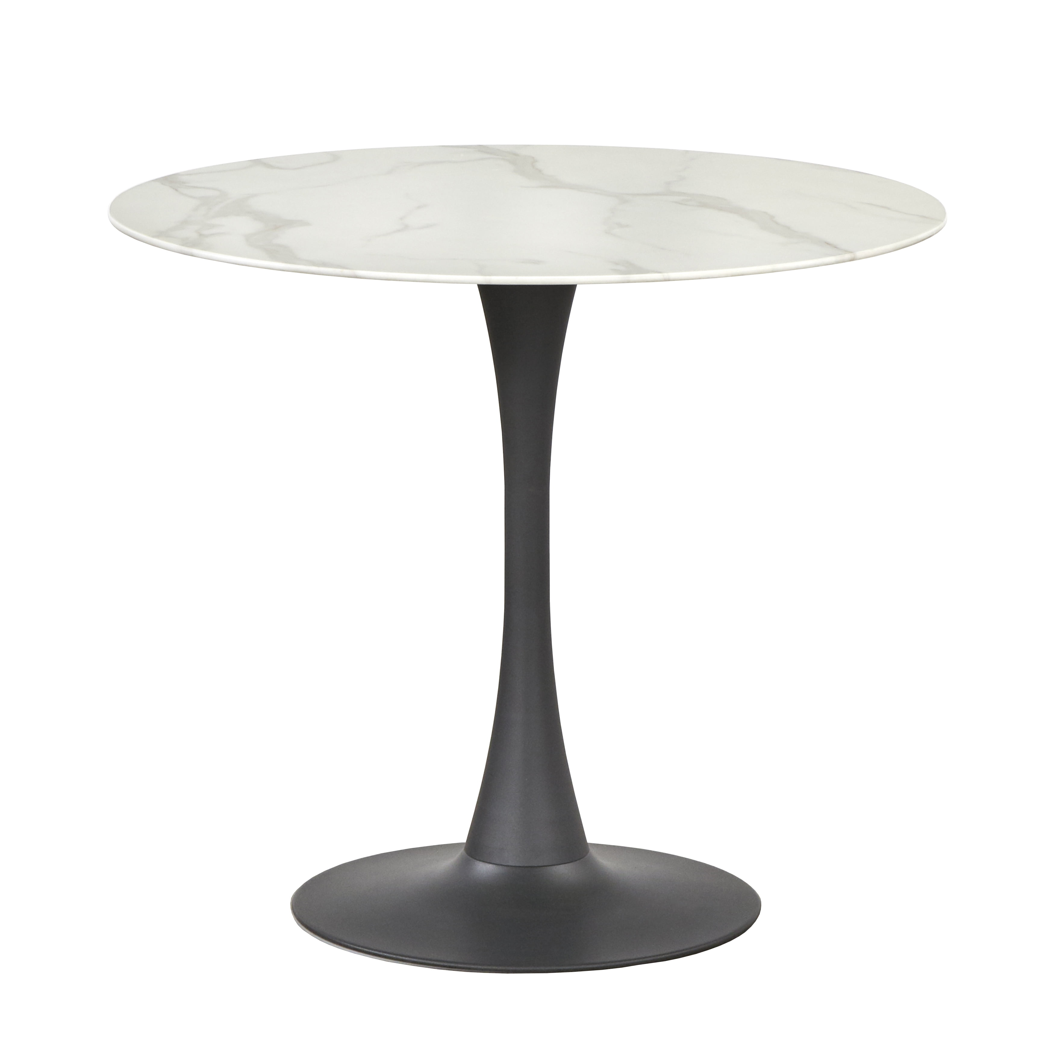 Rho Round Dining Table Includes: one (1) round dining table Mid-century styling White faux marble table top accented with gray veining Swooped styled contrasting pedestal base Ideal placement in the kitchen, breakfast nook or dining area Table constructed of a tempered glass top and metal base Black finished pedestal base Ships in two (2) carton Assembly required Table dimensions: 29.3″H x 35.5 inches long x 35.5″D Table top is 8mm thick For indoor use