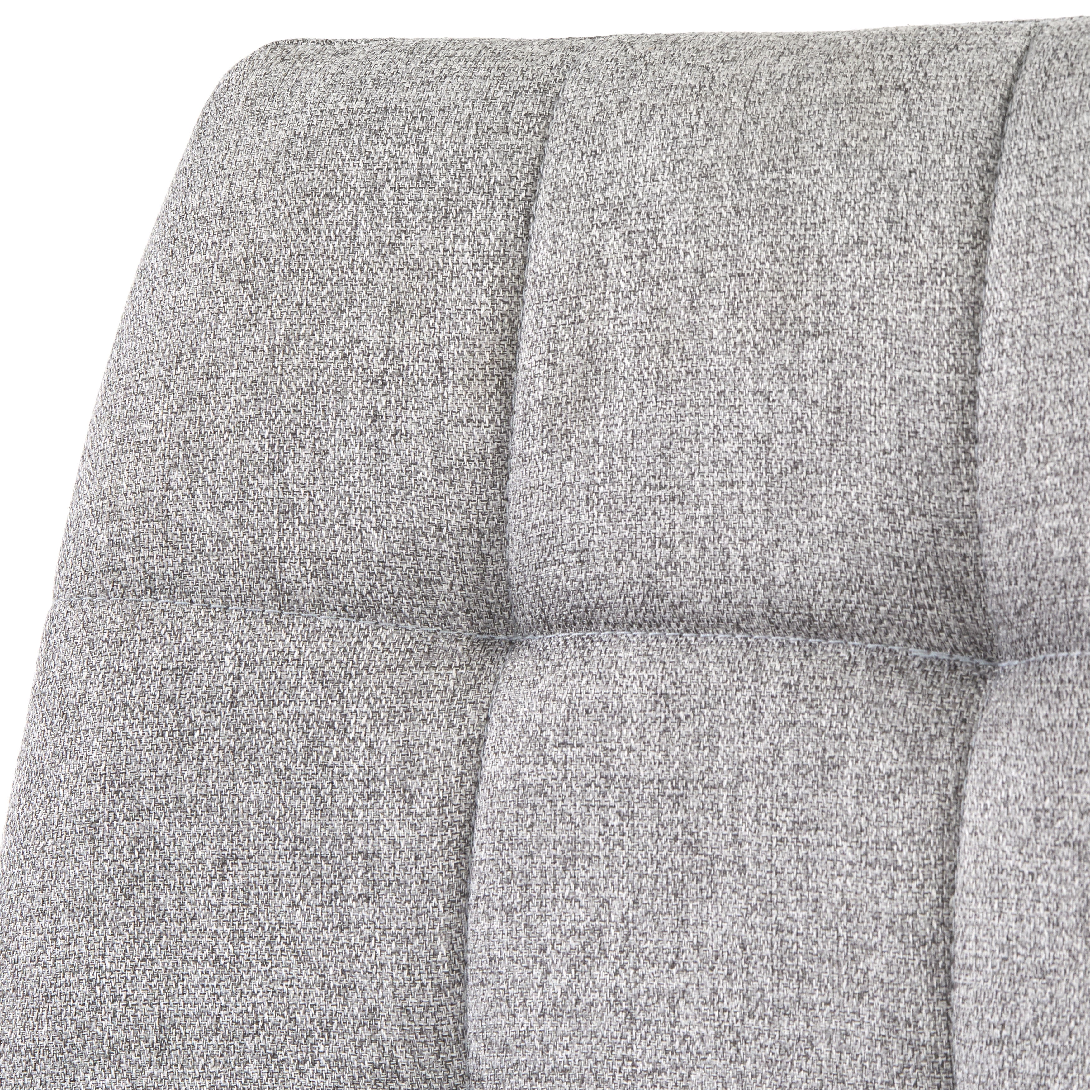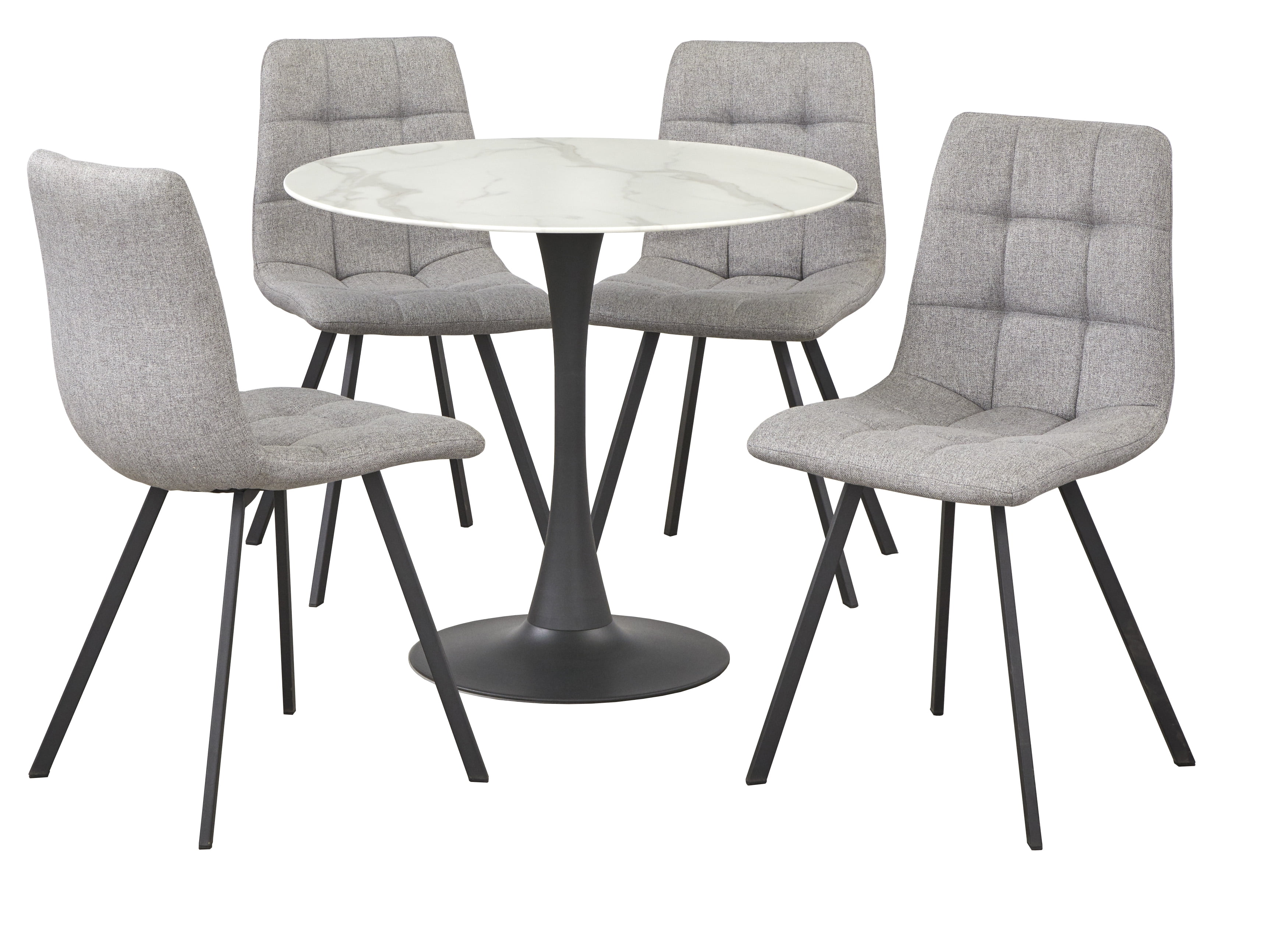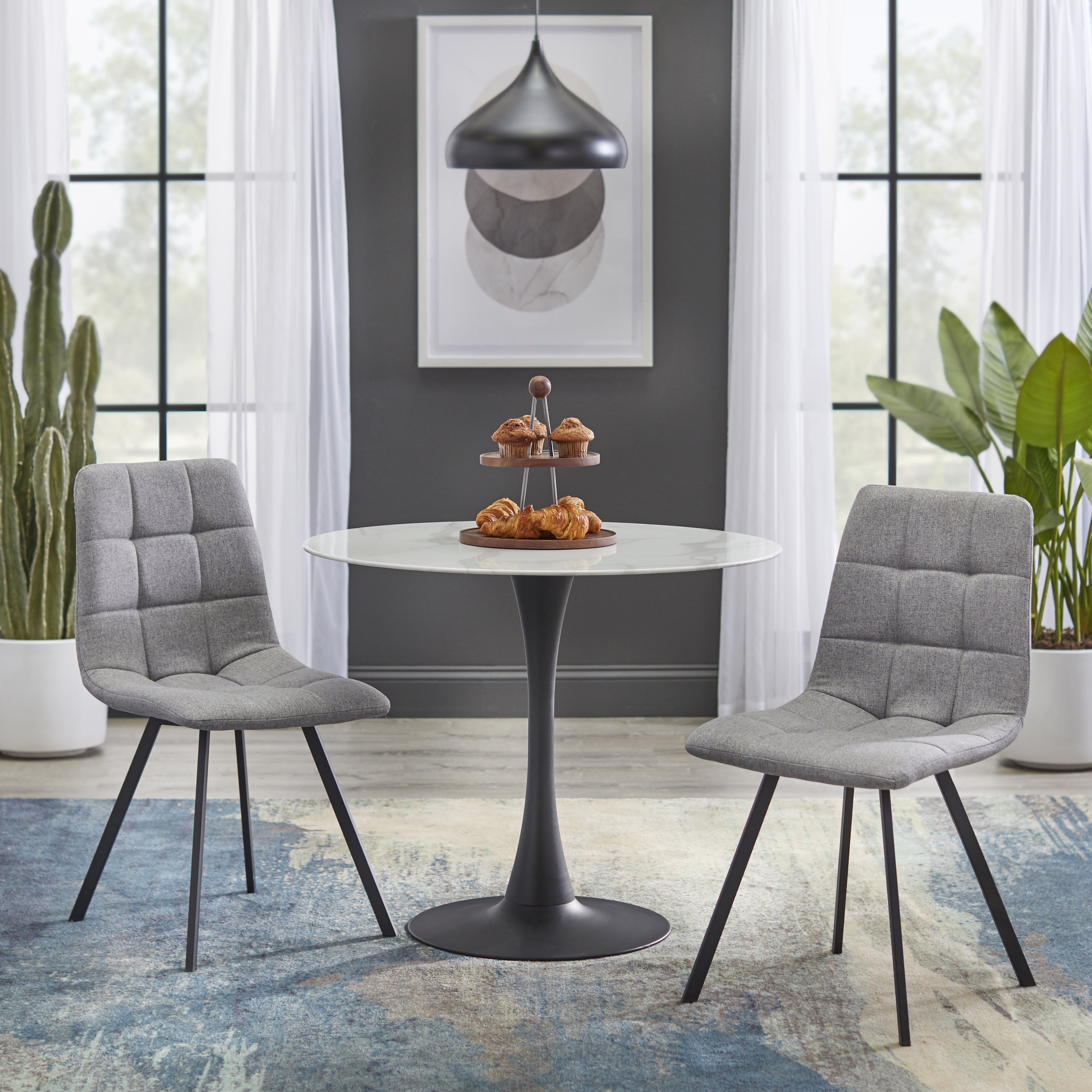 Rho Dining Set Set includes: one (1) round dining table and four (4) dining chairs Mid-century styling; Faux marble table top with tempered glass finish Swooped styled contrasting pedestal base Ideal placement in the kitchen, breakfast nook or dining area Table constructed of a tempered glass top and metal base White faux marble table top accented with gray veining Black finished pedestal base Chairs constructed of bentwood, fabric, and foam and metal Tufted upholstered dining chairs Chairs feature black stylishly angled metal legs Upholstered in a Gray Linen-like fabric Ships in three (3) cartons, assembly required Table dimensions: 29.3 inches high x 35.5 inches long x 35.5 inches deep Table top is 8mm thick; base is 19.6″ diameter Chair overall dimensions: 33.8 inches high x 17.5 inches wide x 21.5 inches deep Seat dimensions: 19 inches high x 17.5 inches wide x 15.5 inches deep