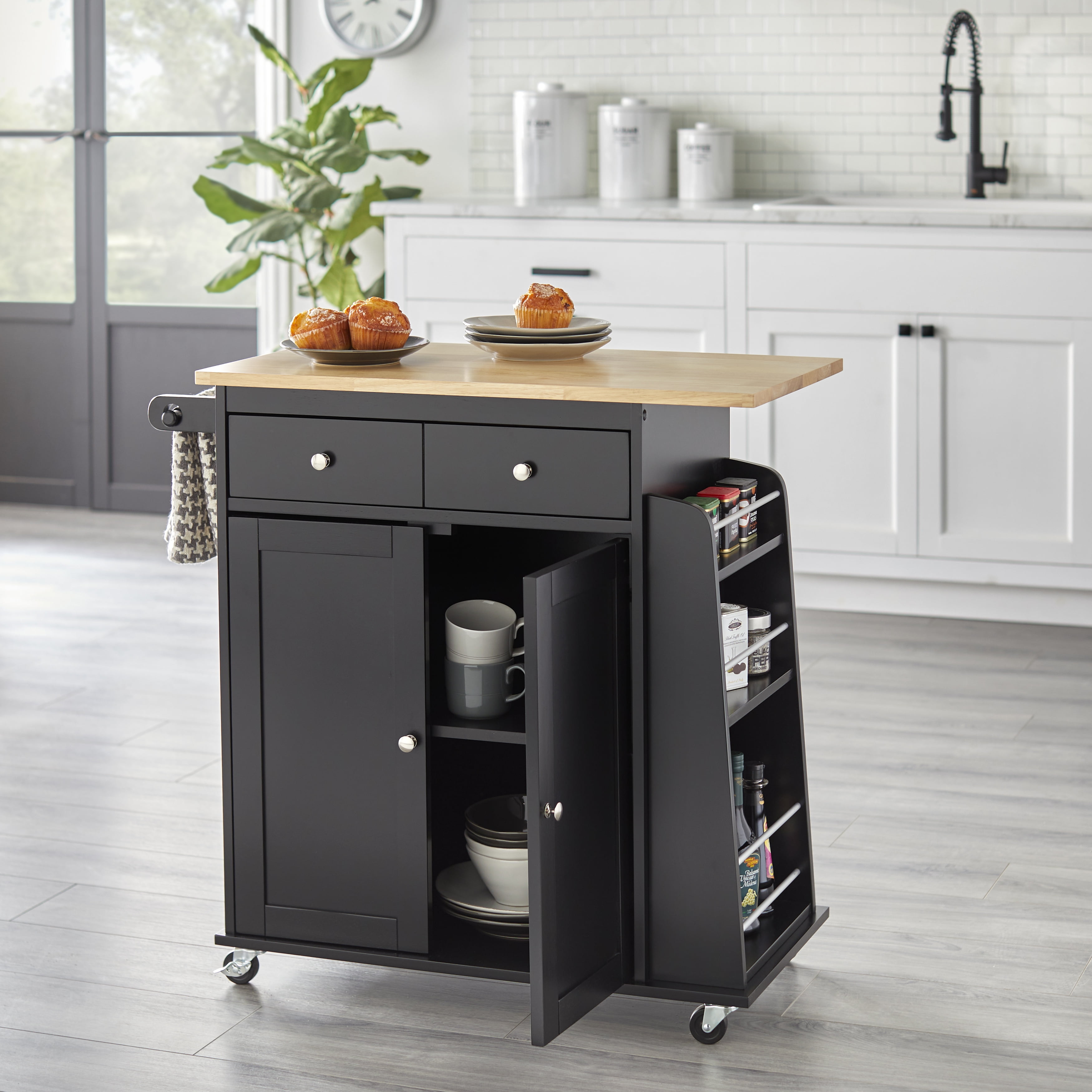 TMS Sonoma Buther Block Rolling Kitchen Cart with Adjustable Shelves, Drawer, Towel Rack, and Spice Rack, Black