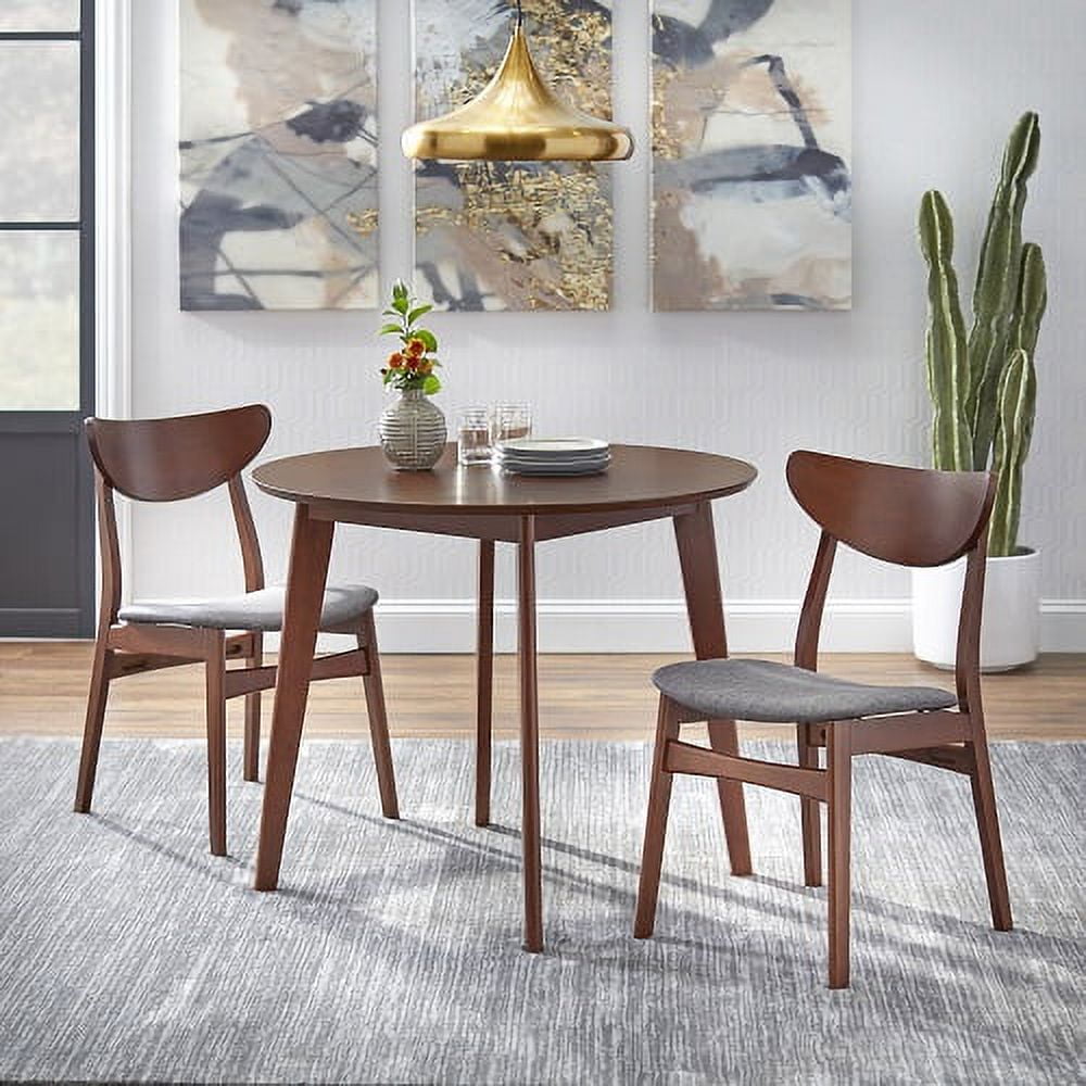 Midcentury-modern is making a comeback. This beautiful Tania 3-Piece dining set has all the hallmarks: clean lines, tapered shaker wood legs, curved chair-backs and a beautiful Walnut finish. Set includes the dining Table and 2 upholstered chairs. Redefine your dining space with this vintage-style dining set. Tapered shaker legs give the table a midcentury aura. Curved seat backs complete the modern look