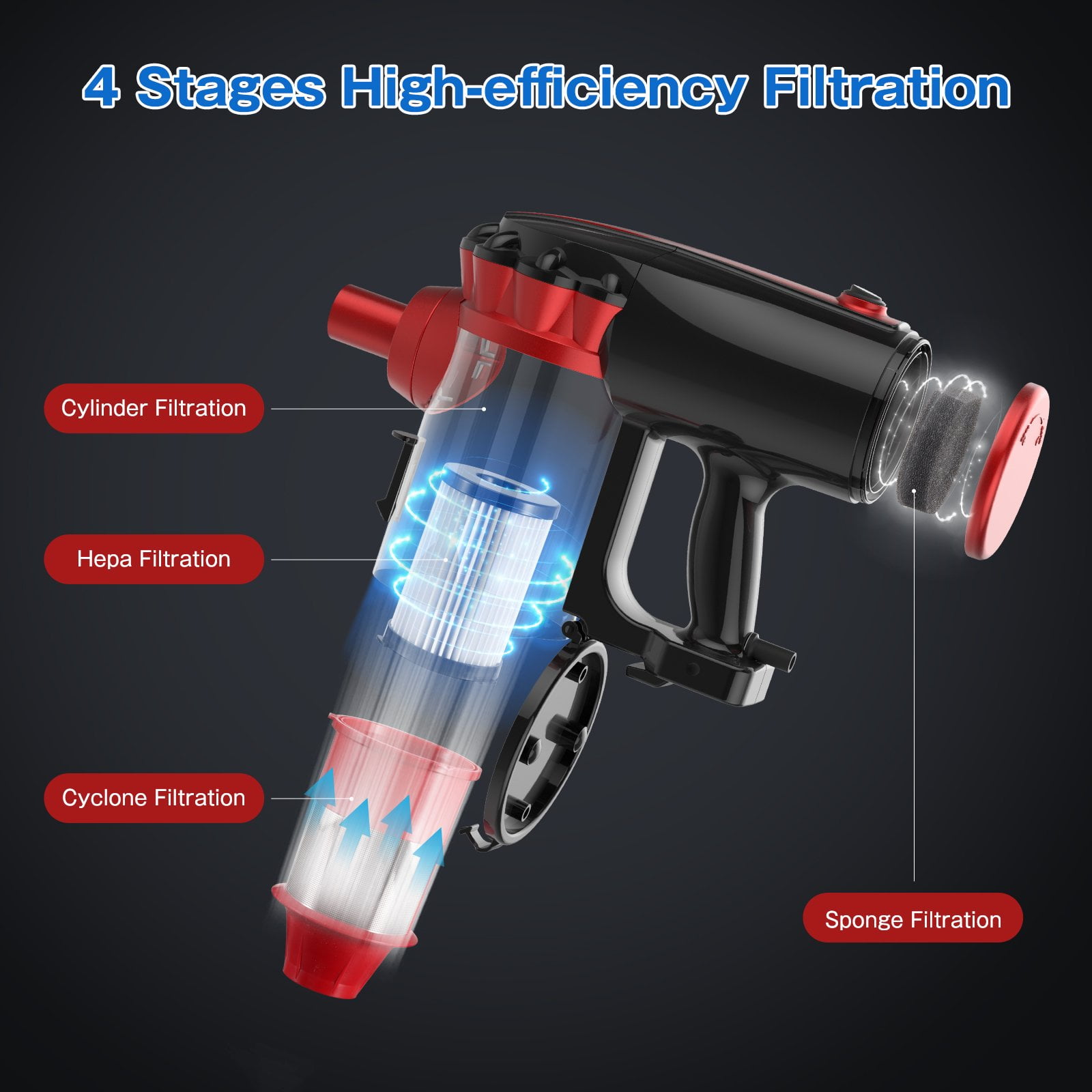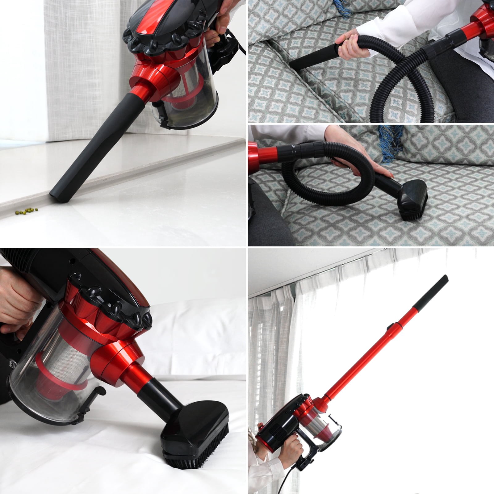 23ft long corded vacuum cleaner for dust, debris, and pet hair 17000Pa suction power stick electric vacuum cleaner 4 stages fully-sealed HEPA filtration system Bagless design: 0.8 liters large-capacity dust cup An extension tube allows you to adjust the tube length