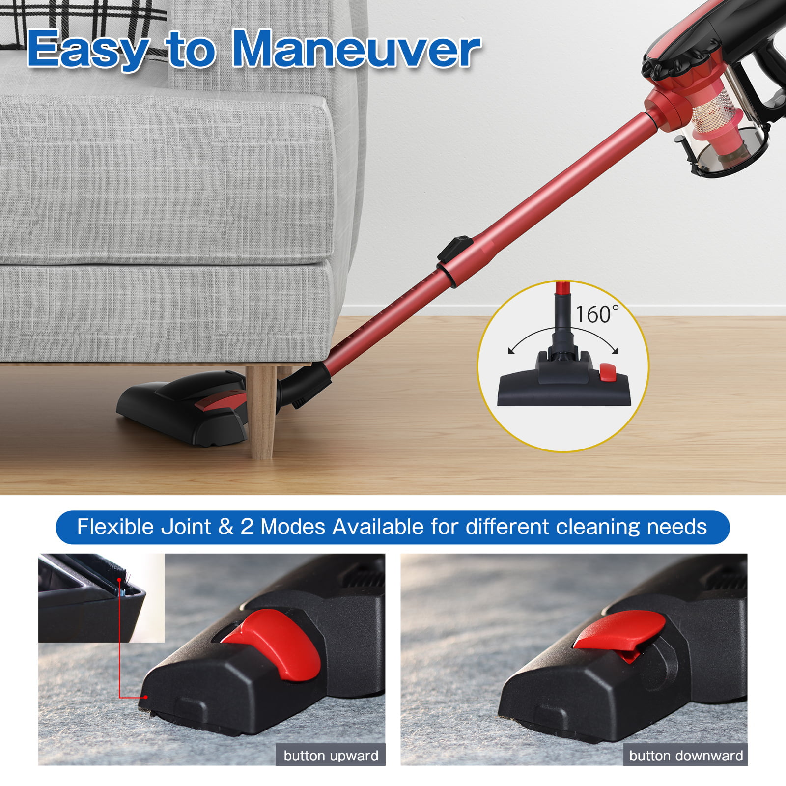 Tocwon hardwood floor vacuum can easily convert from a stick vacuum to a handheld vacuum with multi attachments. Lightweight with a weight of only 4.11 pounds, the compact vacuum cleaner can be operated with one hand to clean from the floor and high places easily. The corded stick vacuum provides continuous and stable power that doesn’t fade. Always ready to go. Perfect stick vacuum cleaner for marble, tile, and hardwood floor, pick up all debris, such as cat litter, dog food crumbs, and pet hair. With 18-30 inches adjustable length and a power cord of 23 feet long, the hard floor vacuum gets a wider range of use. The flexible joint could free to clean the dirt under the furniture and bed and clean up dead corners. The brush head is easy to be controlled, feel free to control its direction where you want. 2 modes selective – A red button is designed for different cleaning requirements: button upward, good for normal floor cleaning tasks; button downward, the hard brush and soft rubber will drop down, perfect for deeper cleaning. With multipurpose attachments, this corded stick vacuum can be easily converted to a portable handheld vacuum to cover your various cleaning needs.