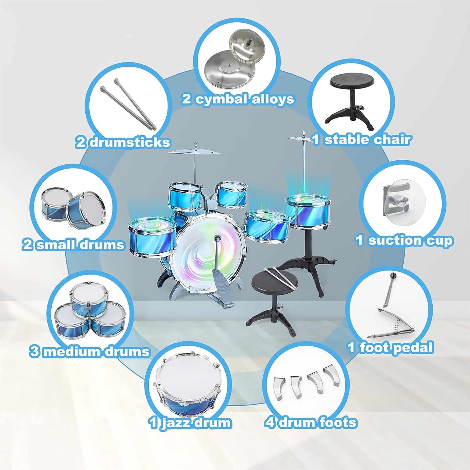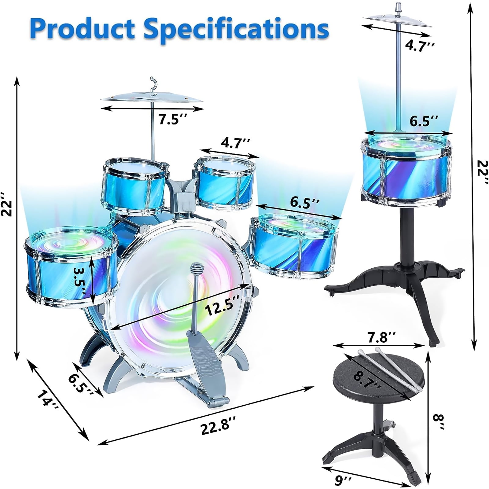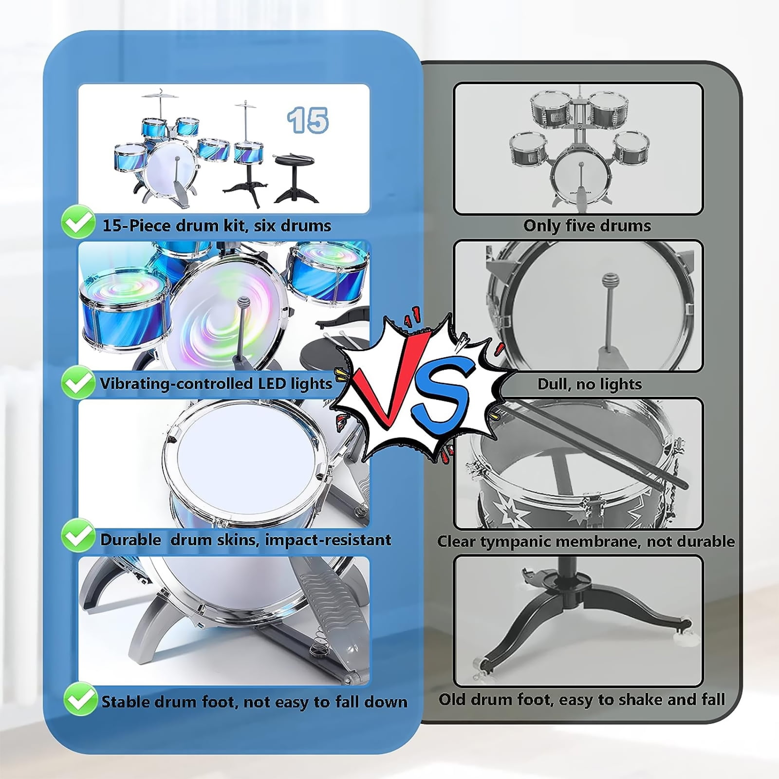 Safe and High Quality Material: Our kids drum set is made of non-toxic and odorless materials.Fine workmanship and smooth edge, Safe and very kid friendly. The jazz drum set is also equipped with a pair of children’s drumsticks and a stool. After installation, kids could sit down and play. 15 Pieces Jazz Drum Kit: Our drum kit comes with a jazz drum, three medium drums, two small drums, two cymbals, a stool, and a pair of drumsticks. It is perfect as beginners in learning and practicing drum. Ideal for toddlers aged 1-3 who want to explore the world of percussion. Easy to Assemble: To avoid damage during tansportation, the drum kit will remain unassembled. But don’t worry, please follow the instructions for details on our product page. No tools required and it may take you only 5-10 mins to install a complete kids drum set! You could work together with your kid to train his/her manual ability. Musical Instruments Toys: Toddler drum set is an early education toy with eye-catching lights and versatile design. As your child learns to control the rhythm of the drums, the realistic sound will make them immersed in their own world of music. Drumming can increase children’s interest in music, promote children’s hearing development, improve children’s concentration, and exercise children’s flexibility and coordination. Wonderful Musical Gift for Kids: The drum set is a great gift for your children! It would give your kids a happy time. It is the best gift for kids ages 2 3 4 5 6 on Christmas, birthday, Children’s Day, holiday, special days and so on!