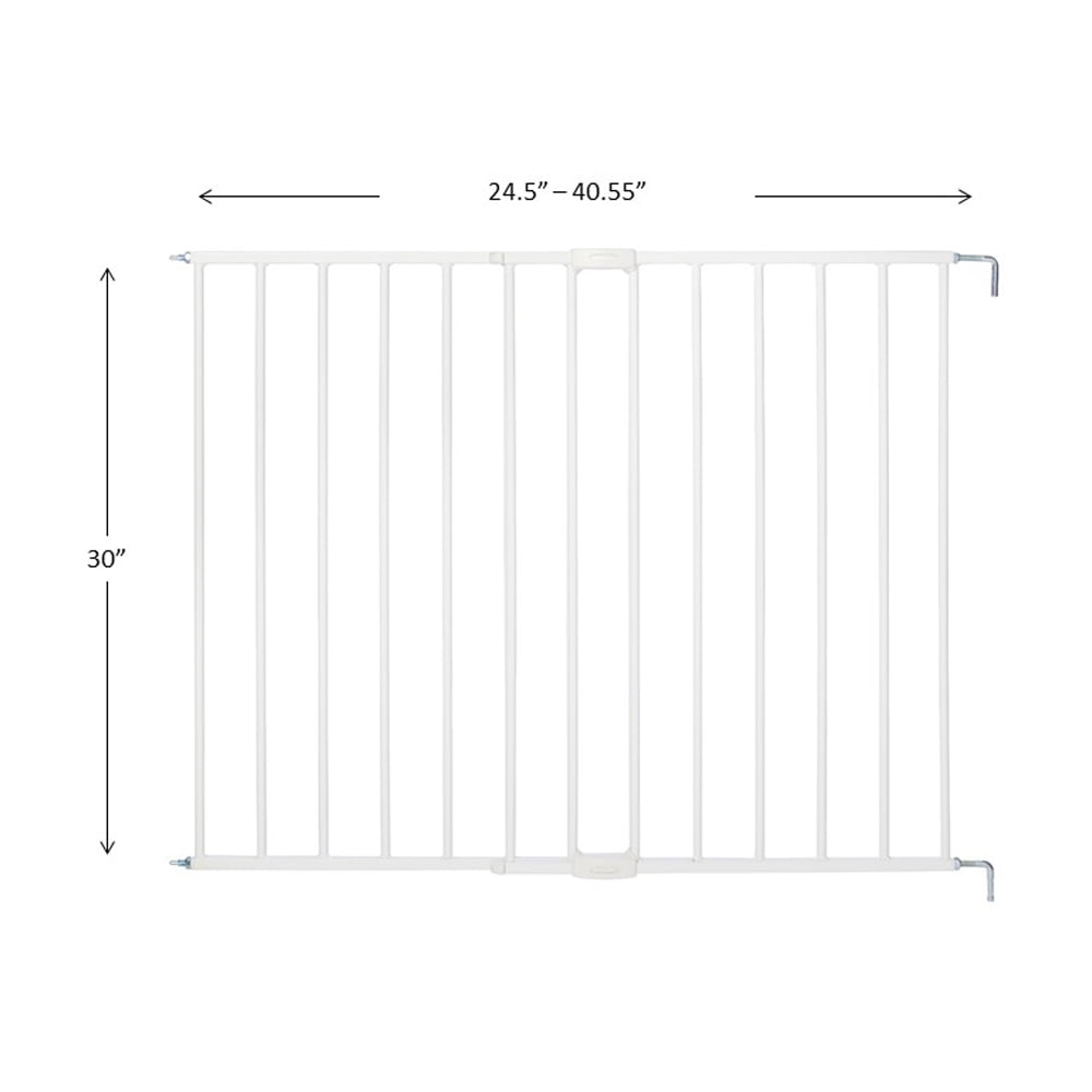 24.5″-40.55″ baby safety gate Intended for children ages 6-24 months Stairway and walkway gate designed to fit in doorways, hallways or top of stairs Features sturdy metal construction with a secure safety latch design and the option for one-handed operation Designed without a threshold to step over and a gate that does not swing out over the stairs Adjustable gate conveniently and easily removes when not in use White color stylishly blends into home interior design 30 inches tall and expands 24.5-40.55 inches wide JPMA Certified and ASTM Certified