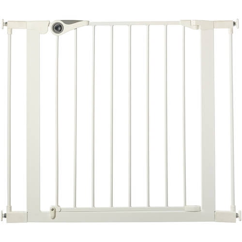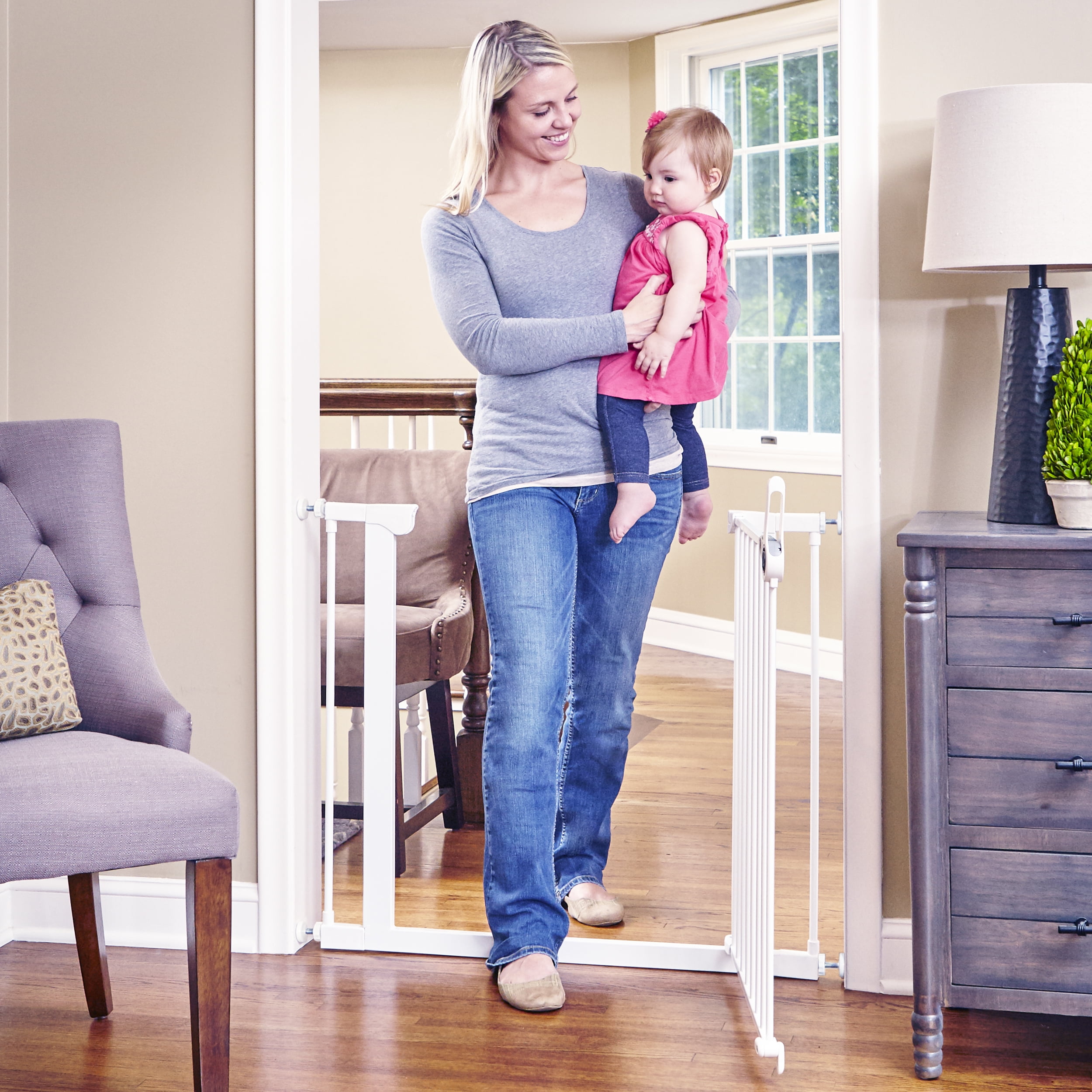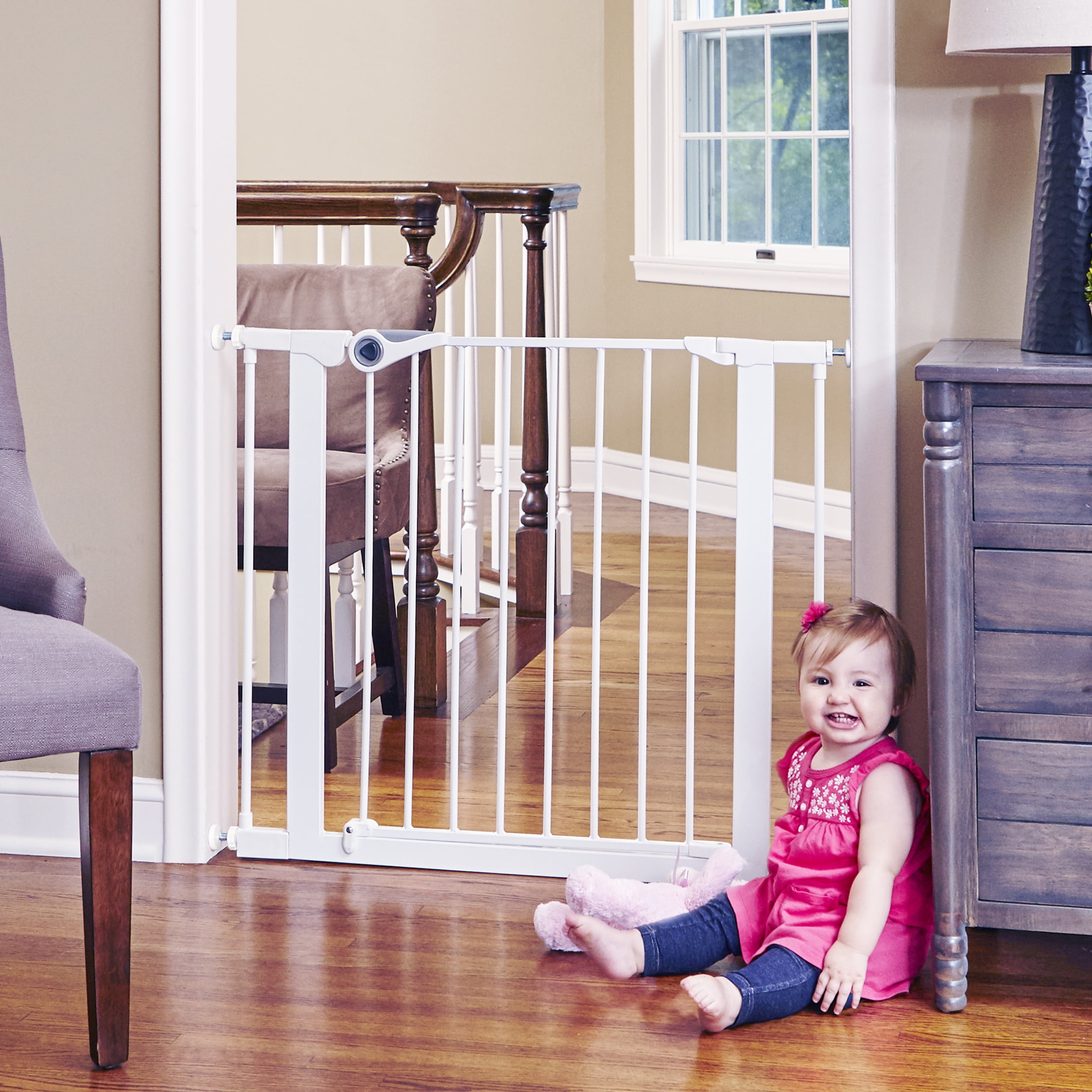 29.8″-38.1″ baby safety gate Intended for children ages 6-24 months Adjustable, pressure mount gate designed to fit in doorway or hallway opening or at the bottom of the stairs Features sturdy metal construction with a secure safety latch design and the option for one-handed operation Designed with a door stopper that keeps gate swinging in one direction or in both directions when not in use White color stylishly blends into home interior design 30 inches tall and expands 29.8-38.1 inches wide JPMA Certified and ASTM Certified