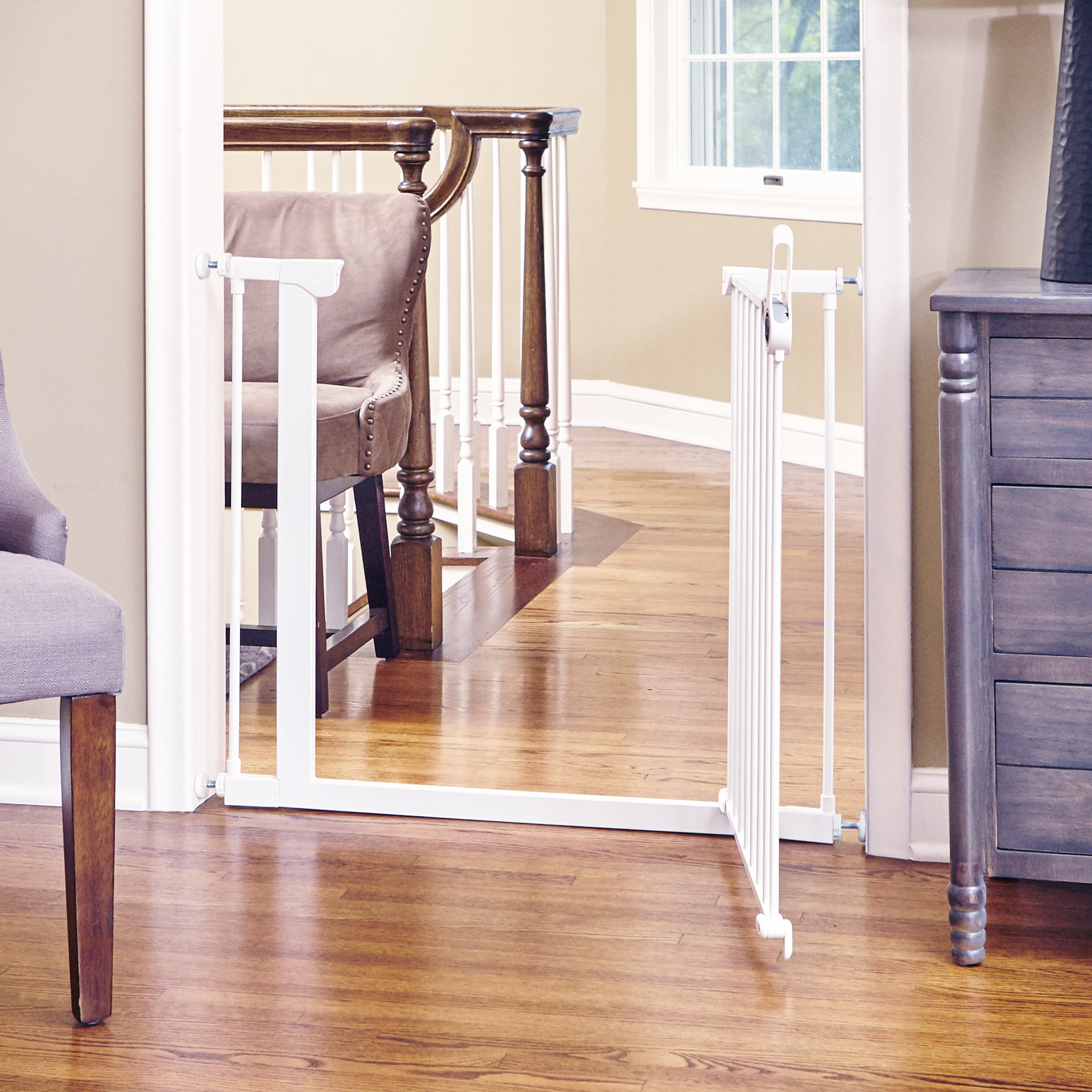 The Toddleroo by North States Essential Walk-Thru Baby Safety Gate helps keep your little explorer safe. Enjoy the ease of one-handed operation and the security of the safety latch design that this gate offers. For added convenience, this baby safety gate is designed with an extra-wide door and a gate stopper to adjust which way the gate swings. The Toddleroo by North States Essential Walk-Thru Gate is designed to fit in doorway or hallway openings or at the bottom of the stairs and expands from 29.8 to 38.1 inches wide and stands 30 inches tall. Plus, the white color will stylishly blend into your home décor. As your little one becomes more adventurous, you’ll love having the security and peace of mind this gate provides.