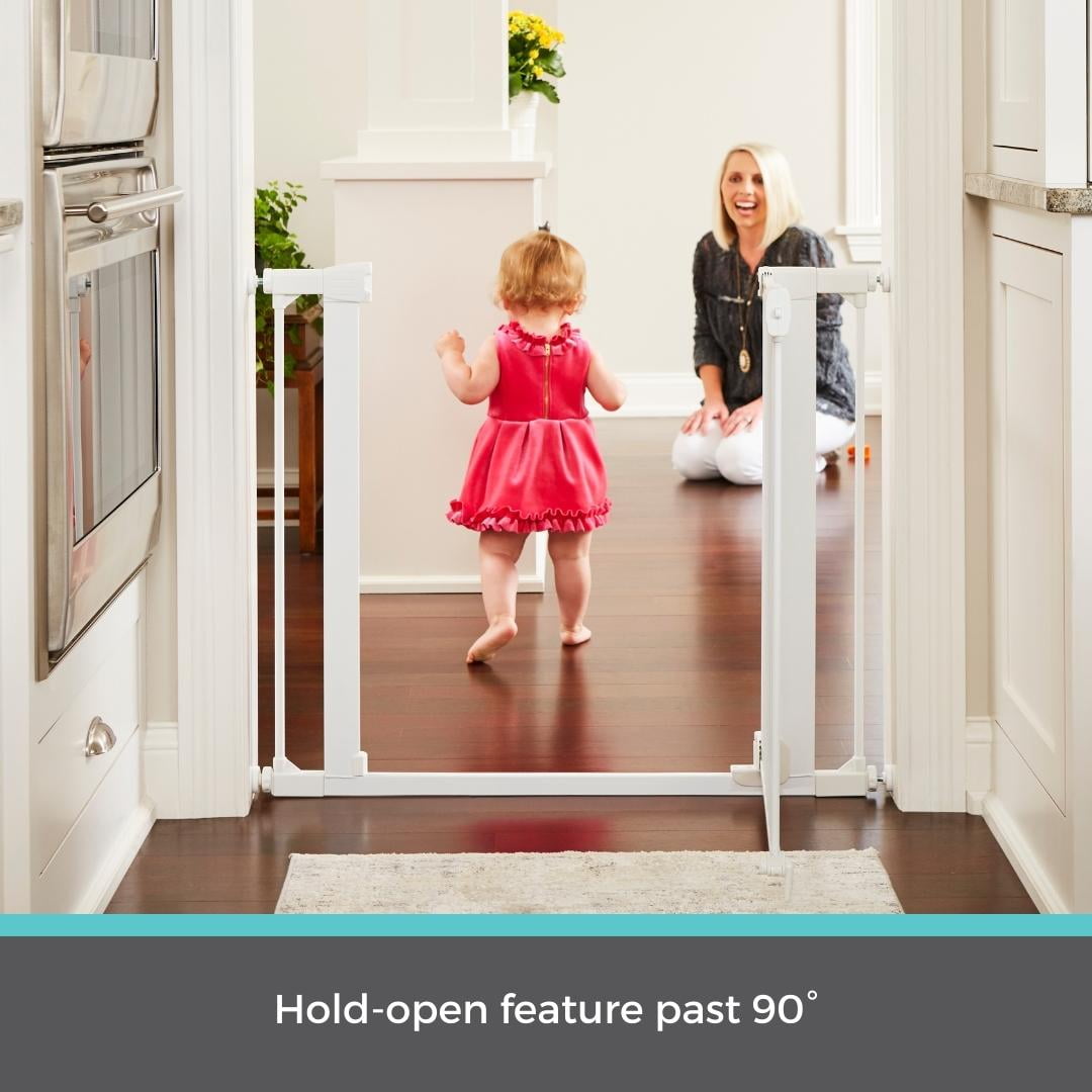 The Toddleroo by North States Bright Choice Auto-Close Baby Gate is the ideal safety gate for both day and night. The innovative glow-in-the-dark feature on this kids gate illuminates the large easy-grip handle, allowing you to see and open the gate in the dark. Easily mounting between rooms, hallways, or doorways, the safety gate’s extra-wide 22″ door provides plenty of room to walk through with ease while the gravity-fed hinge effortlessly closes it behind you. For those times when you want the gate to remain open, just move the door past 90 degrees and the hold-open feature will kick in. A swing control lever allows you to determine the direction the gate moves – easily swing in one direction, or allow the gate to swing in both directions when needed. The white finish of this gate will blend seamlessly with any home decor, while its heavy-duty steel construction is built to last. The Toddleroo Extra-Wide Bright Choice Gate is ideal for a variety of room openings or at the bottom of stairs. This white metal gate is 30″ high and fits openings 29.75″ to 52″ inches wide with three included extensions. Every Toddleroo by North States baby gate is JPMA and ASTM certified.