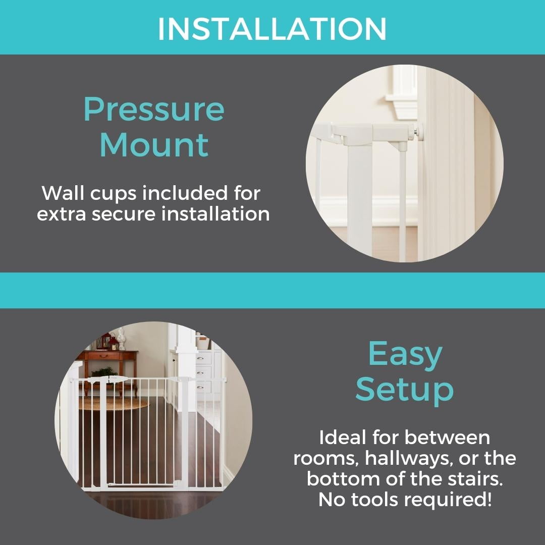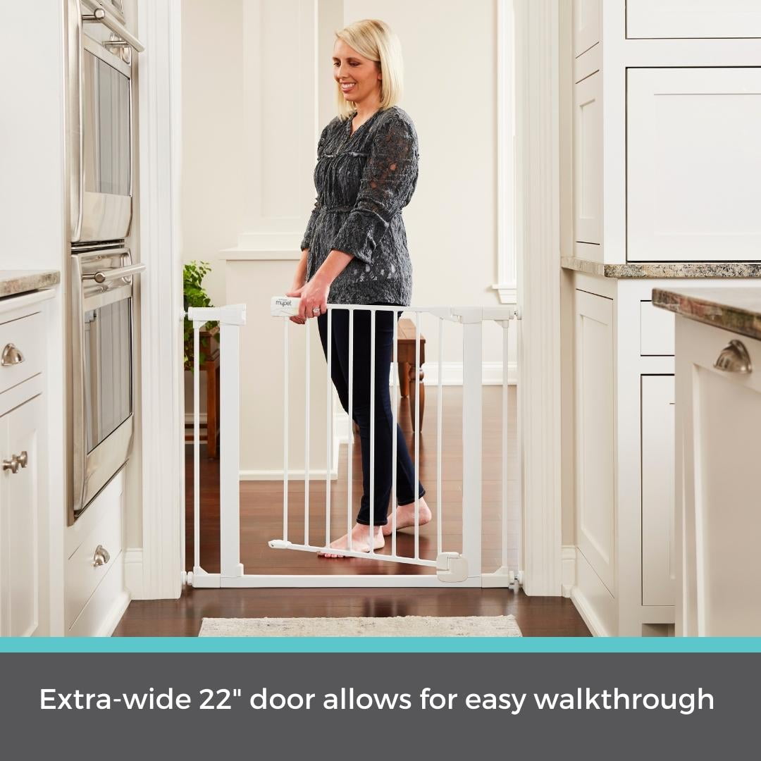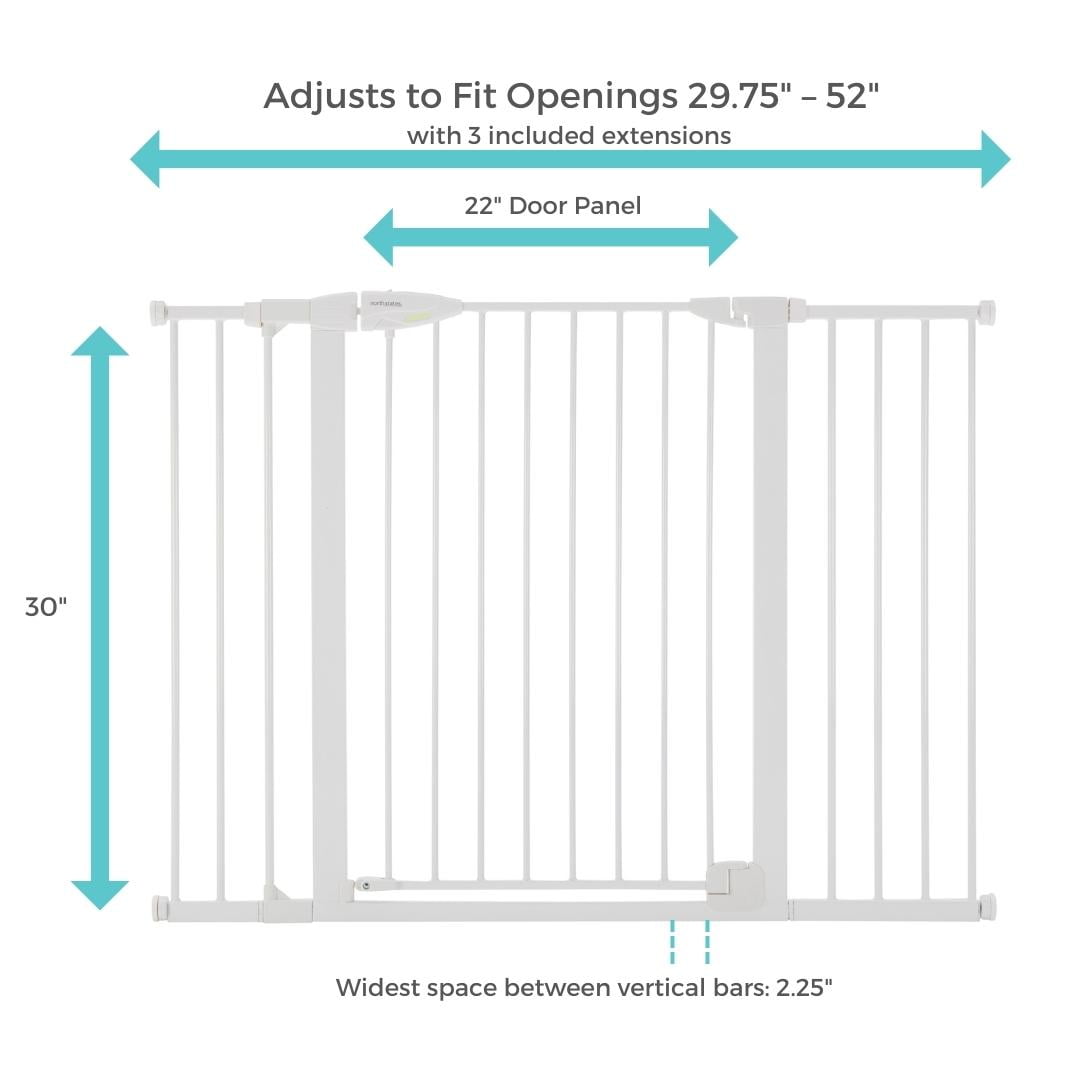 Adjusts to fit openings 29.75″ to 52″ wide and is 30″ tall Glow-in-the-dark, easy-grip handle allows one-hand operation in the daytime or nighttime Self-close door swings both ways and closes behind you with gentle release Hold-open feature allows gate to stay open when pushed past 90 degrees Extra-wide 22″ walk thru door compared to other gates at 16″ or 18″ To pressure mount, extend tension knobs until gate fits tightly Steel construction in a crisp white finish will complement any home decor JPMA Certified and ASTM Certified