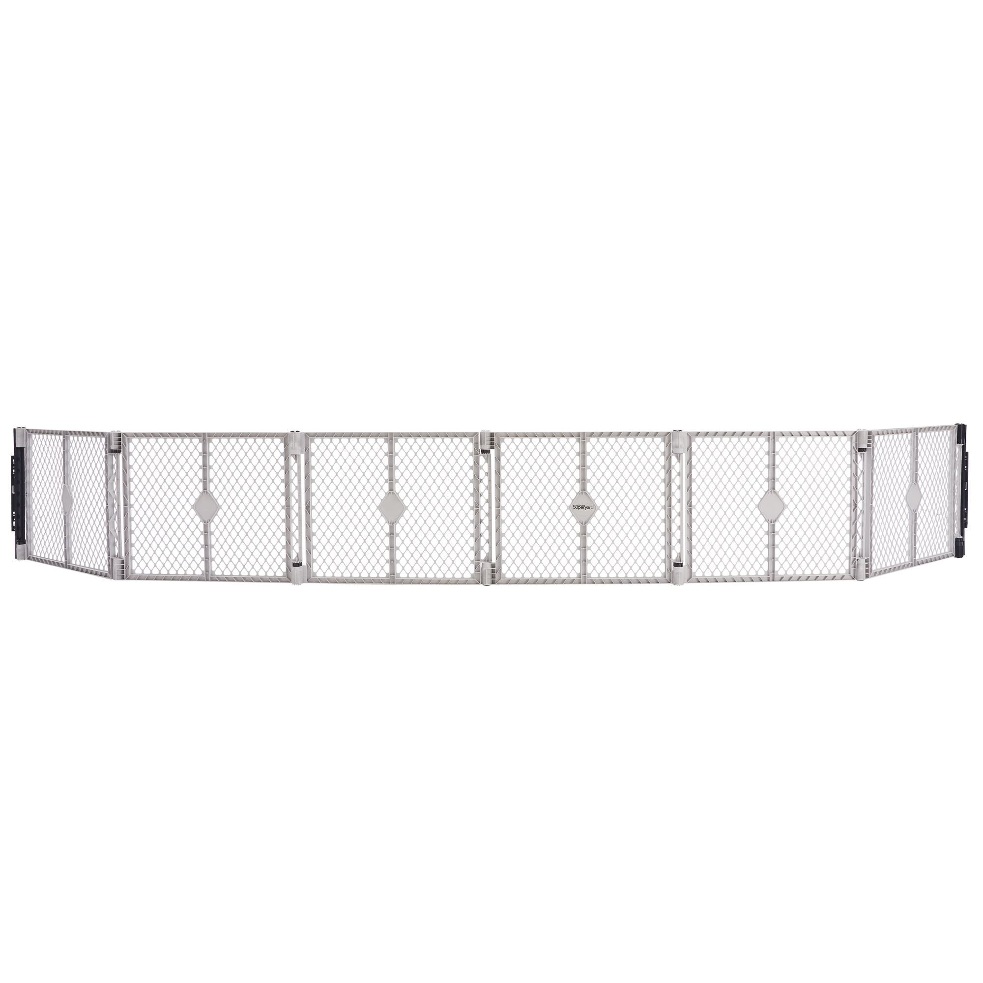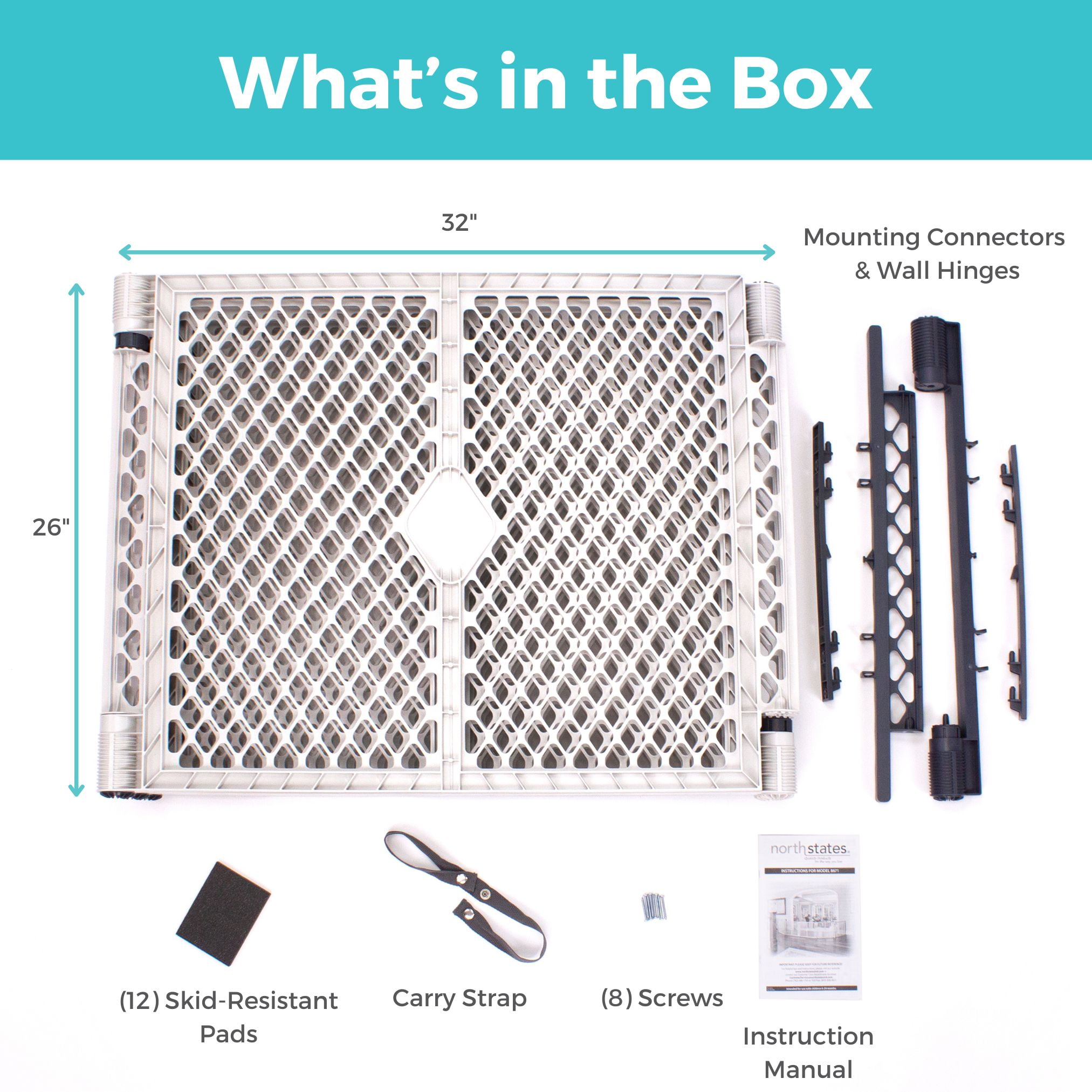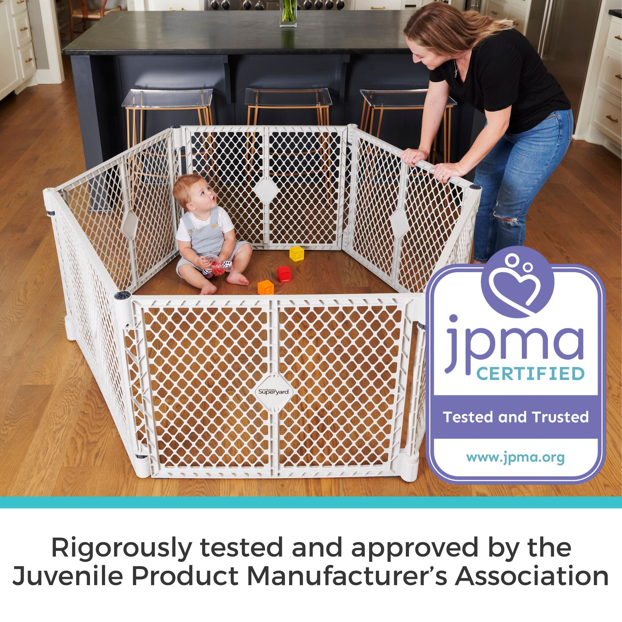 Freestanding play yard and wall mount kit for kids 6-24 months Six 26″ high panels form a large baby playpen over 5′ across or can be used a barrier for spaces 38.5″ to 16′ wide Must be hardware mounted into solid materials like wood, metal, or studs behind sheet rock Wall mount secures panels from wall to wall and fits over crown molding with ease Exclusive self-locking SuperHinges instantly and securely click in place and easily adjust Exclusive slide-resistant SuperGrip feet and skid-resistant pads help keep play yard in place and protect hardwood floors Folds quickly and includes carry strap for easy portability UV-design keeps color vibrant and ensures long-lasting durability during outdoor use Made in the USA JPMA and ASTM Certified