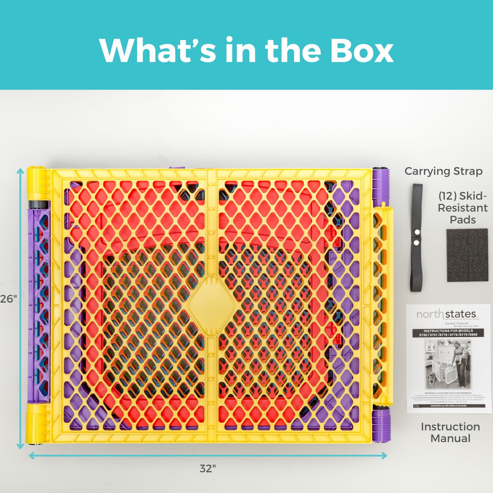 KEEPING TODDLERS SAFE SINCE 1953: Worry-Free Safety! Perfect for both indoor & outdoor use, the Toddleroo by North States Superyard Ultimate creates a safe playpen anywhere. Add the convenient Folding ABC Play Mat (sold separately) for added comfort during tummy time! AMAZING VALUE, SAFE & CONVENIENT: The Superyard Ultimate features an easy access door that opens easily with one hand. Just slide the latch back, lift the door up and out to open. Simply reverse this motion to close. VERSATILE & EXPANDABLE: This durable plastic six-panel play yard creates a protected play space up to 18.5 square feet. Want to increase the size? Just add a Two-Panel Extension (sold separately) to create up to 34.4 square feet of play space! EASY TO USE: This play yard sets up and folds up quickly. Comes complete with carrying strap and non-slip pads. BABY SAFE: This gate is JPMA certified. Safe for babies ages 6-24 months. Fun for your child, peace of mind for you! Proudly . DIMENSIONS: Encloses 18.5 square feet, 26″ tall