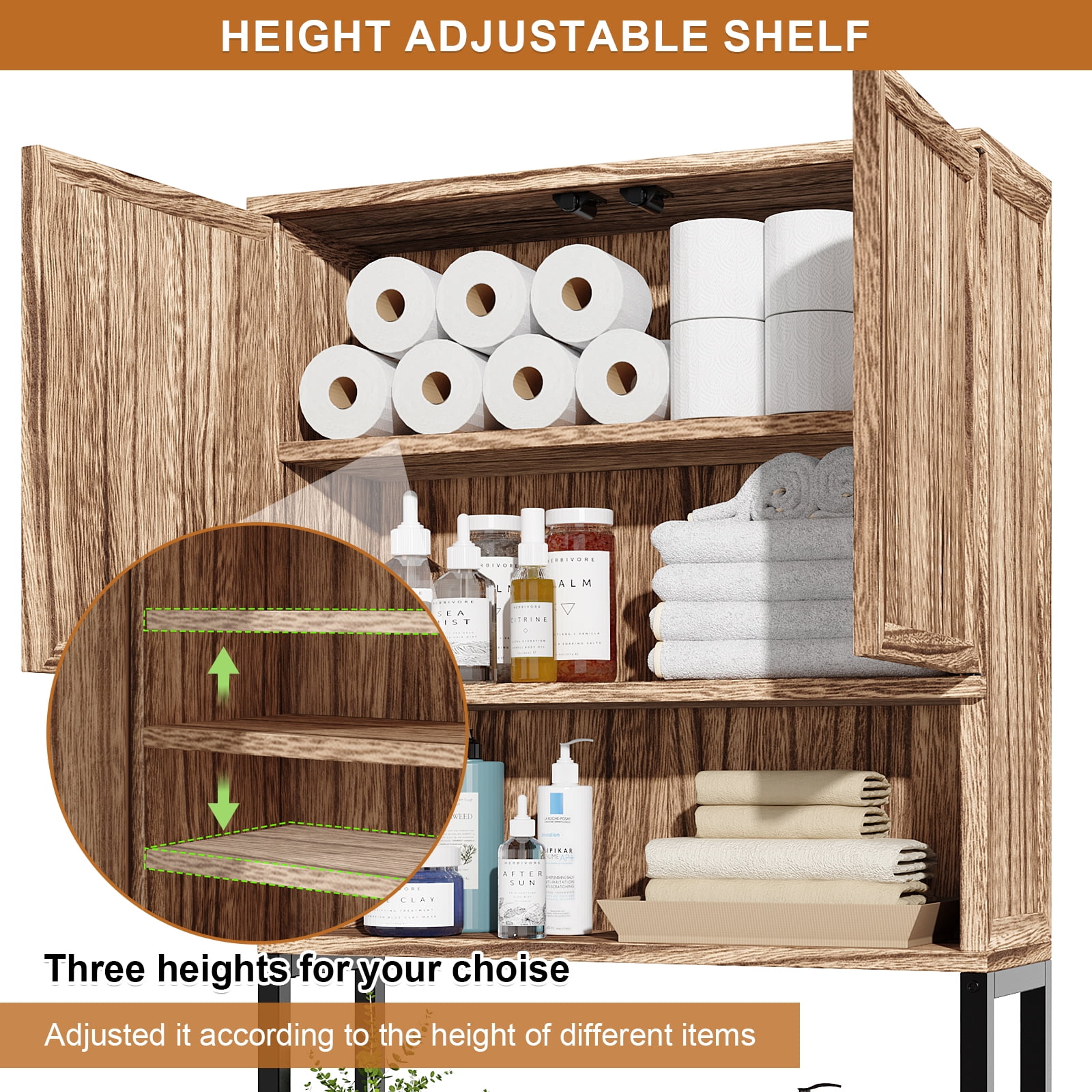Toilet Cabinet, Wood Toilet Bathroom Organizer Storage with Toilet Paper Holder, Hooks & Adjustable Shelf, Freestanding Toilet Storage with Anti-Tip Device, Rustic Brown