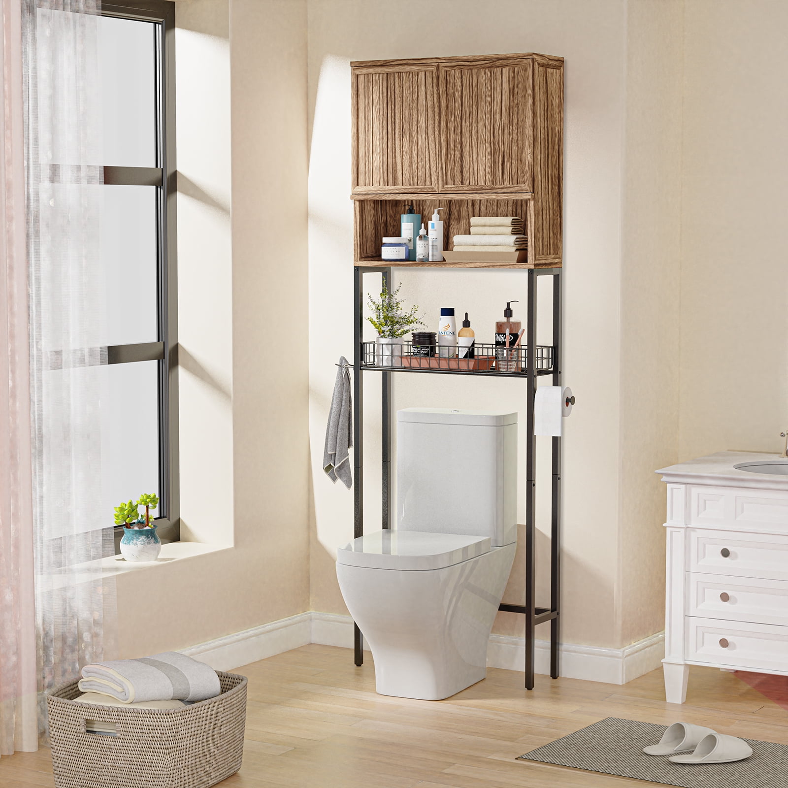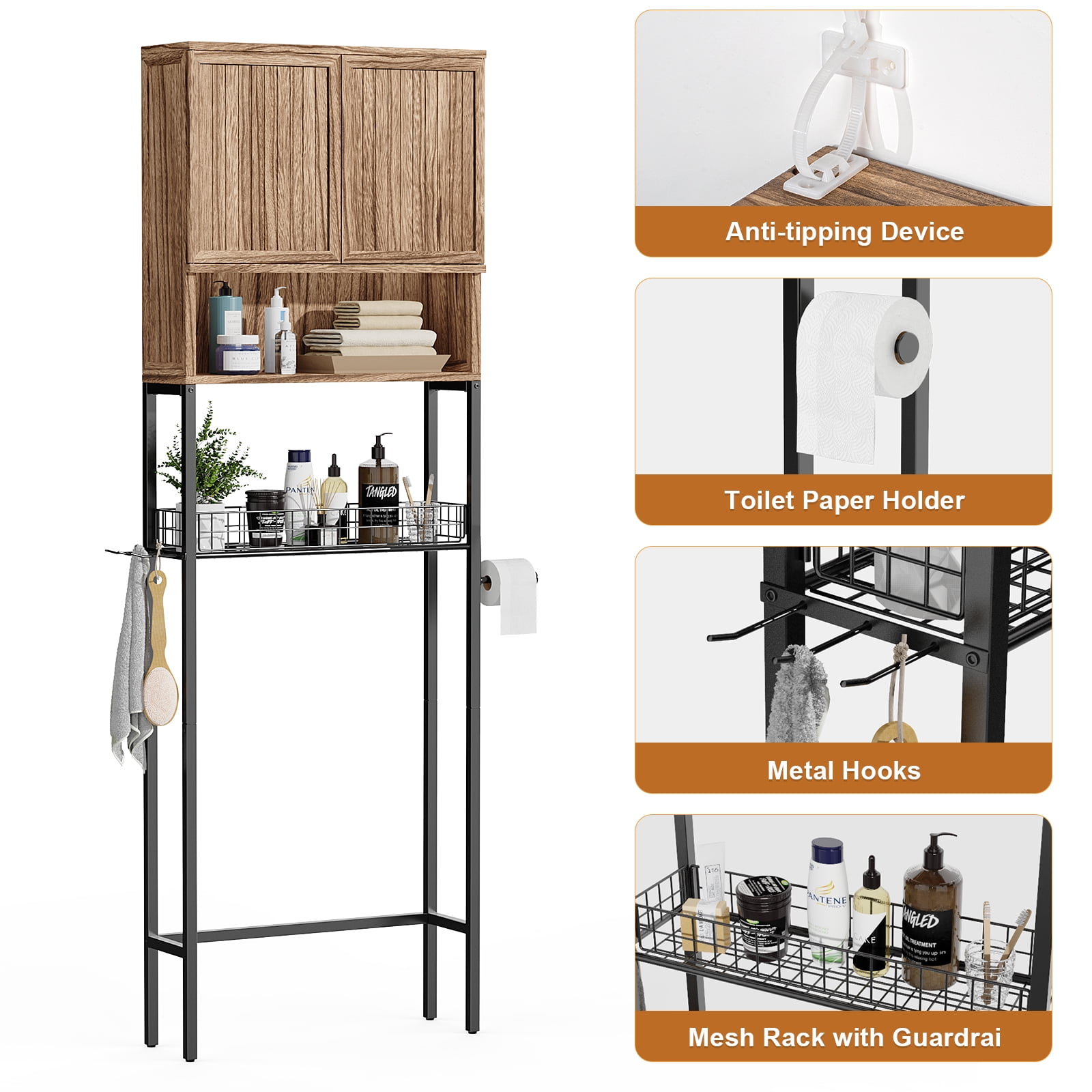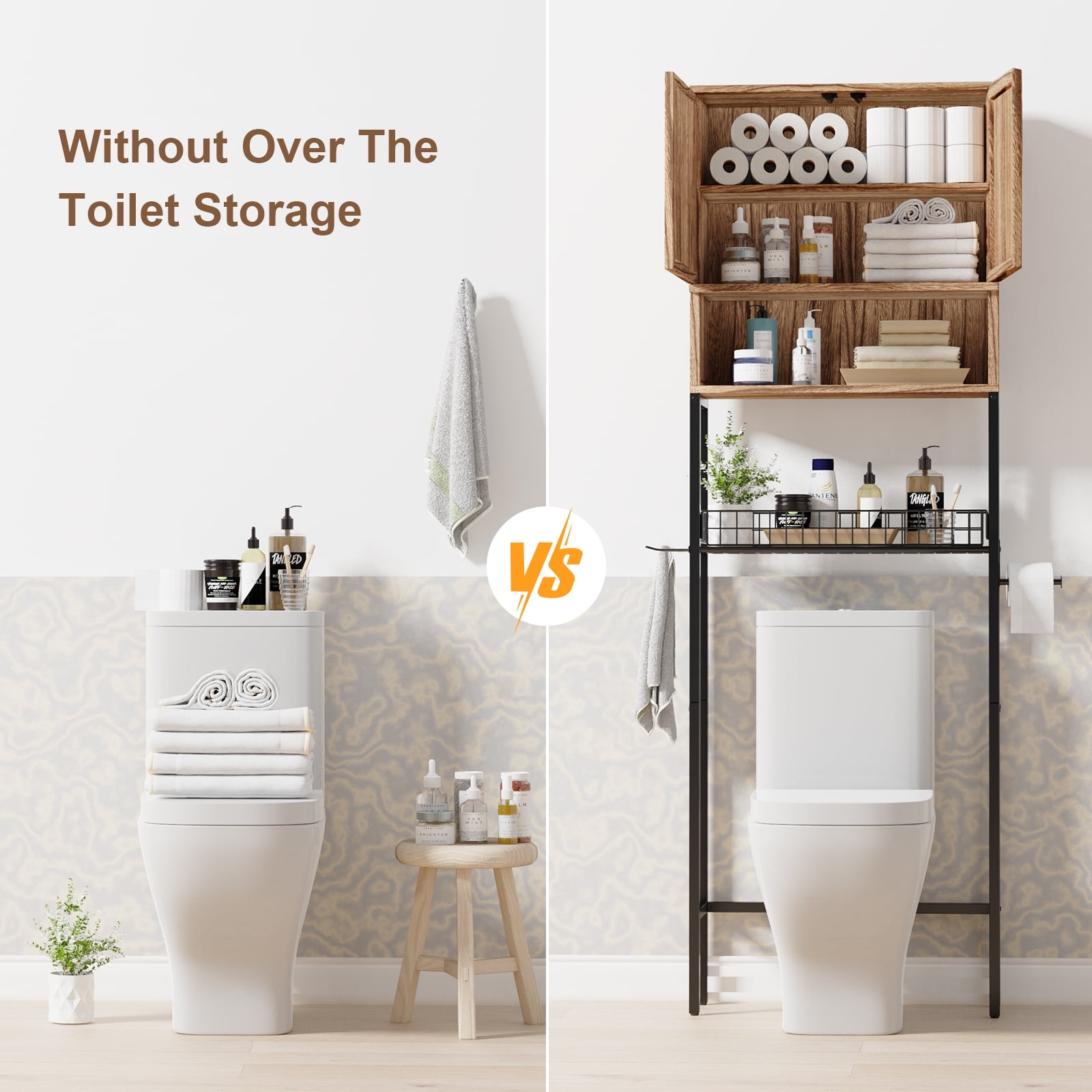 Ample Storage:Sfugno toilet storage can provide plenty of space to help you to store bath essentials, like toilet paper, towels, shaving-foam, shampoo, shower gel, soaps, skin care products and hair dryer, etc. It can help to keep your toiletries organized without taking up too much floor space. Adjustable Shelf:This over the toilet storage cabinet features a storage cabinet with 2 doors store and protect your personal belongings from dust. The interior is featured 3-position adjustable shelf that moves up and down or out to place items of different sizes. Besides, the additional open wood shelf and mesh rack with guardrail for easy access or display. The mix of open and concealed storage brings more flexibility to your daily storage. Stable & Safe:Made of soild wood and black metal frame.And this bathroom shelves over toilet is equipped with anti-tip device, which would protect you and your family from being hurt by securing the cabinet stand to the wall. Multi-functional:Overall dimension is 23.6*3.3*71.2 inches. The mesh rack with guardrail is 35.4 inches from the floor, this bathroom over toilet storage not only fits most toilets but also suitable for multiple scenes. Besides bathroom, it is also great for your laundry room, drying room, balcony, etc. Easy to Assemble:Detailed install instructions will guide the assembly step by step. All parts and accessories of the over toilet storage cabinet are numbered and easy to distinguish. And the overall surface of the bathroom cabinet over toilet is painted in a waterproof process, you can spend little time on post-cleaning.