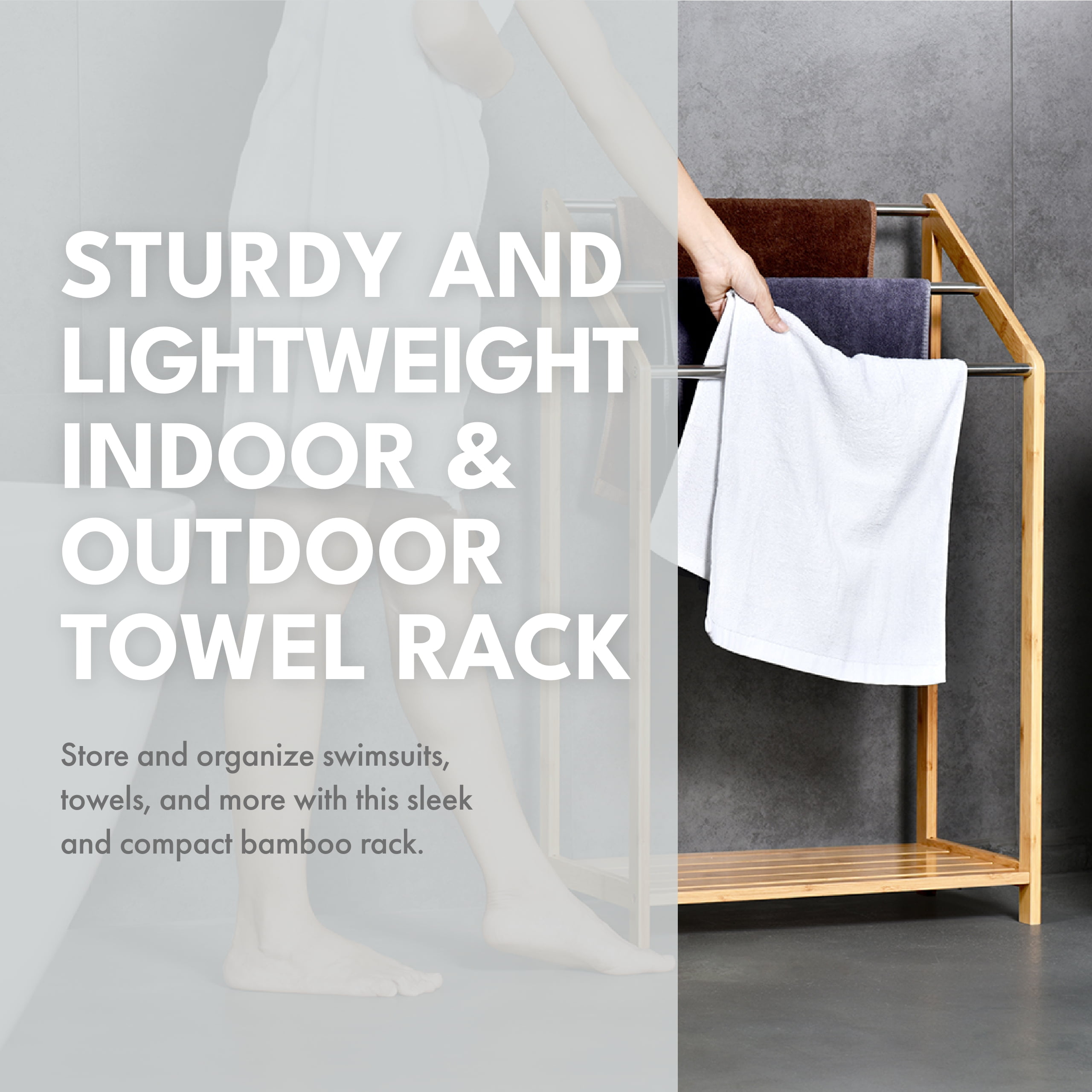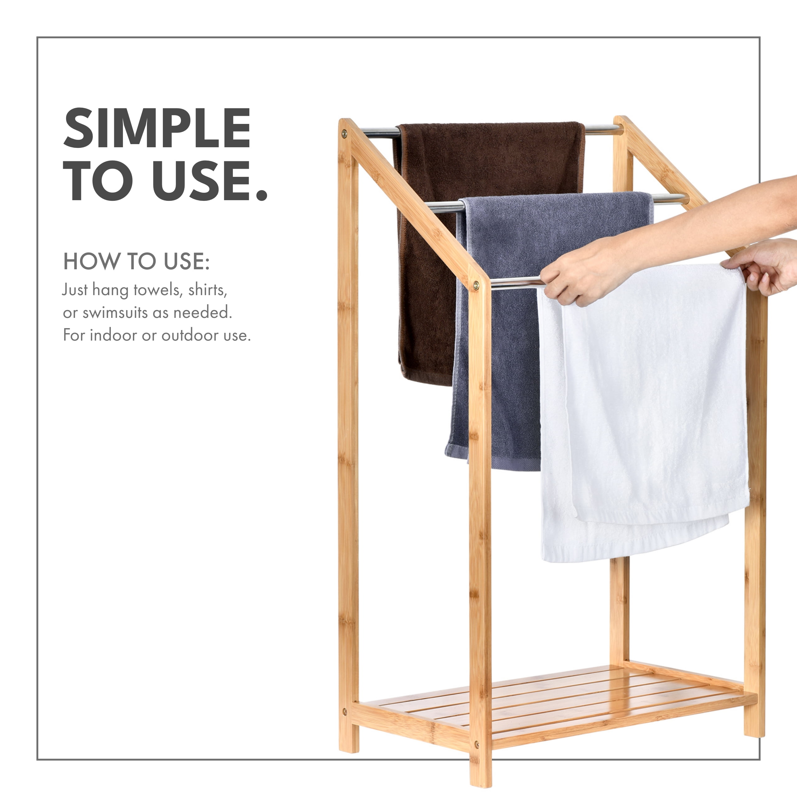 3-tiered bathroom towel rack with a bottom shelf Compact and space-saving design Durable construction suitable for indoor and outdoor use Made from eco-friendly bamboo wood Functions as a towel rack, clothes rack, or swimsuit holder