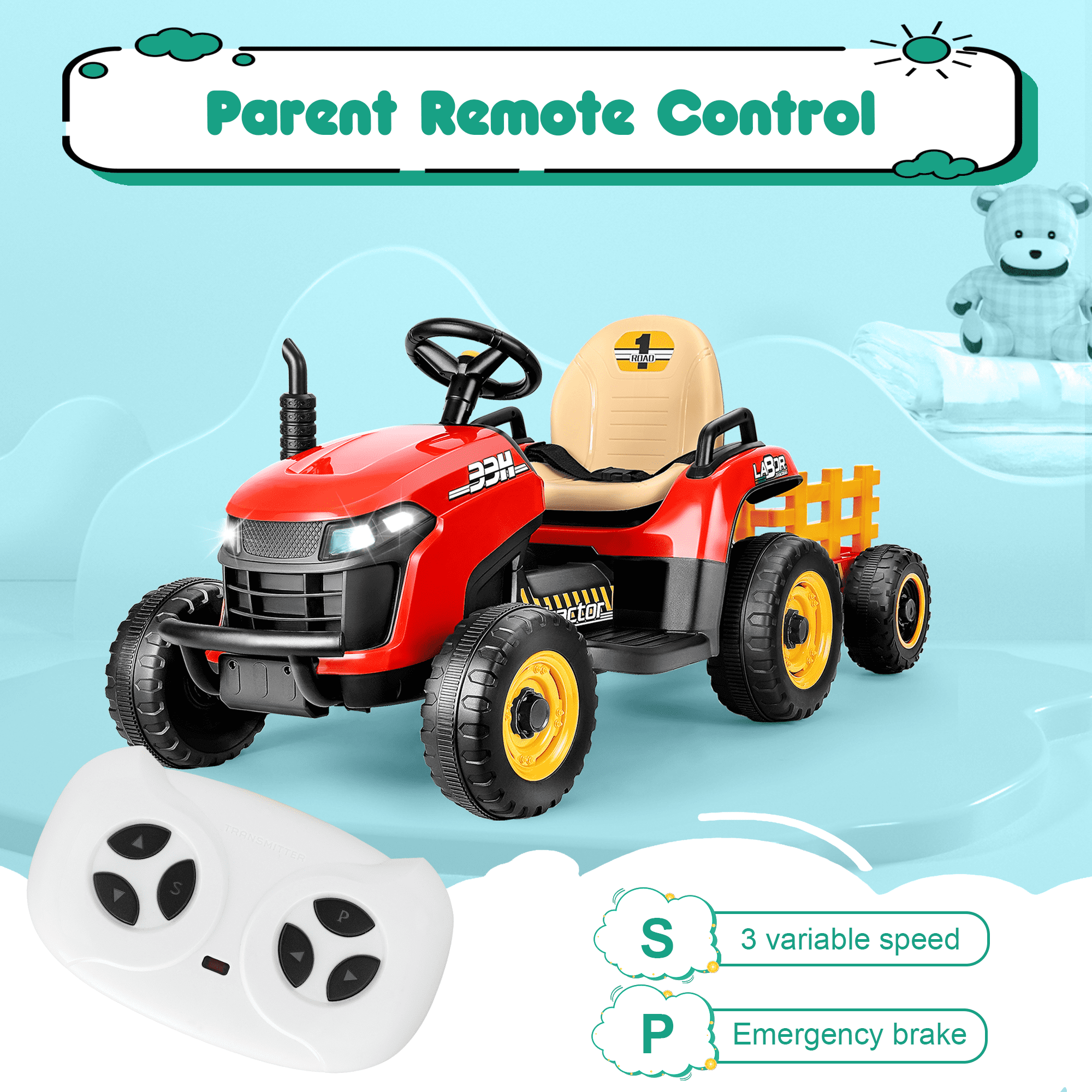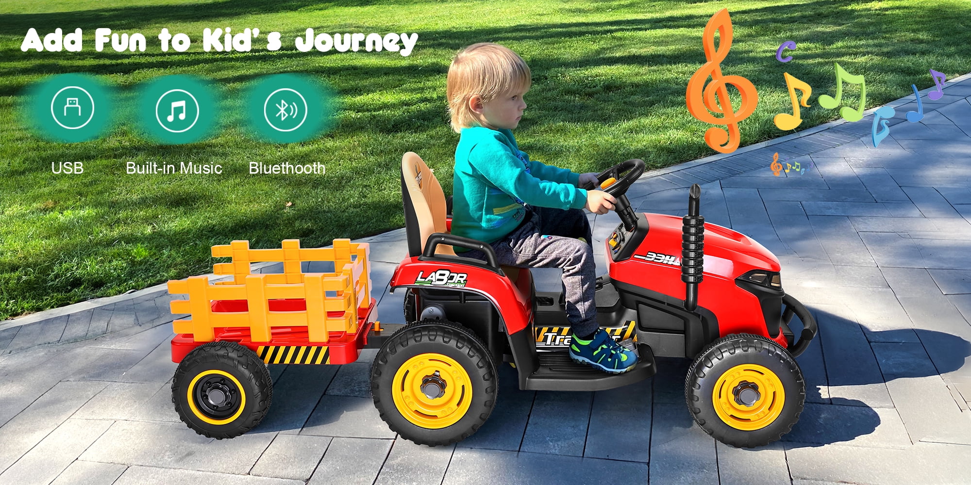 ????12V Ride on Tractor Assembly Video ✅【Specification】 Color: Blue/ Yellow/ Red/ Green/ Pink Material: PP Plastic, Iron Overall Dimension: 55.5″ x 23.5″ x 22.5″ (L x W x H) Item Net Weight: 33 Lbs Weight Capacity: 66 Lbs Seating Capacity: Single Seater Suitable Age: 2-5 Years Old Speed: 1.8-3.3 Mph Battery: 12V 7Ah Motors: 2 x 45 W Charging Time: 8-12 Hours Running Time: 1-2 Hours Battery Type of Remote Control: 2 x 1.5V AAA Batteries (Not Included) Package Includes: 1 x Kid Ride on Car 1 x Remote Control 1 x Charger 1 x Instruction 【Tippable & Detachable Trailer】????????????Easily attaches and detaches from the 12V battery powered ride on tractor for versatile play options. Providing additional storage space for carrying toys, tools, grass, straw or other items. Enhances the realistic farming experience for children as they transport goods. Promotes physical activity and coordination skills as children tow and unload items. Adding an extra element of fun and functionality to the ride-on tractor. 【Two Driving Modes】????????????Let your kids go on a fun-filled adventure. Has a gear-shift handle which corresponds to 2 forward gears and one reverse gear. Your children can easily start the electric car by pressing the power button and ride it forward or backward. For interactive playtime, parents can use the 2.4G remote control to steer this ride on toy vehicle move forward under 3 different kind of speeds-Max 3.3 Mph. 【Upgraded Power System】????????????This kids ride on tractor is equipped with dual rear motors power configuration,12V Rechargeable Battery and upgraded wear resistant wheels which can provide stable traction on various roads, including asphalt road, brick road and cement road. After a full charge it can offer 1-2 hours playtime, bringing children endless fun. 【Realistic Riding Experience】????????????This ride on tractor is built in a realistic starting roar , it will give your little one more realistic experience. Restores the elegant design details of the real Agricultural vehicle with features such as bright LED lights, built-in music and it also comes with power indicator lights in dashboard , which is convenient for parents to charge the car in time. 【Child Safe and Friendly】????????????Made from kid-friendly PP material,this kid ride on car is not harmful to your children’s health. This tractor equipped with soft-start function and adjustable seat belt is sturdy to load a maximum weight of 66 lbs, bringing kids a safer and more interesting driving experience.