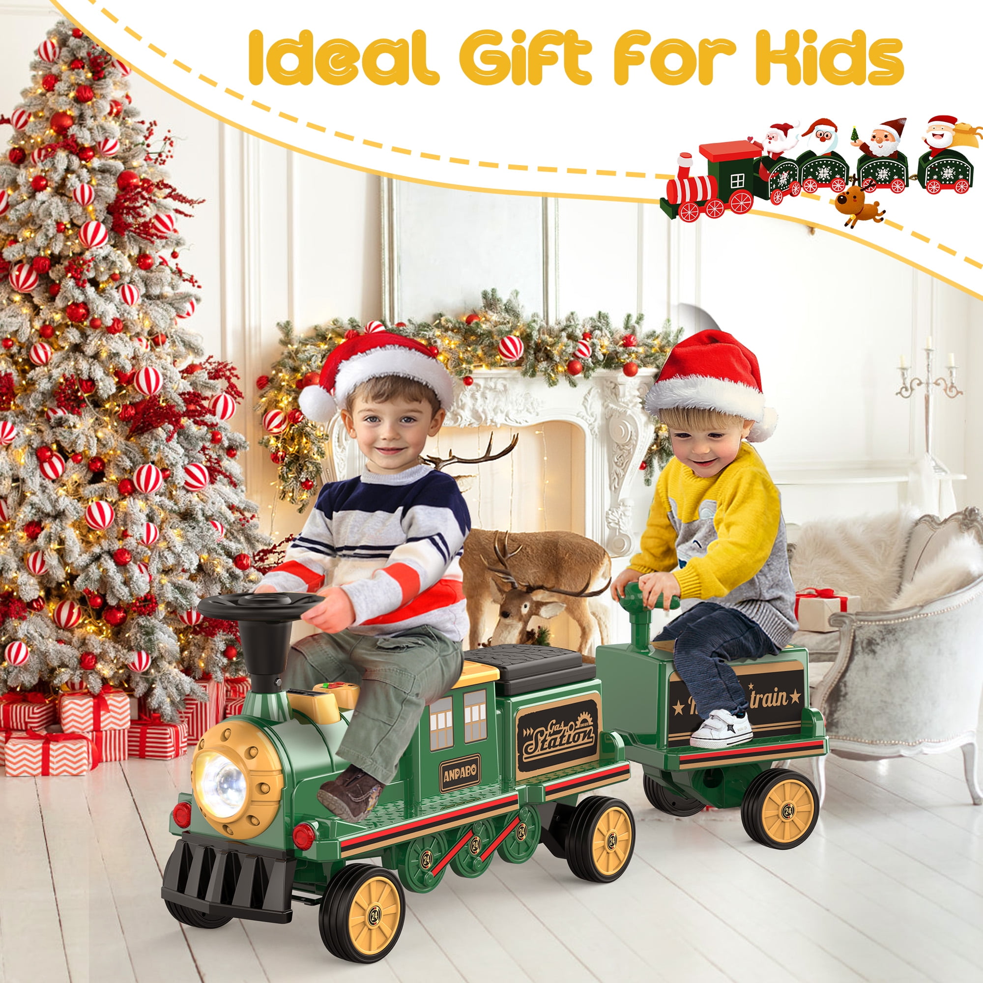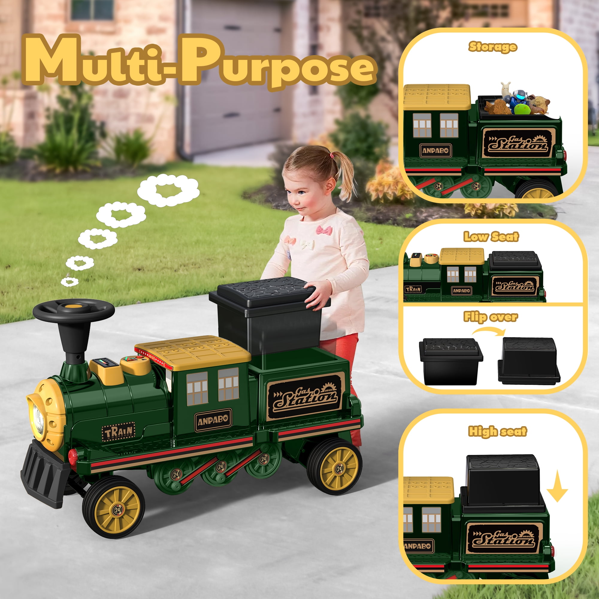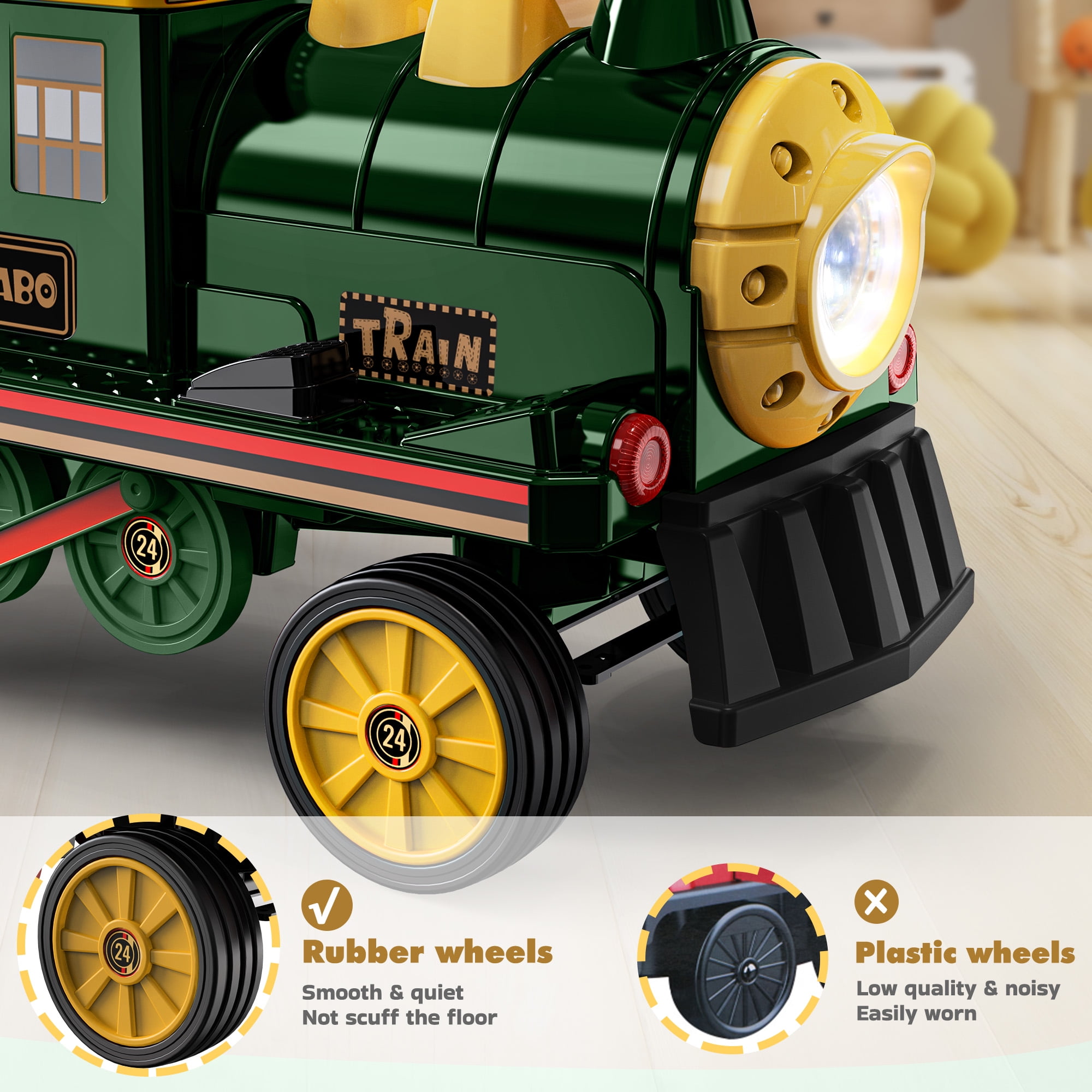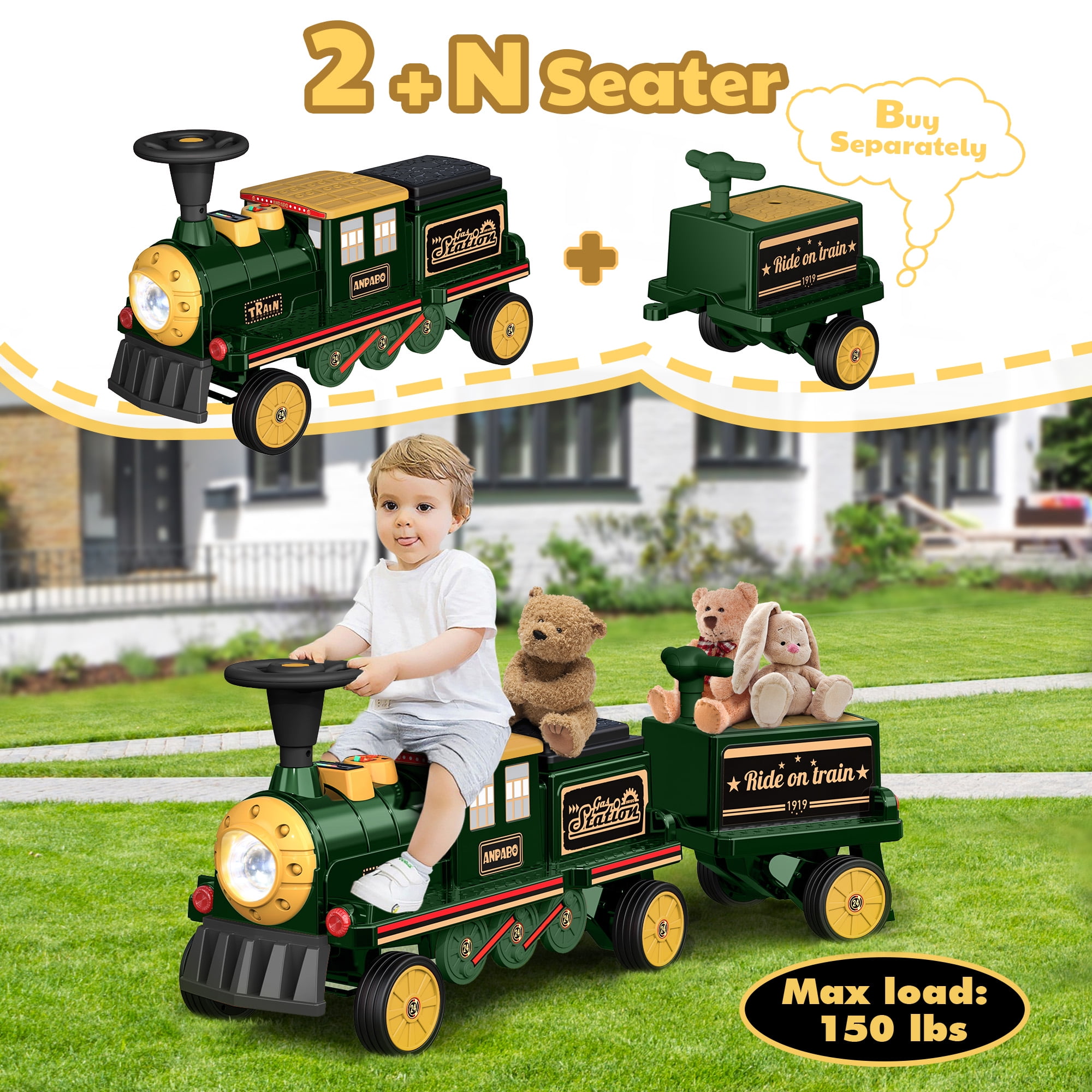 ????Installation Video for Ride on Train: 12V Ride on Train 【Easy to Ride】⭐⭐⭐Grant your adorable little kids the thrill of driving by simply pressing the pedal and taking the steering wheel. It’s a breeze to maneuver, and 2 speeds switchable to keep the speed between 1.86Mph -3.1Mph which ensuring a worry-free experience for both toddlers and Children. [????Plz note the product includes only one train locomotive, Train Carriage need to be purchased separately. ] 【Storage Convenience】⭐⭐⭐Discover the hidden treasure of a storage room beneath the seat, the perfect spot for storing small toys, snacks, and other essentials. Your child can pack their imagination, snacks, and more for the ultimate explorations. Let your child’s imagination soar as they bring along their favorite companions on their journeys. 【Endless Fun Journey】⭐⭐⭐ This ride on toy train, an incredible gift that mirrors the appearance of a real train and even emulates the authentic sound of a train starting. The added LED headlight, Music player, and lifelike Horn amplify the excitement, turning each ride into an unforgettable adventure. 【2 Seater for Entertainment】⭐⭐⭐With its rubber wheels gliding effortlessly, our ride on car promises smooth rides on various terrains like indoor floors and outdoor asphalt road, side walk . Two seater mean twice the joy , making it perfect for siblings or friends to share countless happy moments together. And the height adjustable and wide seat guarantees which is more comfortable for older brothers or sisters, enhancing your child’s driving experience. 【Rubber Wheels for Durability】⭐⭐⭐Built to last, our 12volt ride on train boasts wear-resistant 4 wheels made from premium rubber materials. Its robust construction ensures long-lasting enjoyment while providing the utmost safety for your child’s riding adventures. 【Superior Safety Standards】⭐⭐⭐With a commitment to your child’s safety, our ride on toys come with Children’s Product Certificate (CPC), ASTM F963 & Lead and Phthalates Testing (CPSIA), made from kid-friendly non-toxic and harmless PP material that is not harmful to your children’s health. Let your little one explore and play while you have peace of mind.
