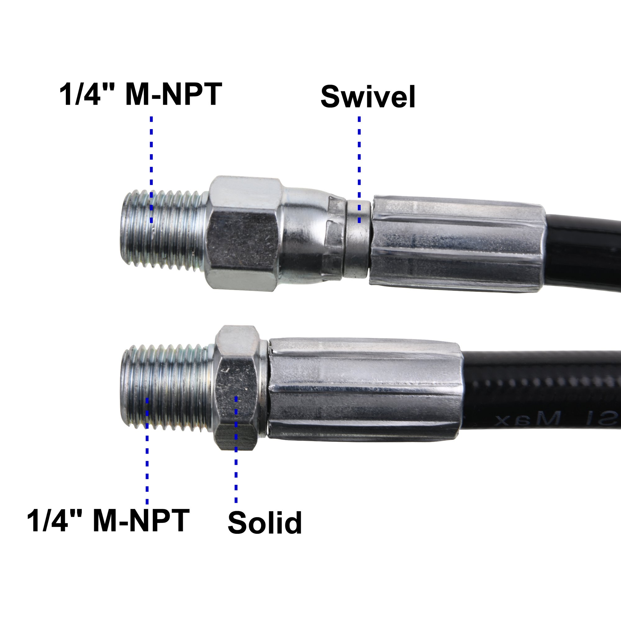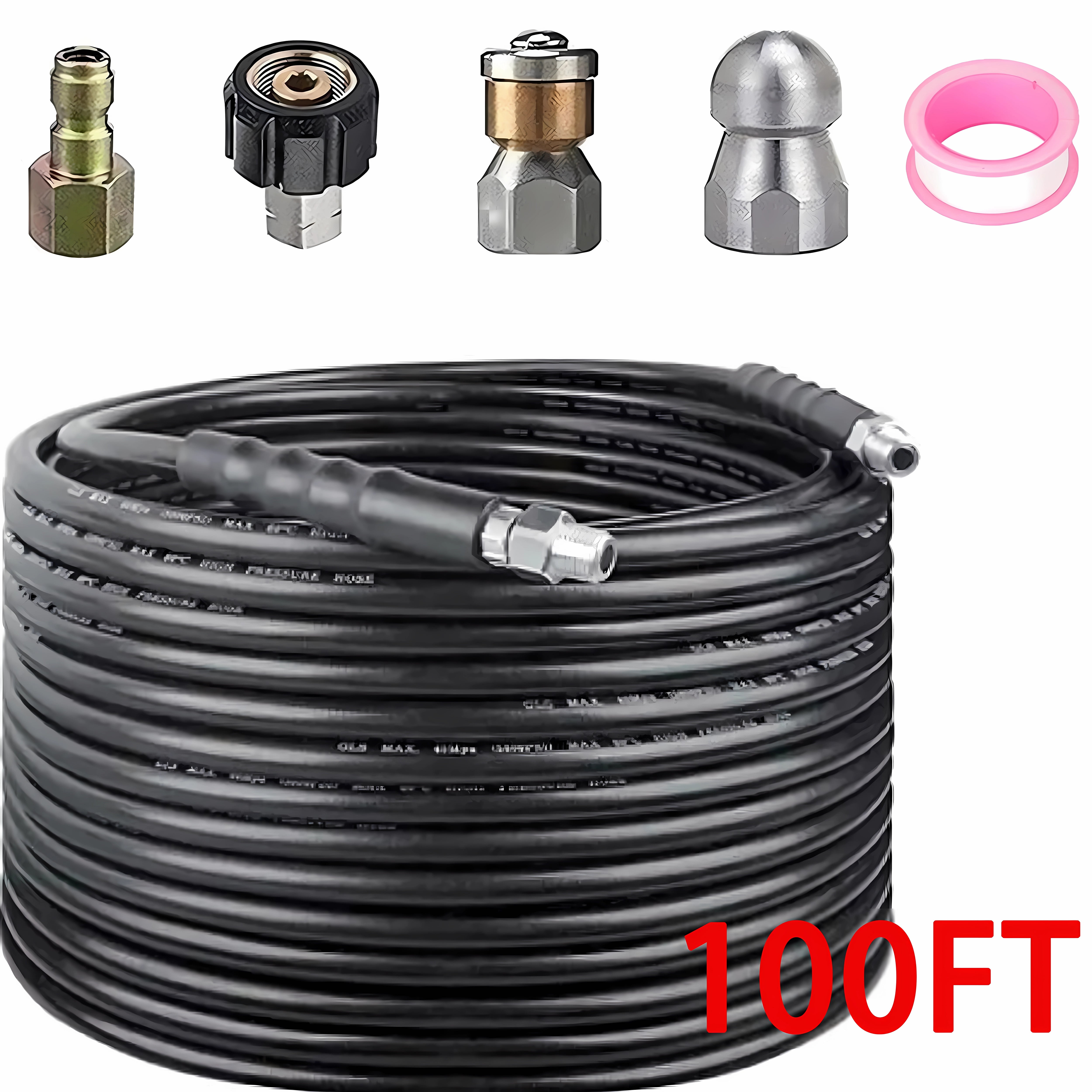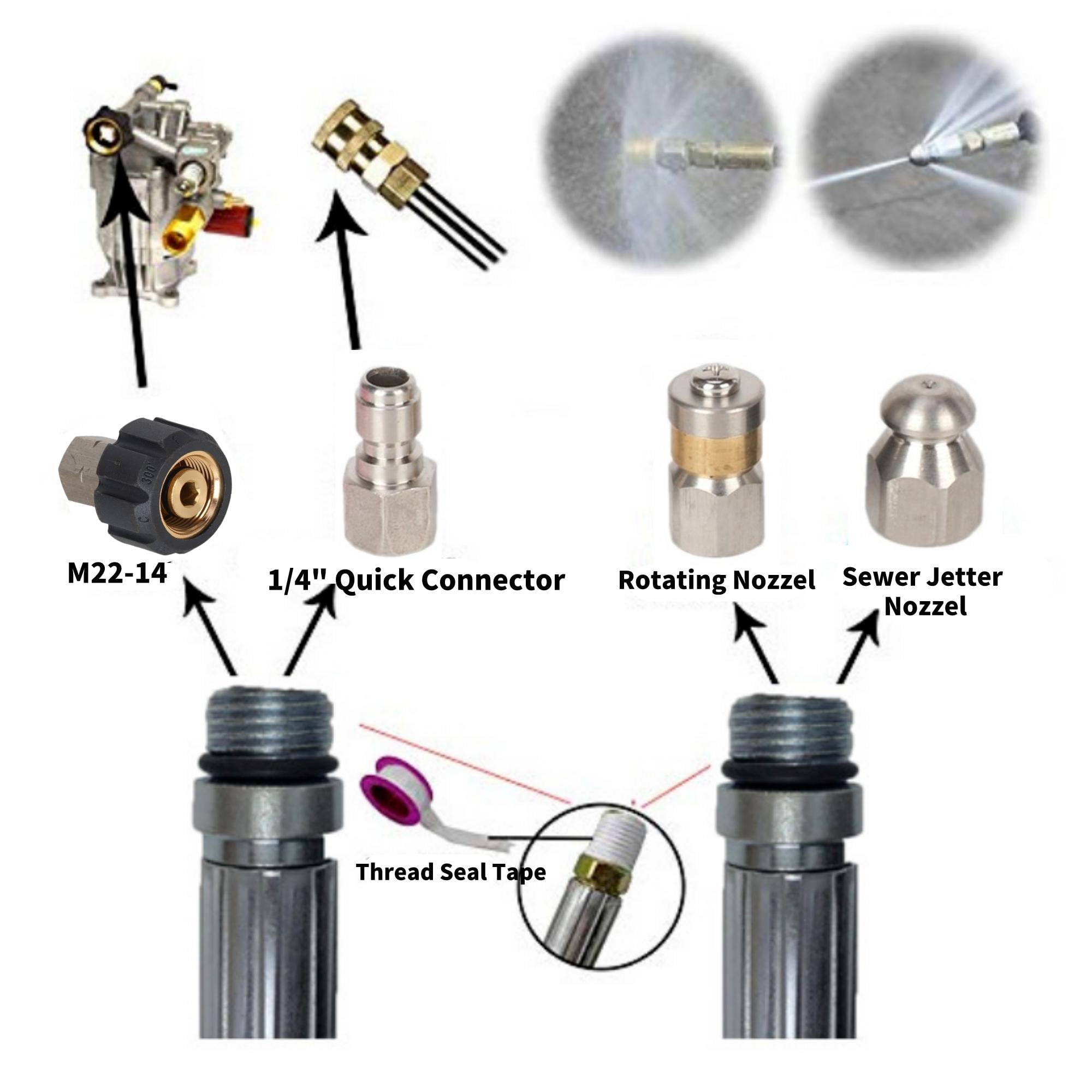 Upgraded Sewer Jetting Hose- 1. Tonchean upgraded sewer jetter hose has an explosion-proof net added to the inner layer, which is made of steel mesh, which can bear greater pressure and prevent the hose from exploding. 2. Inner tube is made of thermoplastic polyester, which provides strong toughness.Cover layer is made of thermoplastic polyurethane, which can resist oil, weather, ozone and abrasion. There is a protective cover on both ends of the hose to prevent the end of the hose from disconnecting. Professional Sewer Jetter Kit- Tonchean sewer jetting kit includes sewer jet hose 100 FT,button nose sewer jetter nozzle, rotating sewer jet nozzle,1/4’’ quick coupler plug,coupler (female M22 to female 1/4’’ NPT) and waterproof tape. High Adaptability- Tonchean sewer jetter parts for Pressure Washer can help you unblock More types of indoor and outdoor drainage devices, combined with any brand of pressure washer, can easily flush obstructions.Working pressure is rated to 5800 PSI. Burst pressure is rated to 11000 PSI. Button Nose And Rotating Nozzle- 1. Button Nose 4.0 Orifice.1 front jet at 0°that clears blockages.3 rear jets at 33° flush out debris loosened by the front jet.1/4″ Female Fitting – Fits 1/4″ NPT male sewer jet hose fittings. 2. Tonchean rotating Sewer Jetter Nozzle 3 backward rotating spray blasts into clogged pipe and moves the nozzle through pipe. The nozzle is easy to slide into drain pipes and sewer lines.The orifice is 4.5.Fits sewer jet hose with 1/4″ male end. 1/4″ Female NPT Fitting. Quick Connect Plug And Female Metric M22 to 1/4 Inch Female NPT Fitting- 1. Quick Connect Plug used in a lot of situations where high pressure connections are frequently assembled or disassembled.Ideal for quick exchange of pressure washer outlet, sewer jetter hose, guns and nozzles. 2. It makes a solid connection with quick coupler each time.Pressure washer coupler convert metric M22 14mm female NPT thread to 1/4″ Female NPT.