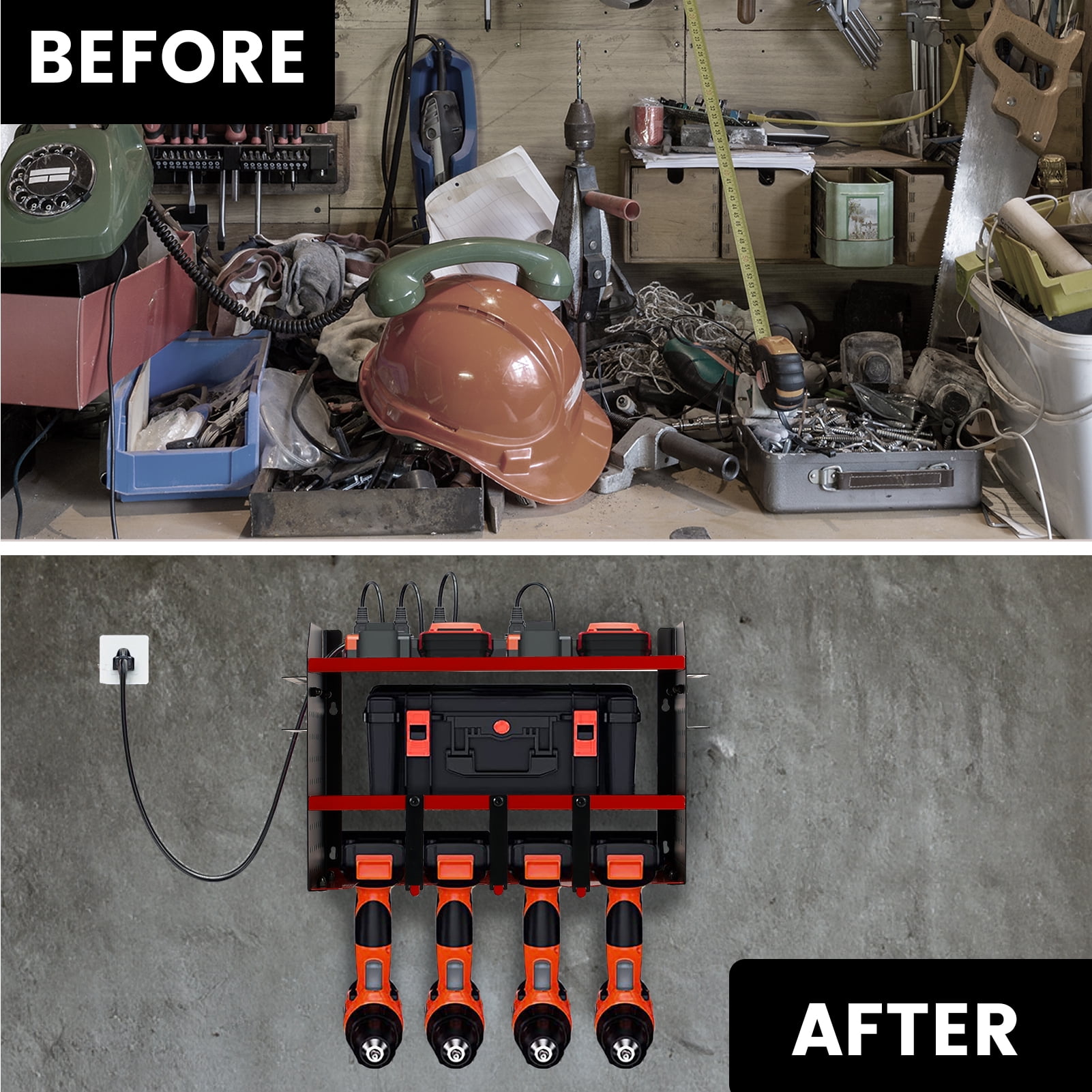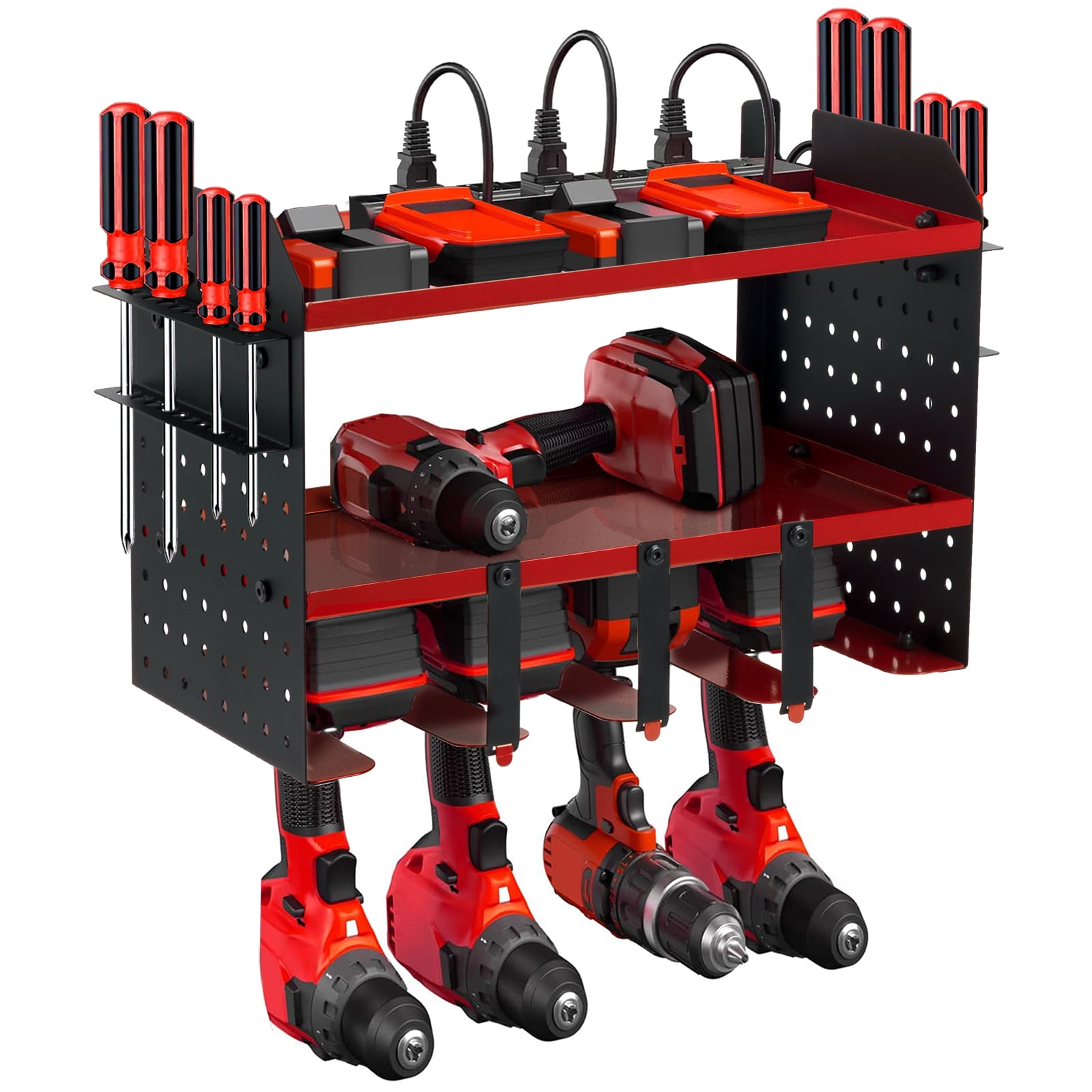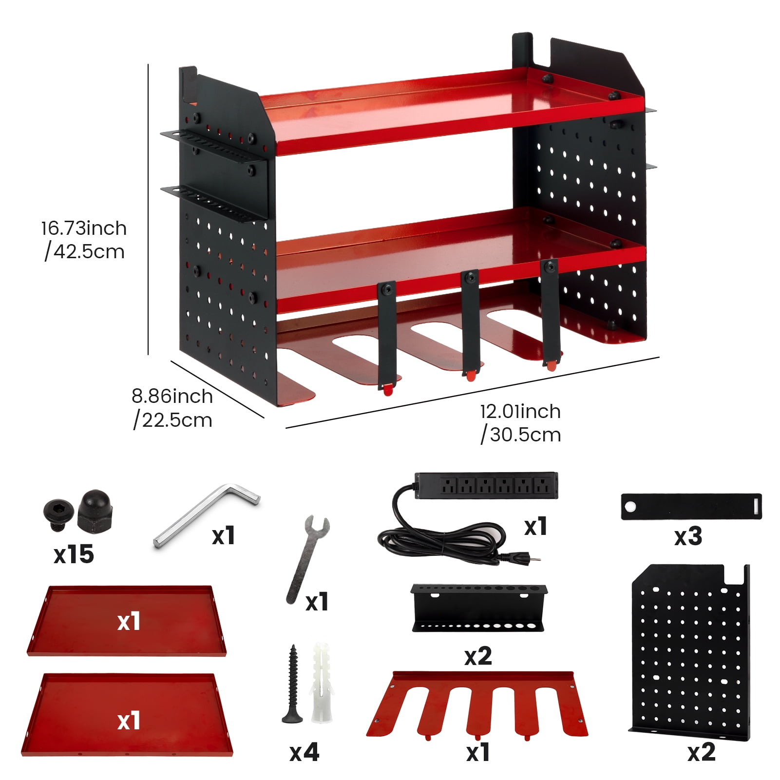 Features: 【Power Tool Organizer with Charging Station】Equipped with 6 sockets,6.56 ft power cord to meet your needs for convenient charging of many charging tools and cordless electric drill batteries. The heavy duty designed power tool rack will help you load multiple heavy tools using all 4 wall anchors. 【Efficient Organization】Keep your power tools neatly organized with this power tool organizer. With designated spaces for each tool, you can easily find and access the tools you need, saving you valuable time and effort.Extra side slots allow you to organize more things, you are sure to get a satisfactory solution plan. 【Wall Mount Design】This tool organizer is designed to be mounted on the wall, maximizing your garage space and creating a clutter-free work area. By utilizing vertical space, you can free up valuable floor space for other storage needs. 【Durable and Sturdy】Made from high-quality materials, this organizer is built to last. It can withstand the weight of various power tools, ensuring long-term durability and reliability. The black and red design adds a touch of style to your garage or workshop. 【Easy Installation】With the included mounting hardware and clear instructions, installing this tool organizer is a breeze. You can quickly set it up on any wall in your garage or workshop, providing immediate organization for your power tools. 【Versatile Usage】This power tool organizer is suitable for a wide range of power tools, including drills, saws, sanders, and more. Its adjustable design allows you to customize the storage space according to your specific needs, ensuring a perfect fit for your tools. The side hole version design allows you to add hooks to expand storage space. Ideal for Garages, Homes, Sheds, Workshops, Backyard Shops, and etc. Specifications: Material: Iron Color: Black and Red Mounting Type :Wall Mount Product Weight:6.5 lbs Product Dimensions: 12.01 x 8.86 x 16.73 inch Special Feature: Wall Mounted, Assembled and with Charging Station Package Include: 1 x Power tool organizer 1 x 6 Outlet Power Strip(6.56 ft) Note: The tools in the picture are for demonstration purposes only and are not included.