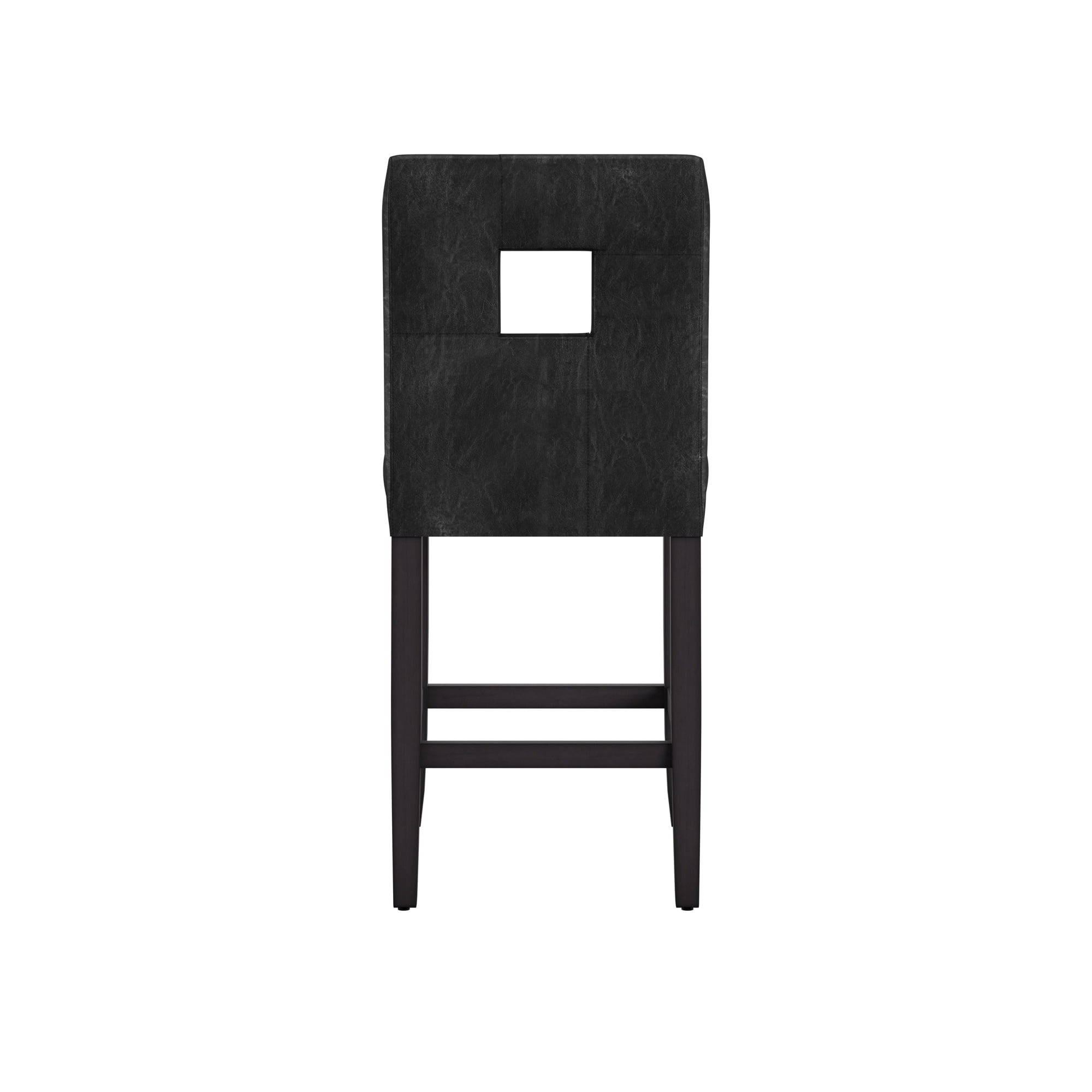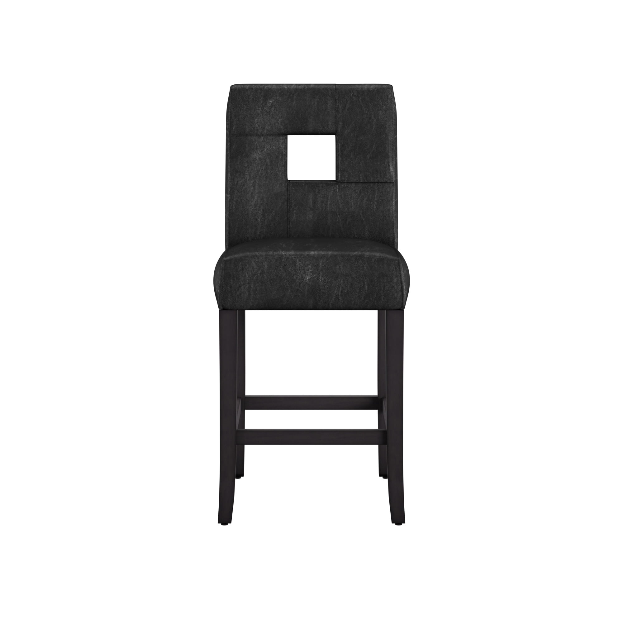 Wood counter stool made from Asian rubberwood Wood finish: black Faux leather upholstery Seat height: 24″H Dimensions: 42″H x 19″W x 23″D 90-day limited warranty Box-shaped cushions Slanting backrests with a keyhole design Flared legs with footrests Set of 2 black counter stools Style and sophistication