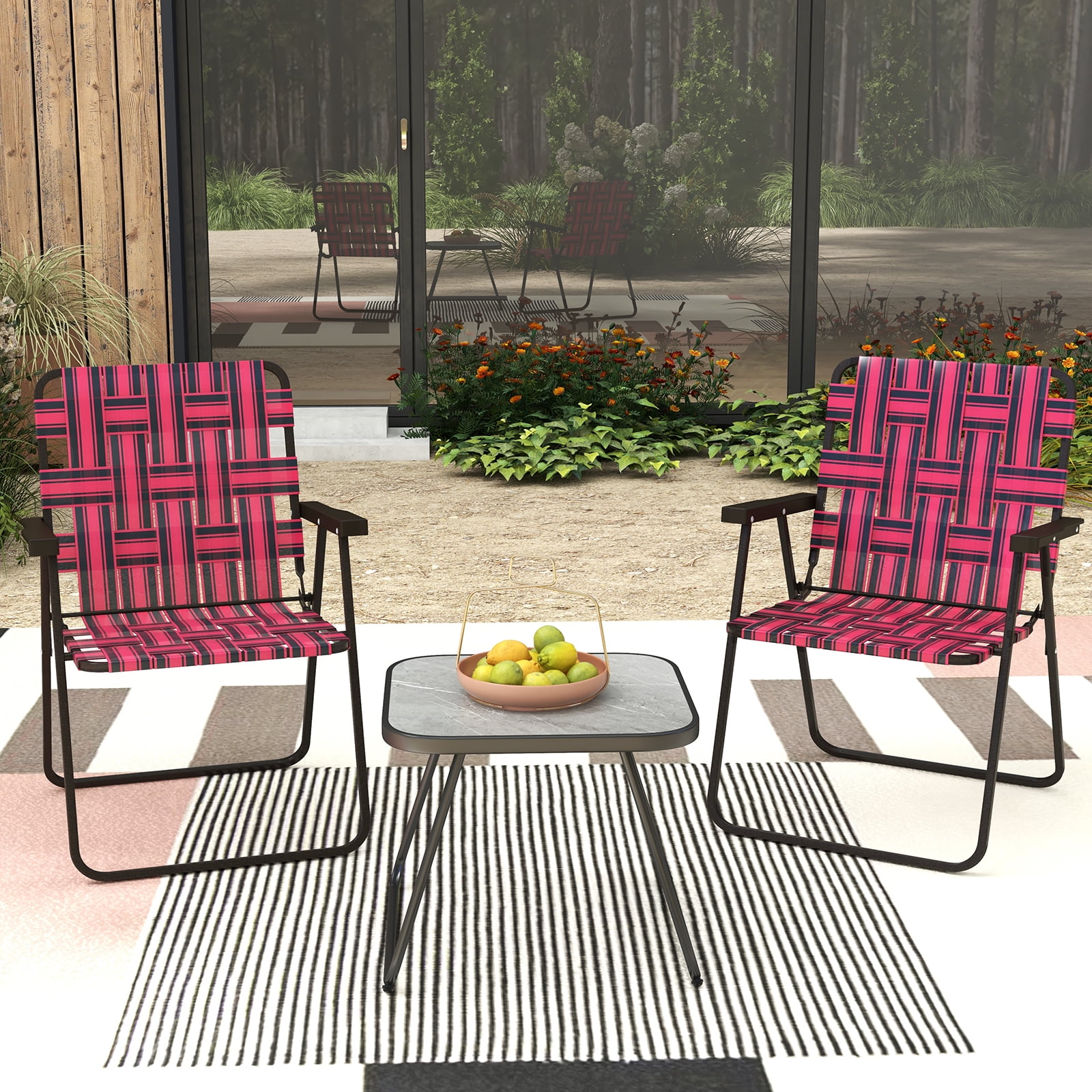 Upgrade your outdoor relaxation with this set of 2 folding webbed lawn chairs! Crafted from heavy-duty metal frame, these folding chairs are perfect for any outdoor setting, from poolside lounging to beachside relaxation. The lightweight and foldable design makes them easy to transport and store, while the comfortable webbed seating ensures hours of relaxation. Besides, the ergonomic backrest and wide armrests offer added comfort and support. Whether you’re hosting a backyard gathering, going camping or picnic, these chairs are a perfect choice. Features Heavy duty metal frame offers steady support and durability Breathable webbed chair back and seat keep you cool on hot days Ergonomic design with slanted backrests and wide armrests Easy to store and carry with lightweight and foldable design Perfect for poolside, lawn, yard, beach or camping trips Specifications: Color:Red Material: PE, Metal Overall Dimensions: 23” x 22.5” x 31” (L x W x H) Folding Dimensions: 29.5” x 22.5” x 3”(L x W x Thickness) Seat Height: 16” Seat Depth: 16” Total Net Weight: 14 lbs Weight Capacity: 330 lbs Package Includes: 2 x Folding Beach Chairs 1 x Instruction