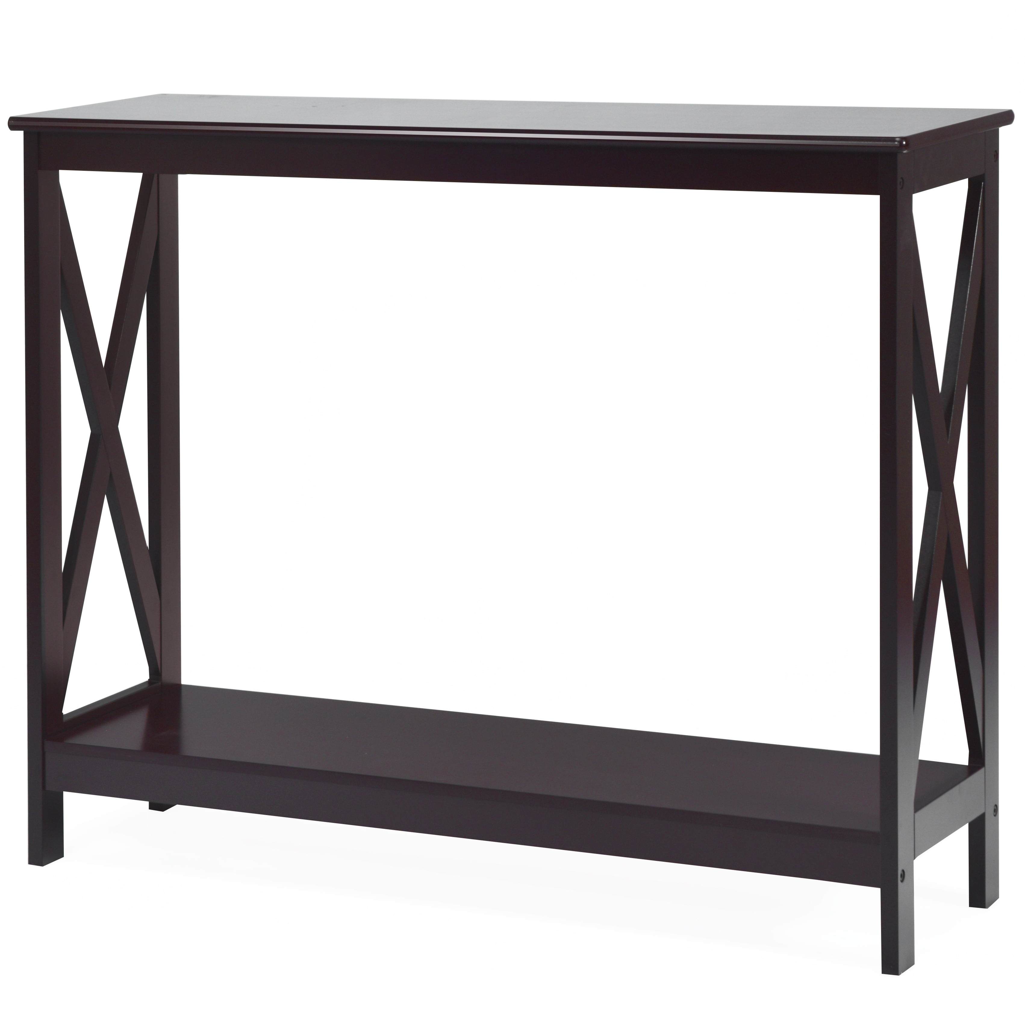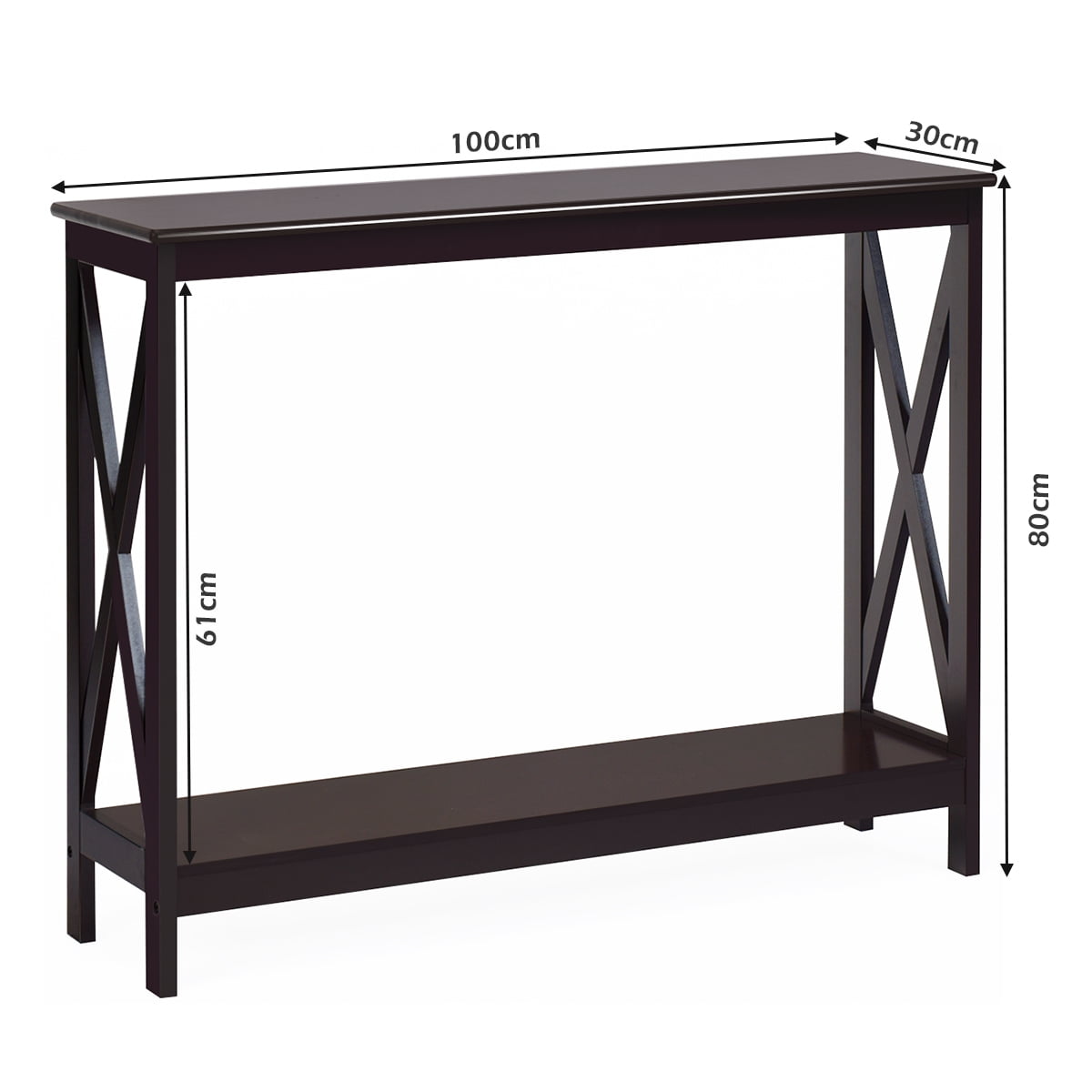 Our elegant console table is crafted from high quality P2 MDF, which is sturdy and long-lasting with a long service life. The X-shaped structures on both sides ensure overall stability without easy shaking. In addition to the spacious tabletop, the lower open shelf provides additional storage space for books, toys or crafts. This console table adopts concise lines and classic finish to create a simple and stylish appearance. It can complement each other with a variety of decoration styles, which is ideal for living room, entryway and hallway! Features Compact size makes it be the ideal storage solution for small spaces Spacious tabletop is suitable for placing tea cups, laptops, albums or vases Open shelf allows you to easily access items without obstacle X-shaped structures on both sides to enhance the whole stability Simple appearance can complement each other with a variety of decoration styles Smooth surface facilitates daily maintenance Specifications: Color: White BlackBrownWood Grain Material: P2 MDF Overall Dimension: 39.5” x 12” x 31.5” (W x D x H) Net Weight: 22 lbs Weight Capacity of Tabletop: 66 lbs Weight Capacity of Shelf: 33 lbs Package includes: 1 x 2-tier Console Table 1 x Instruction
