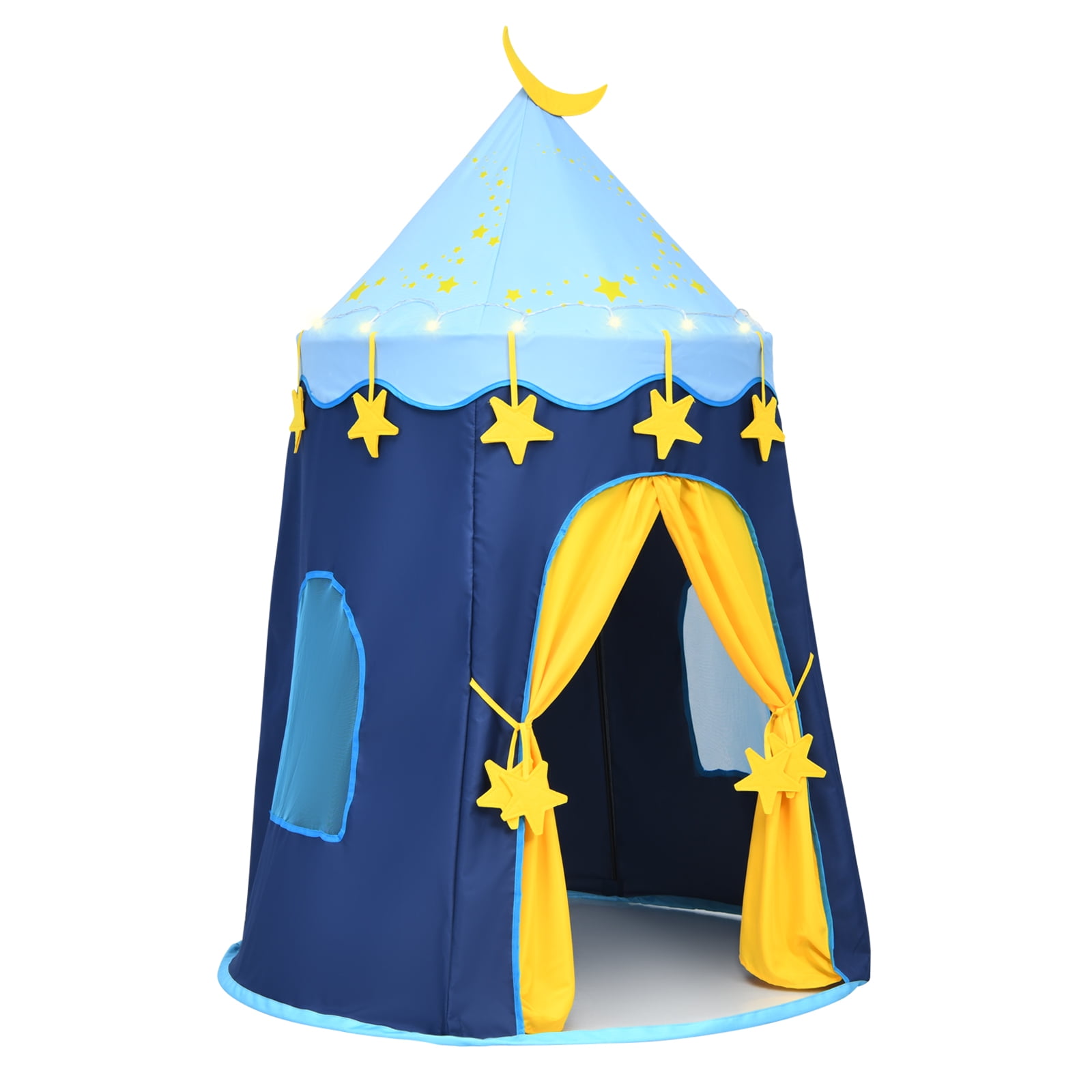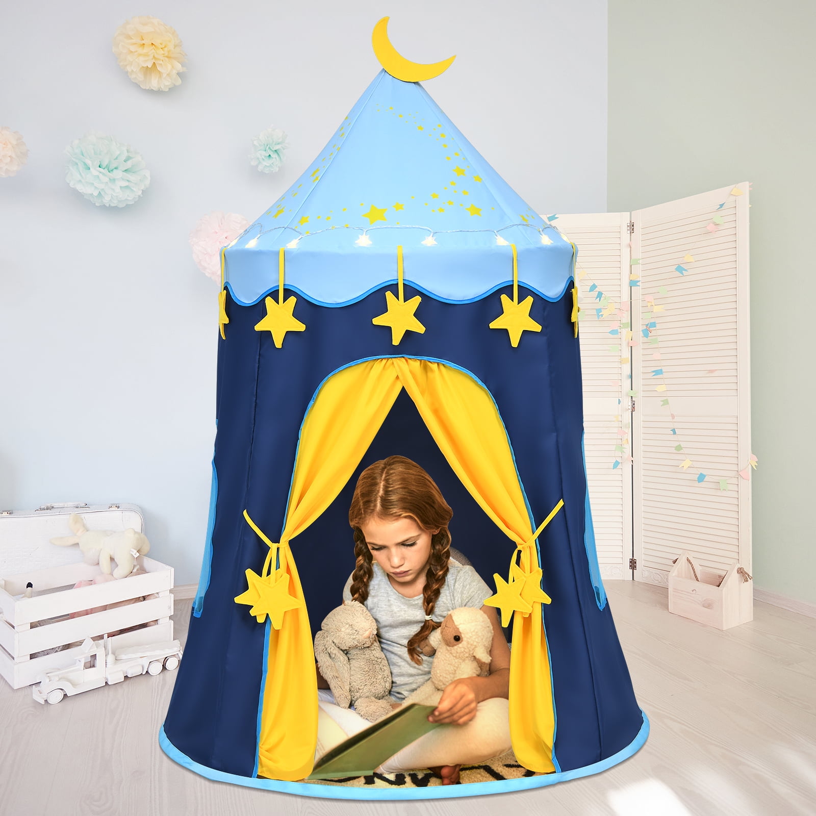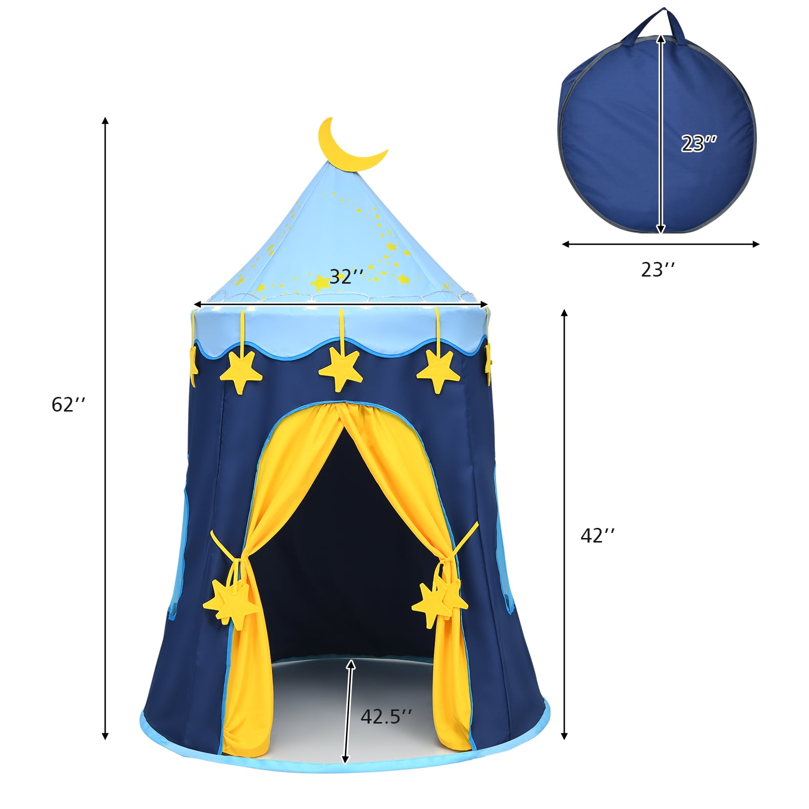 Whether you’re looking for nice present for your child or for a friend’s child or a relative, this play tent is the ideal gift that will not only put a smile on their teeny tiny faces, but also their parent as well! Made of sturdy Oxford cloth and sturdy fiberglass rods, the kids play tent is nontoxic and ensures kids’ safety. Lovely appearance like moon and star decoration is popular with kids. Star shaped string lights create warm atmosphere to illuminate kids’ dream. Besides, foldable and lightweight design is suitable for indoor and outdoor, as well as saves your space when not in use. There is enough space in the tent to accommodate many children, so that your children and friends can leave happy memories here. Features sturdy Oxford cloth is friendly to kids Sturdy fiberglass robs provide strong support Mesh windows facilitate the circulation of air Lovely appearance adds a hint of cuteness to your home Pop up design for convenient movement Easy for assembly and maintenance Specifications Color: Blue + Yellow Material: Fiberglass rods, Oxford Cloth Overall Dimensions: 42.5” x 42.5” x 62” (L x W x H) Net Weight: 4 lbs Star String Light Length: 59” Suitable Age: Over 3 years old Package includes: 1 x Kids Play Tent 1 x Star String Light 1 x User’s Manual
