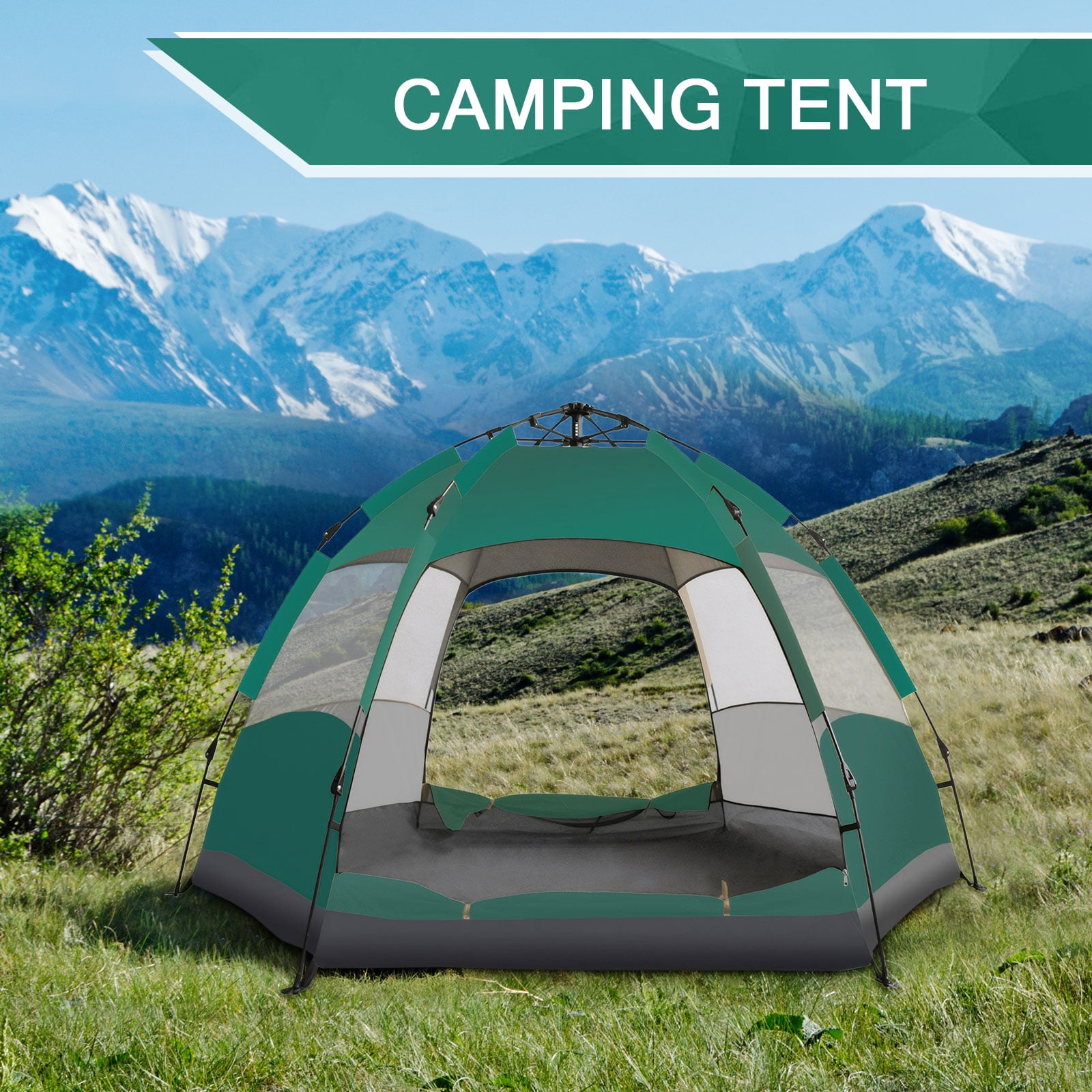 TOPCHANCES 4 Person Camping Tent with Rainproof Cover HighQuality Materials: Constructed with 170T silver tape PU coating for the external tent, 210D oxford cloth for the bottom, and thickened glass fiber for the frame, ensuring excellent sun protection, wind resistance, and water resistance Spacious Design: Measures 94.5 x 78.7 x 53 inches, accommodating 34 people comfortably. Weighs approximately 3.5kg (7.7lbs) and includes a carry bag for easy transport and storage Automatic Setup: Features an automatic popup mechanism that allows for quick setup in just three seconds. Simply lift and pop the top mechanism down for effortless assembly Durable and UV Resistant: The sturdy fiberglass pole is designed for wind resistance, while the tarpaulin made of 170T polyester and 210D oxford cloth provides superior UV protection and waterproofing Enhanced Ventilation: Equipped with 2 doors and 2 windows for optimal airflow. Includes 8 ground nails and 4 windproof ropes for added stability and security in windy conditions