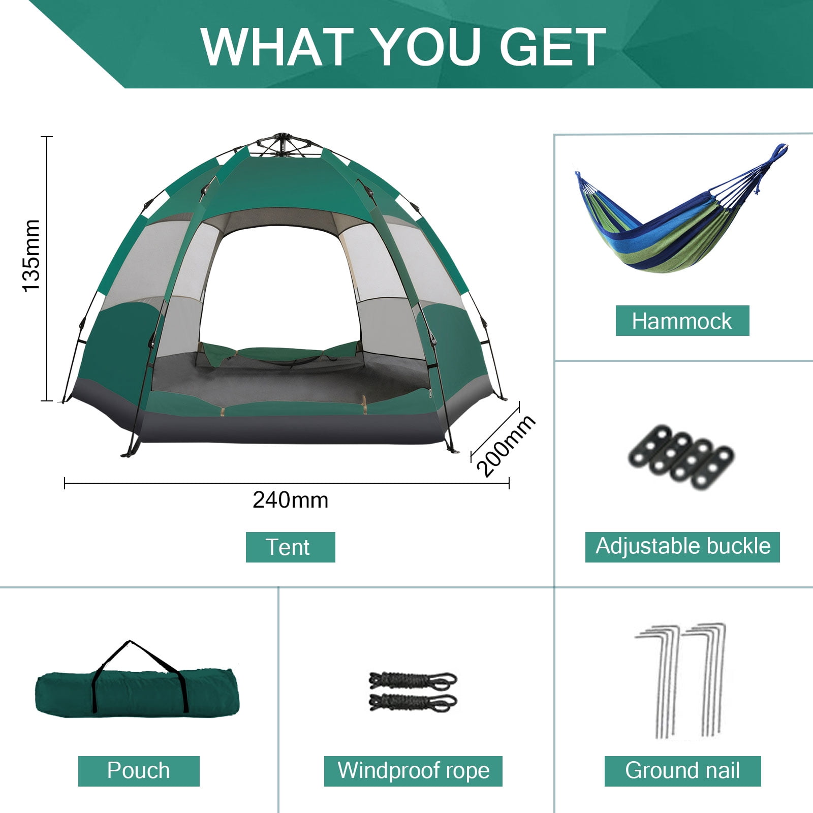 Free Build 3-4 People Fully Automatic Pop-up Tent Family Picnic Travel Rainproof Windproof It is ideal for family camping, beach, picnic, backyard and other outdoor activities. Specification: Name: Automatic Pop-up Tent Design: Camping Tent Tent Material: 170T Polyester with Silver Coating, 210D Oxford Cloth Tent Expand Size: 94.5×78.7x53inch (240x200x135cm) Hammock Size: 74.8×31.5inch (190x80cm) Product Weight: Approx. 3.5kg Applicable Number of People: 3-4 People Function: UV Protection, Moisture Proof, Waterproof, Portable Seasons: All Seasons Package Included: 1 x Tent 1 x Hammock 8 x Ground Pegs 4 x Windproof Ropes 1 x Carry Bag Note: 1. Please allow 0.5-1cm differences due to manual measurement. 2. Due to the light and screen difference, the item’s color may be slightly different from the pictures.