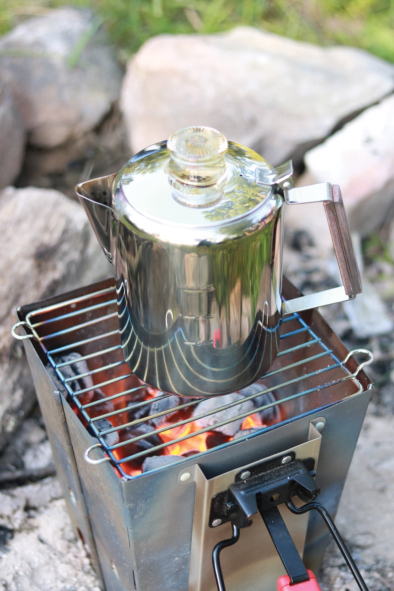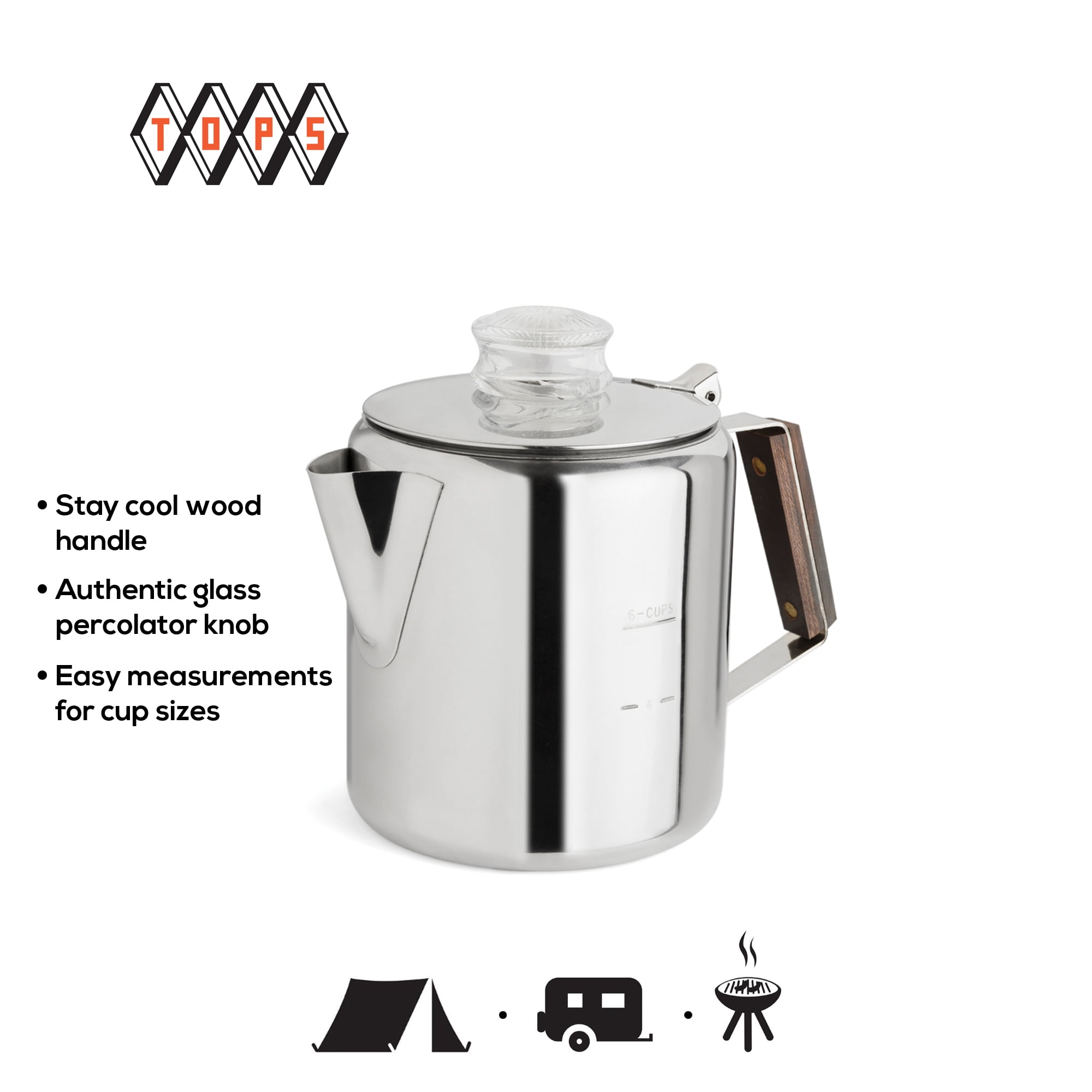 Perfect percolators! The Rapid Brew Stovetop Percolator makes 2-6 cups of fresh-perked coffee fast, easy and full of flavor. The perking process allows exact brew strength control, so it’s a treat for coffee lovers everywhere. The percolator body, cover and spreader plates are constructed of sparkling, high-luster heavy gauge 18/8 stainless steel. It features a clear glass cover knob for easy observing of brew strength and a laminated Permawood handle with natural woodgrain beauty and brass-rivet quality. Also includes an aluminum pump and basket, and for exact measurements, the percolator features permanent cup markings. This coffee maker is non-electric, so it’s perfect for camping. Great looking and great tasting! The best way to start your morning.