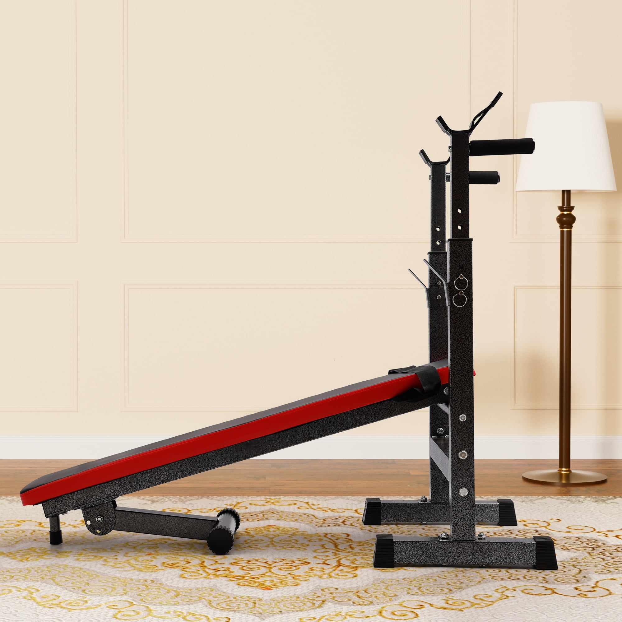 Begin your fitness journey with our versatile and multifunctional weight bench, designed to support a comprehensive full-body workout. Whether you’re targeting your arms, legs, or chest, this bench is perfect for a range of exercises, including sit-ups, pull-ups, and weightlifting. The adjustable height settings and cushioned pads provide exceptional comfort and support, allowing you to maximize your training sessions. Its foldable design offers convenient storage and portability, making it easy to exercise wherever and whenever you choose. Start transforming your body with confidence today! Our weight bench is crafted for durability and stability, featuring a robust steel frame that can support up to 440 lbs. It comes equipped with anti-slip rubber foot pads to protect your floors and ensure a stable workout experience. The bench also includes five adjustable positions to customize your workout to your needs, enhancing your posture and comfort with a high-density foam-padded surface. Easy to assemble with all necessary hardware and instructions provided, this bench is ready to use in no time. Please note, dumbbells are not included. For any issues, our dedicated customer service team is here to assist you. Specifications: Color: Black+Red Main Material: Iron Overall Dimensions: 46.5″ (L) x 22″ (W) x 41.7″ (H) Net Weight: 33 lbs Load Capacity: 440 lbs Adjustable Height: 35″ – 43″ Package Includes: 1 x Weight Bench