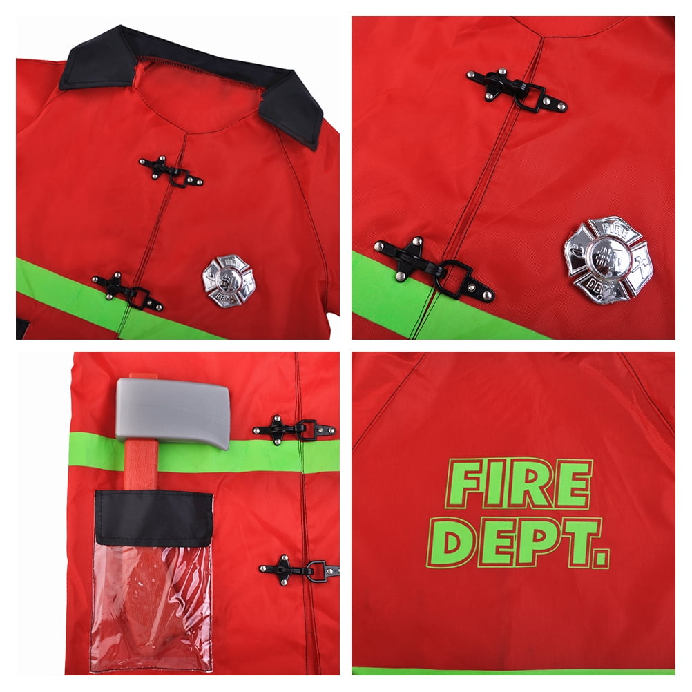 Products include: Police officer Costume set, Fire chief costume set. Material: polyester, nylon and plastic Product includes: *Fire chief costume set: firefighter jacket, hat, fire extinguisher, hose, walkie-talkie, shiny badge and plastic axe *Police officer costume set: uniform jacket, cop hat, whistle, handcuffs, key, walkie-talkie. One Size fits most (Recommend Age: 3 to 6 years old): Fire Chief Costume: Garment length: Approx. 24 inch (61m) Garment Chest Circumference: Approx. 33.8 inch (86cm) Police Officer Costume: Garment length: Approx. 20.4 inch (52cm) Garment Chest Circumference: Approx. 30.3 inch (77cm)