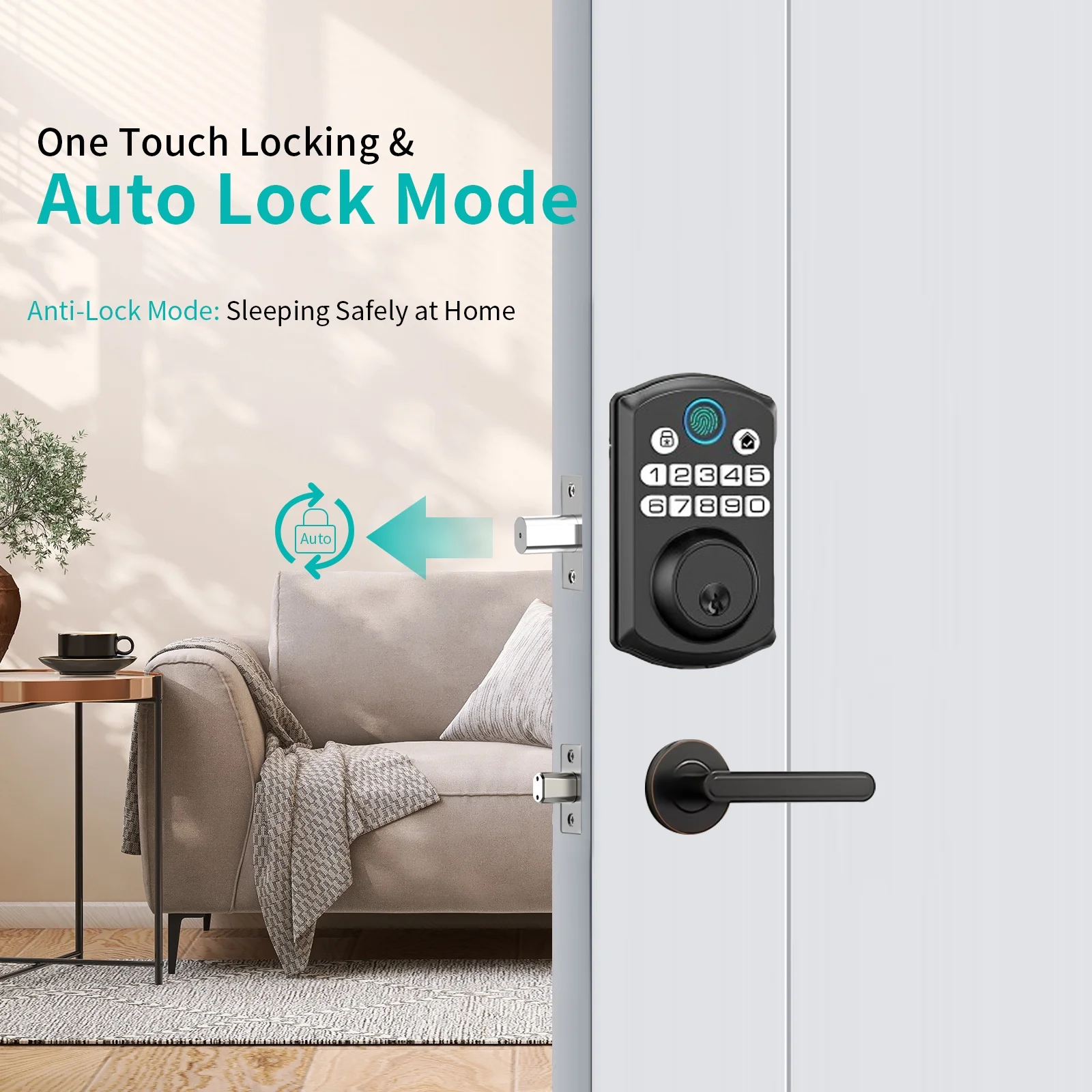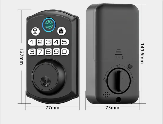 Offers three ways to unlock your door: fingerprint, password, and key Fingerprint unlock can identify your fingerprint within 0.3 seconds and unlock your door within 1 second Stores up to 50 fingerprints and 50 passwords, allowing you to set different access codes for your family members Lock system will be locked for 1 minute if the wrong password or fingerprint is entered five times IP54 waterproof and operates well in temperatures from -20° F to 60° F Suitable for all American standard left and right-handed doors Can be installed with a screwdriver in a few minutes Powered by 4pcs AA batteries which can provide 10800 openings (approx.18 months) Electronic lock will remind you to replace the battery when it’s low